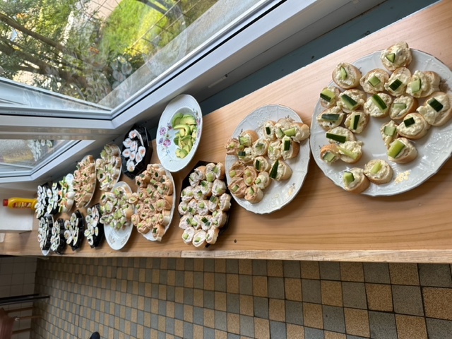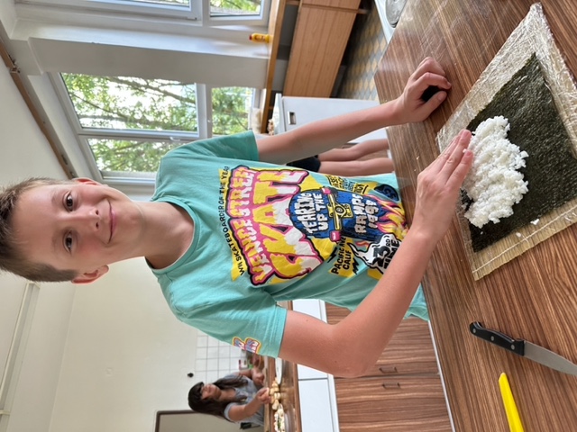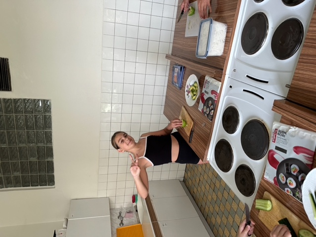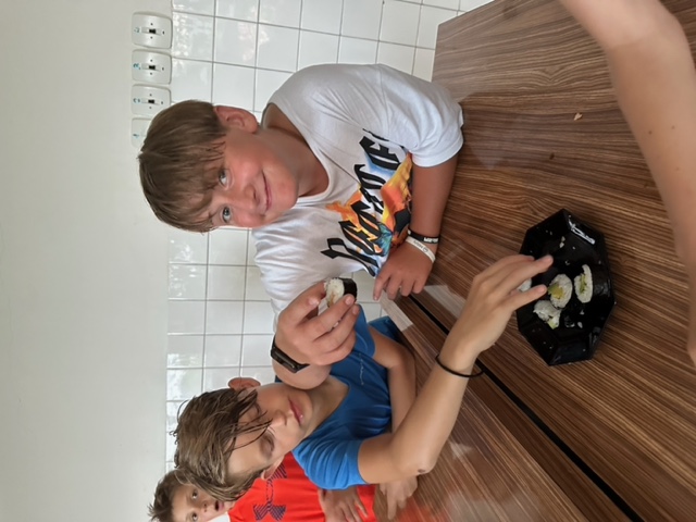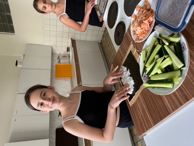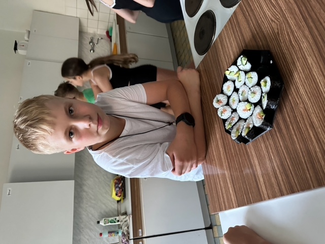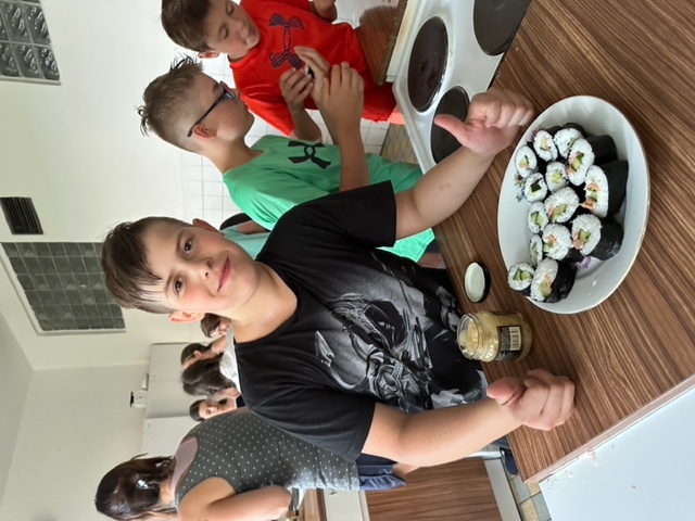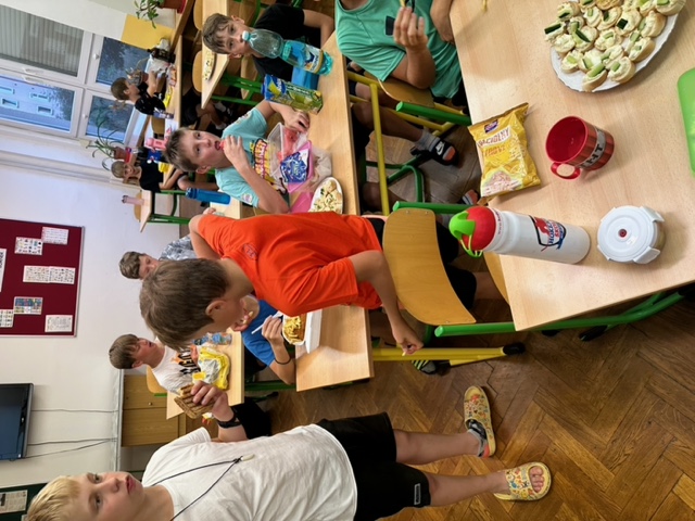 Třída 5.B přespala ze čtvrtka 22. června na pátek 23. června ve škole J Žáci nejdříve společně našli části šifry a rozluštili vzkaz, který je zavedl do školní kuchyňky, kde si sami připravili sushi (paní učitelka a paní asistentka jen uvařily předem rýži, vše ostatní bylo na dětech), a také jednohubky. U přípravy se prostřídali a zabavili se také hraním vybíjené.