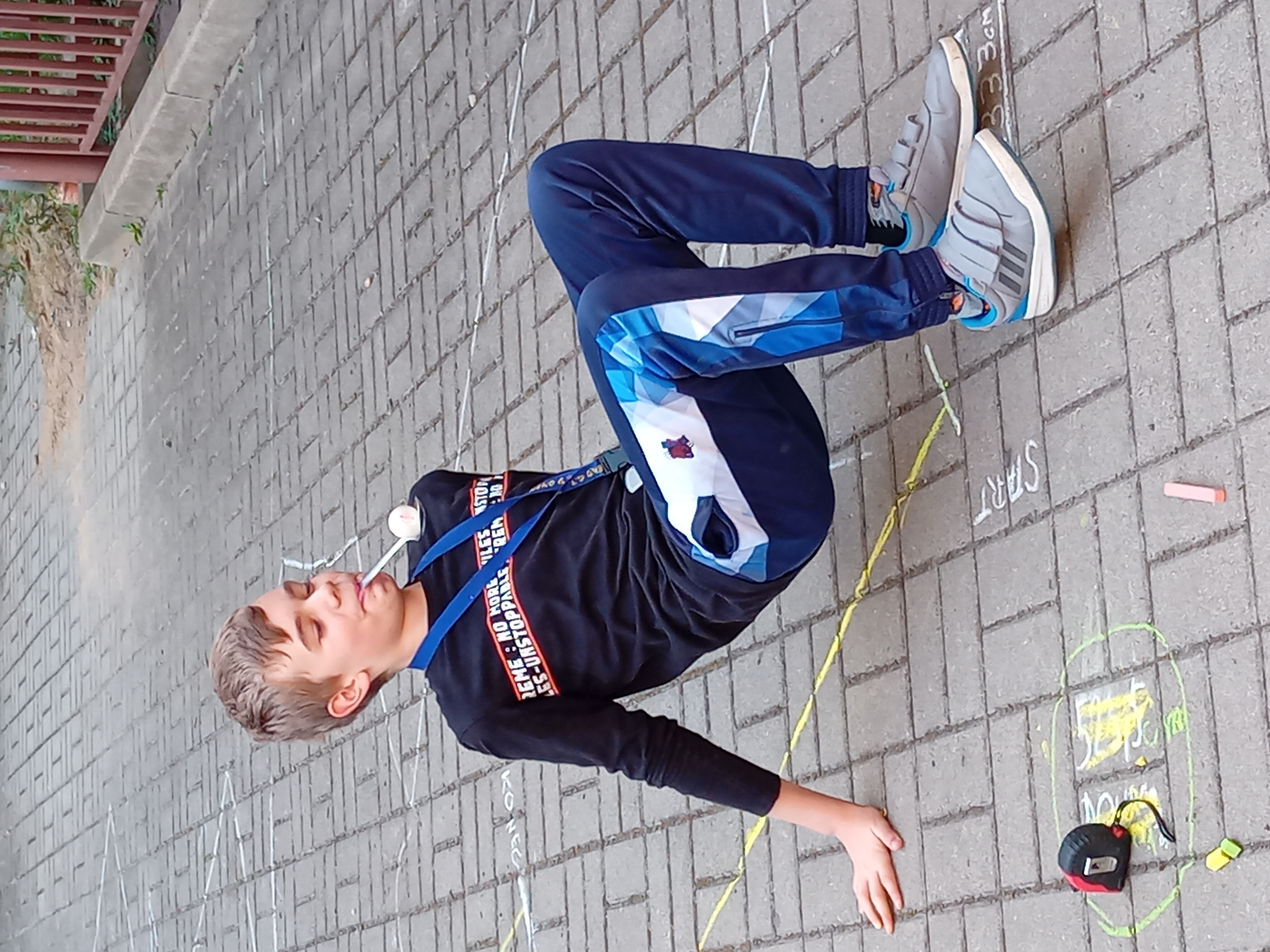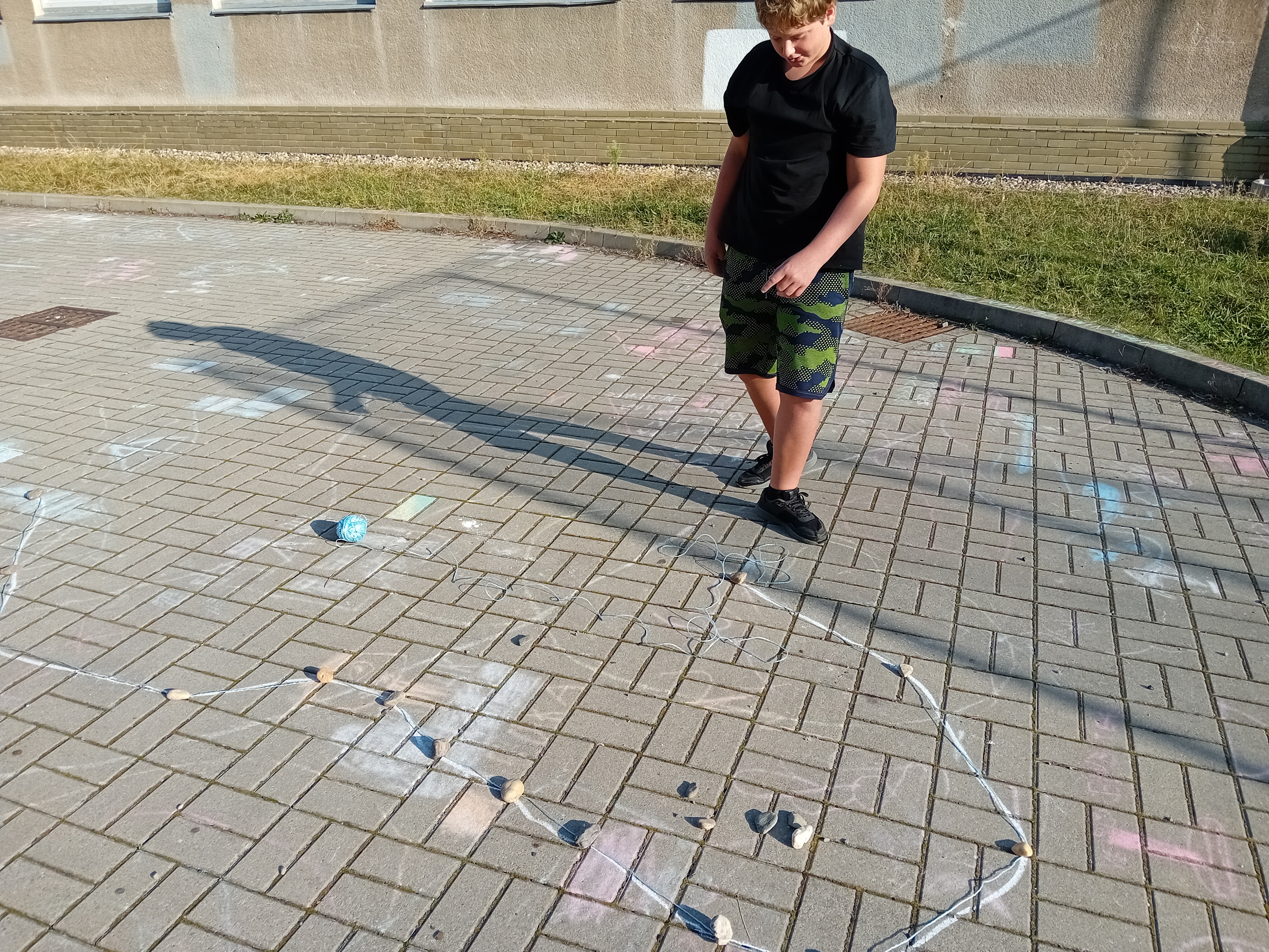 Ve dvojicích si žáci nakreslili křivočaré trajektorie a pak po nich zkoušeli chodit různými druhy chůze. Měřili čas a počítali svou rychlost. Prošli se normální chůzí, běhali co nejrychleji, ale také vymysleli různé kuriozity. Takže jsme viděli např. skákání po jedné noze, chůzi poslepu, pozadu, nebo kombinaci všeho dohromady.