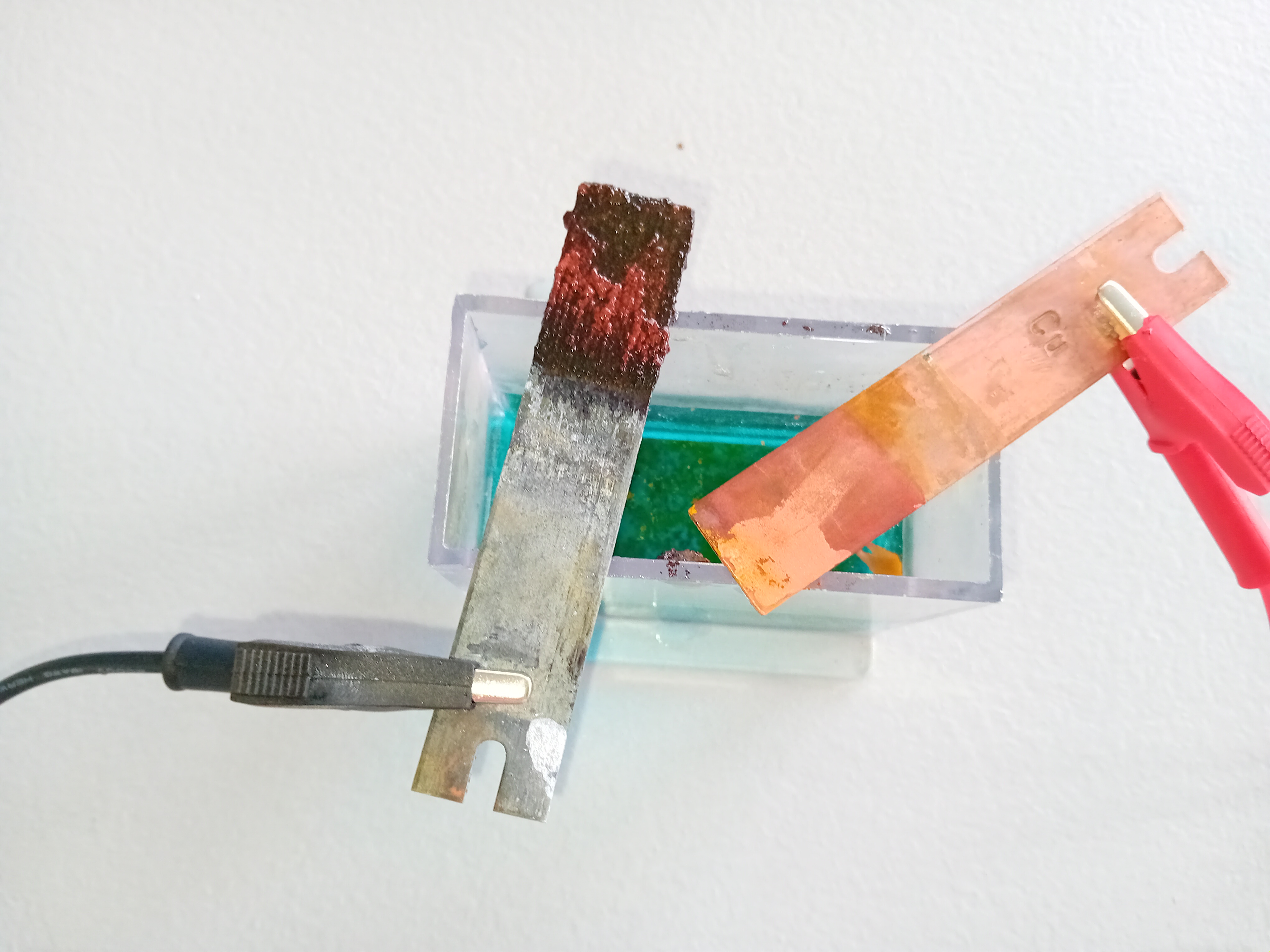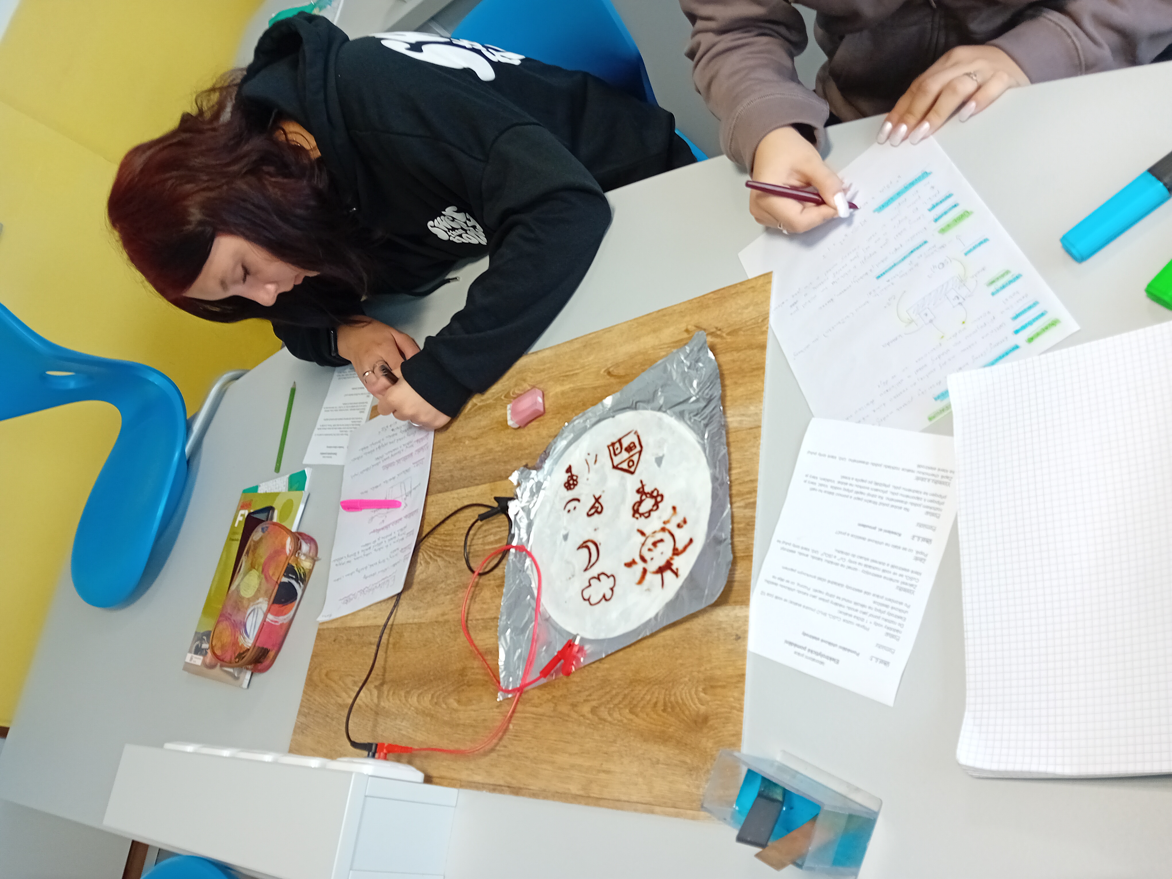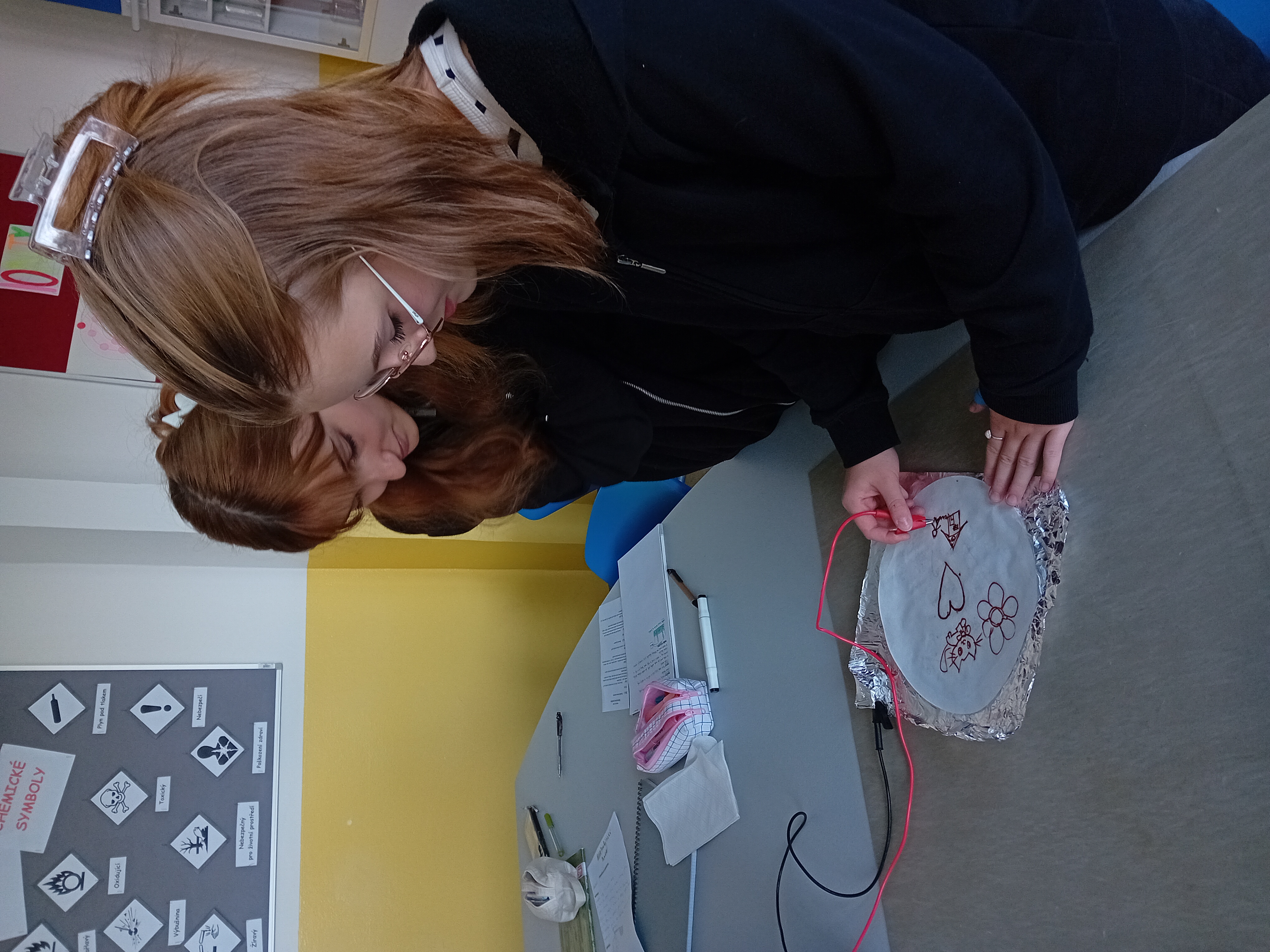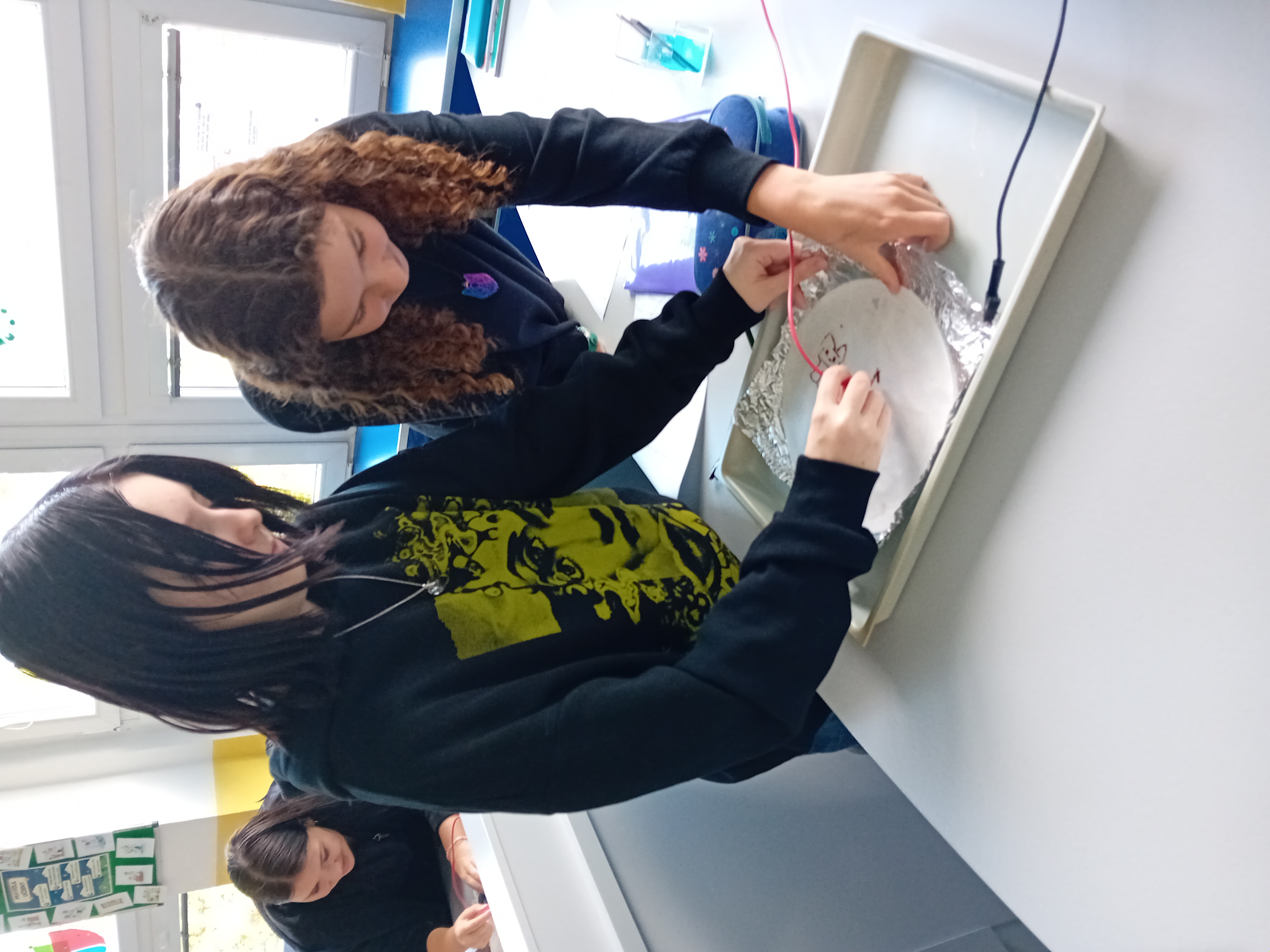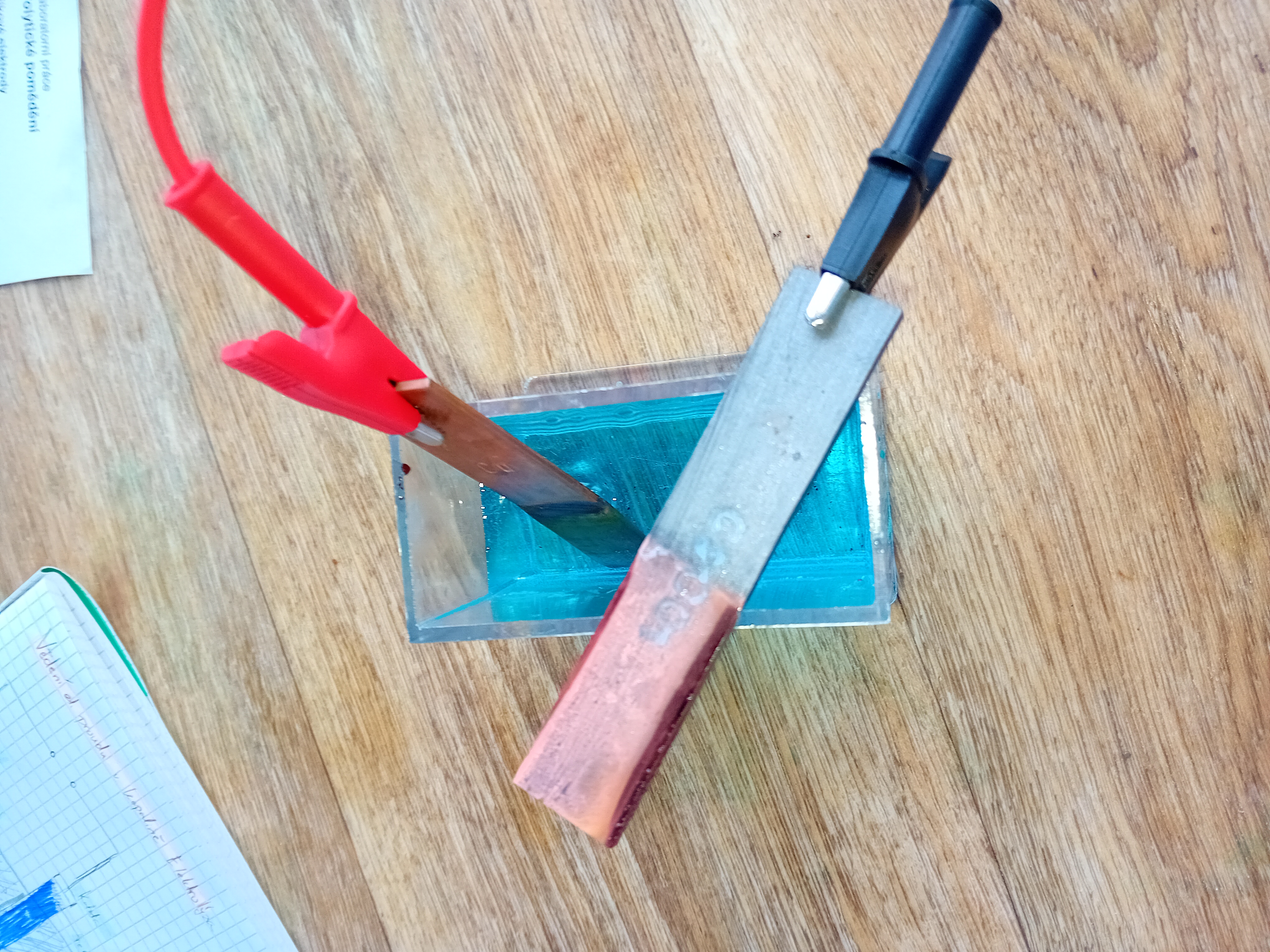 Deváťáci si při fyzice zopakovali vedení proudu v kapalinách. Sestavili vše potřebné pro elektrolýzu a povedlo se jim úspěšně potáhnout uhlíkovou destičku mědí. Nakonec si vyzkoušeli, že i elektrickým proudem je možné kreslit obrázky.