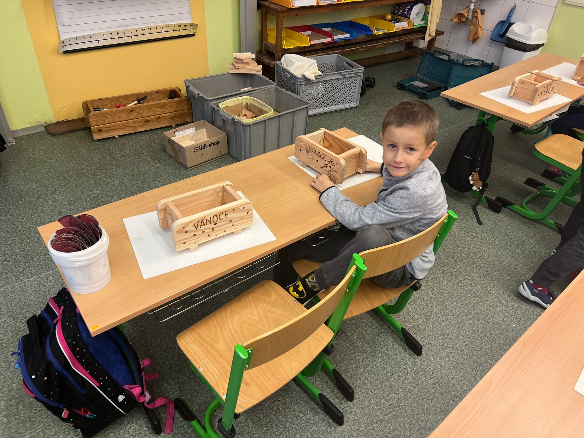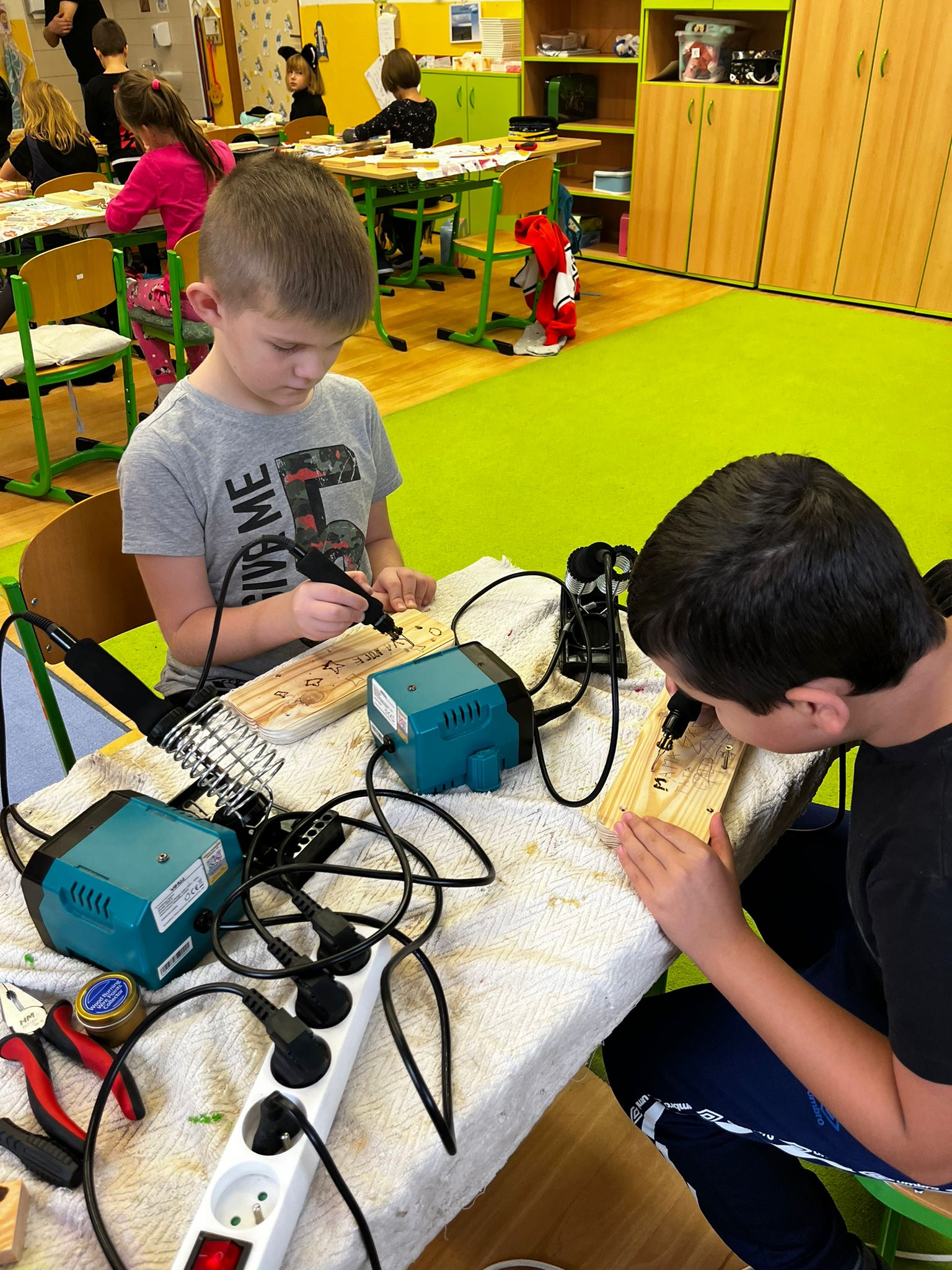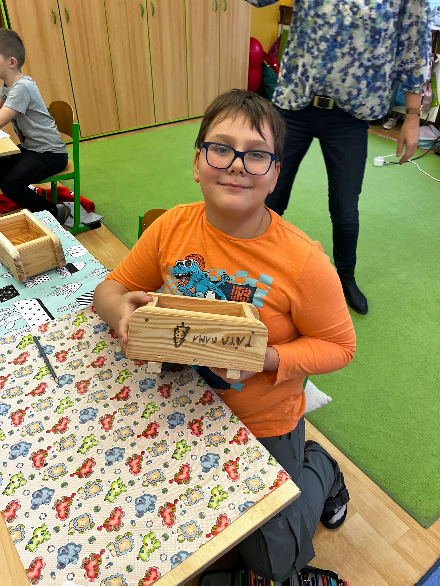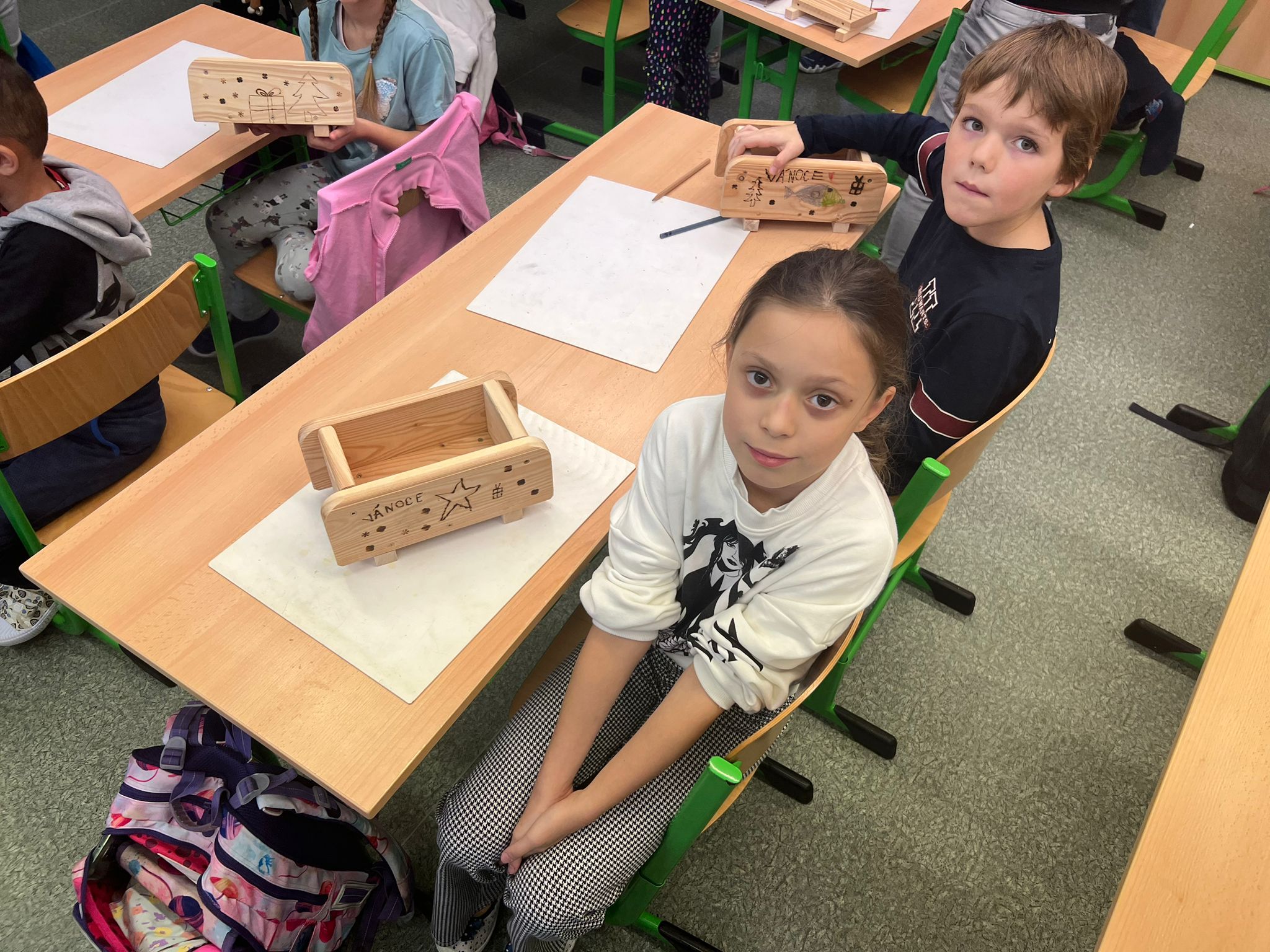 Žáci si vyrobili krásný dřevěný truhlík. Používali kladivo, šroubovák, akušroubovák, hřebíky, šrouby a dřevěné tyble. Obrázek na své truhlíky si pak vypálili pomocí speciální pájky.