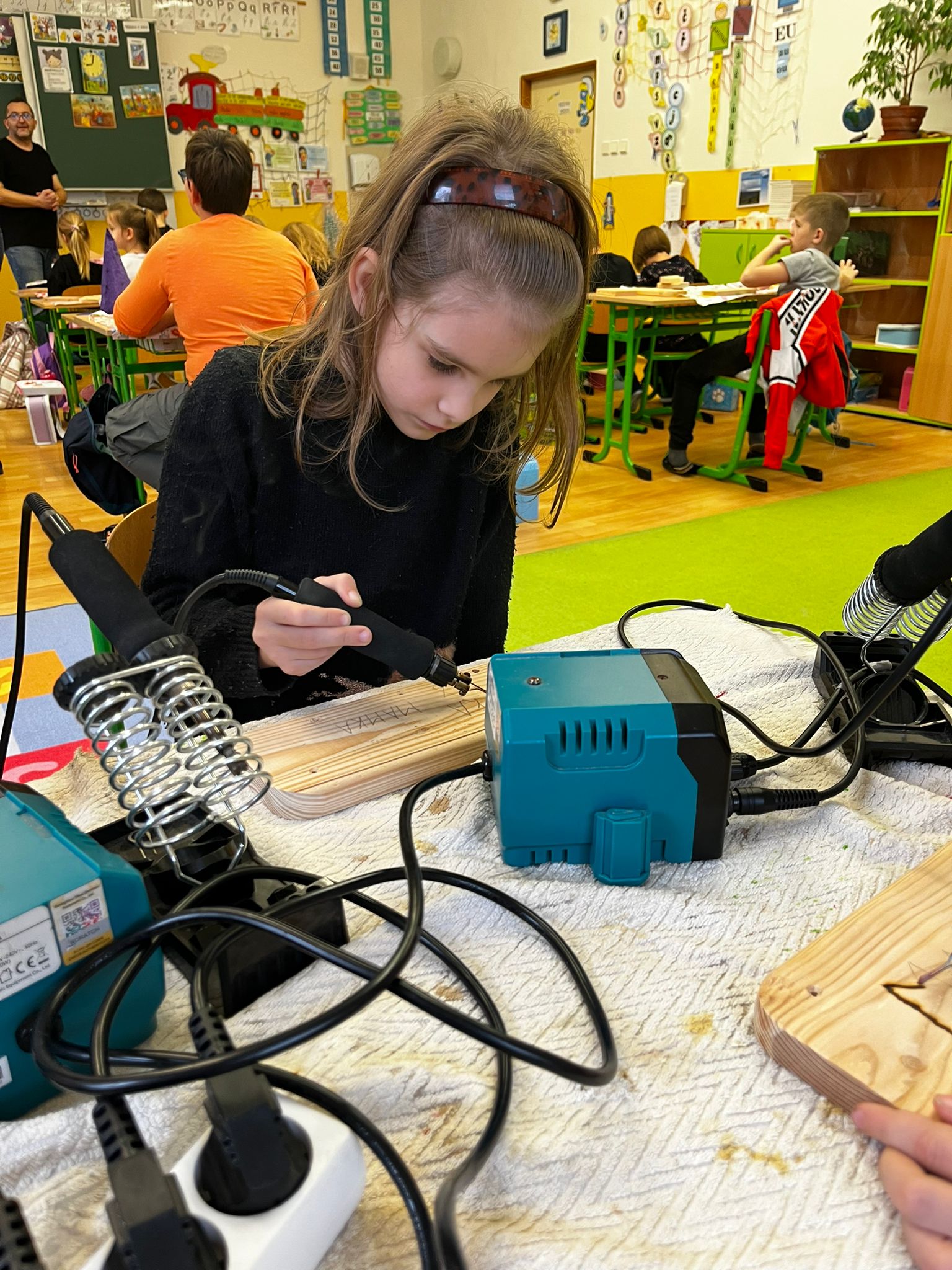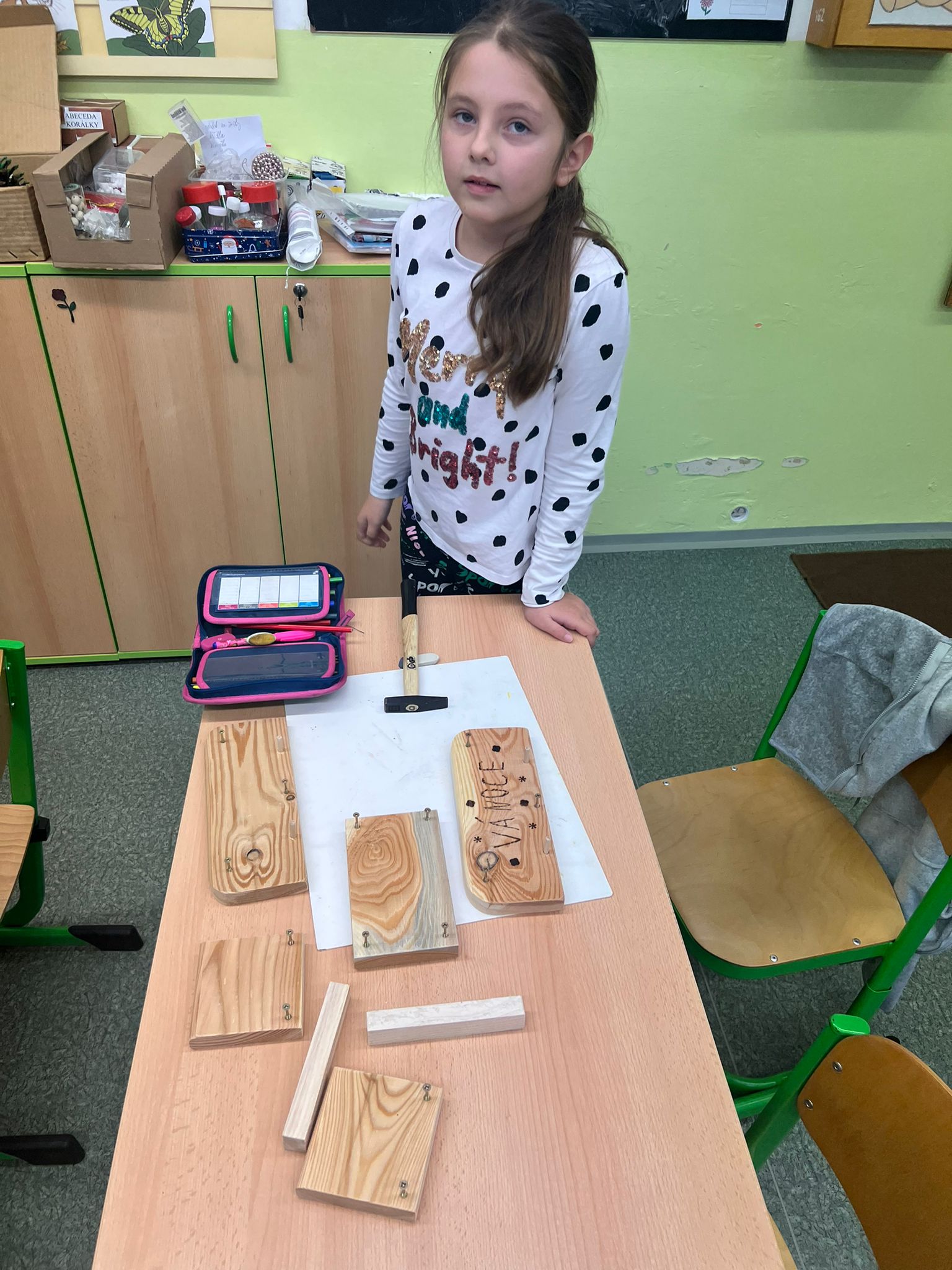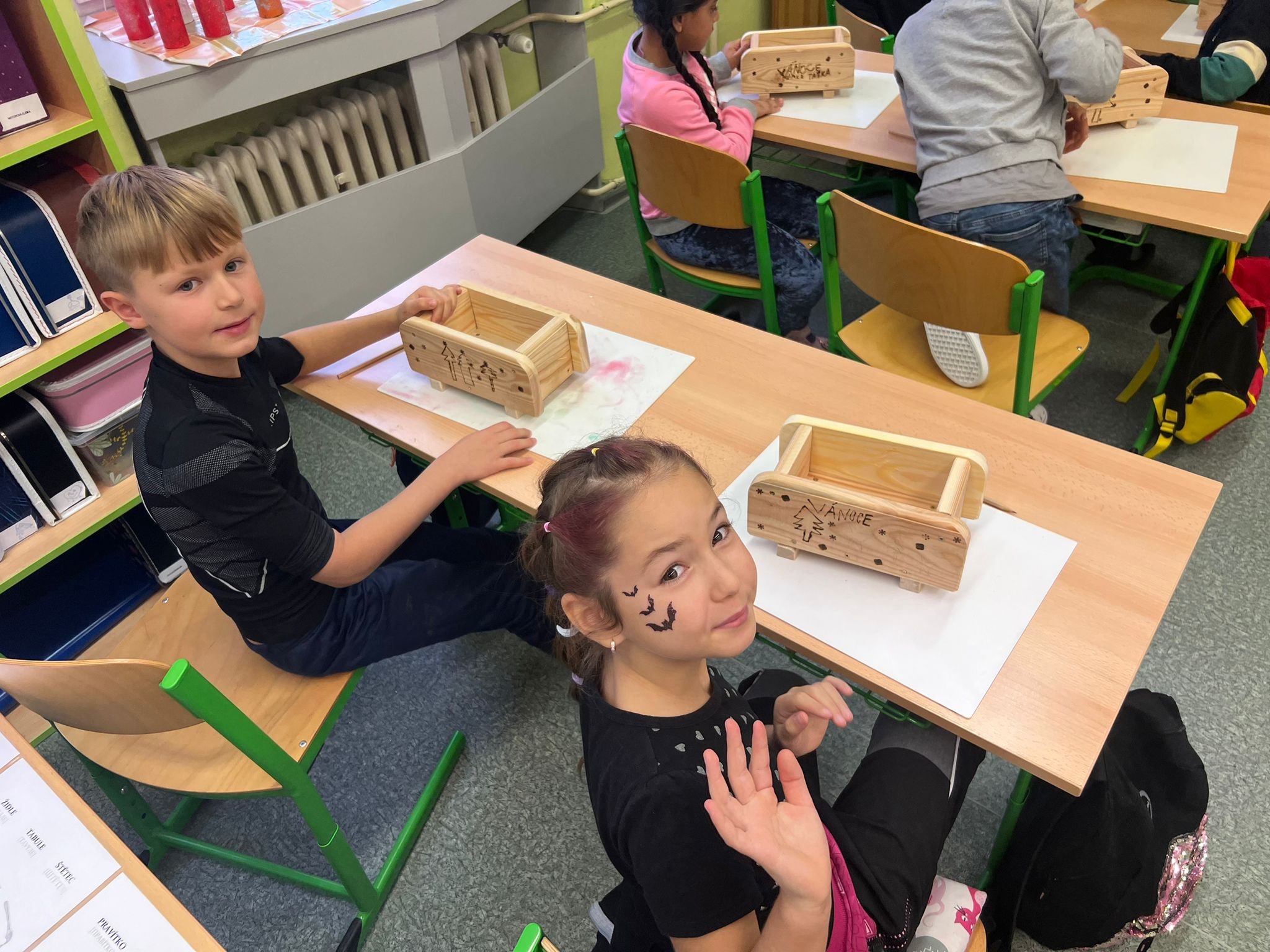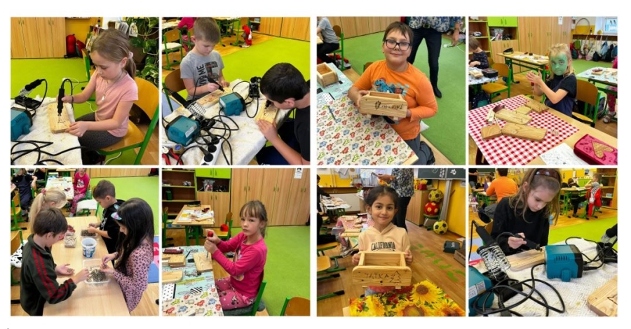 Žáci si vyrobili krásný dřevěný truhlík. Používali kladivo, šroubovák, akušroubovák, hřebíky, šrouby a dřevěné tyble. Obrázek na své truhlíky si pak vypálili pomocí speciální pájky.