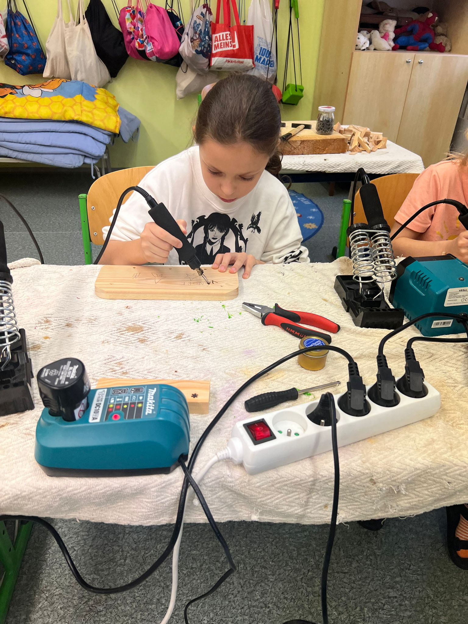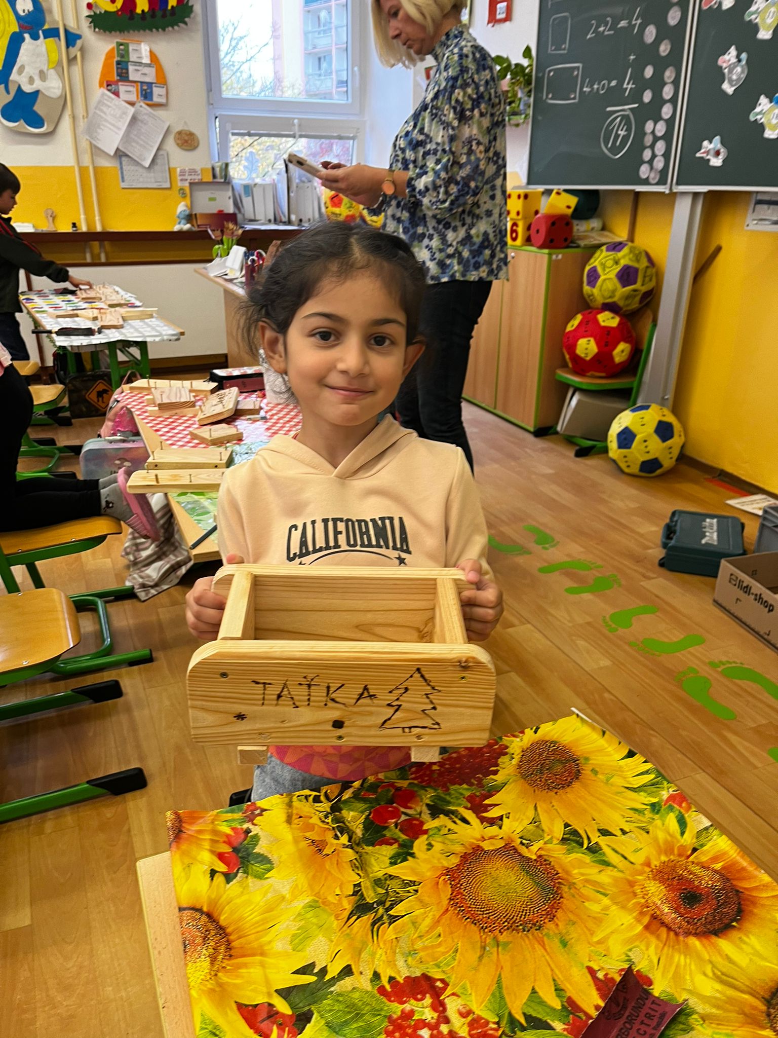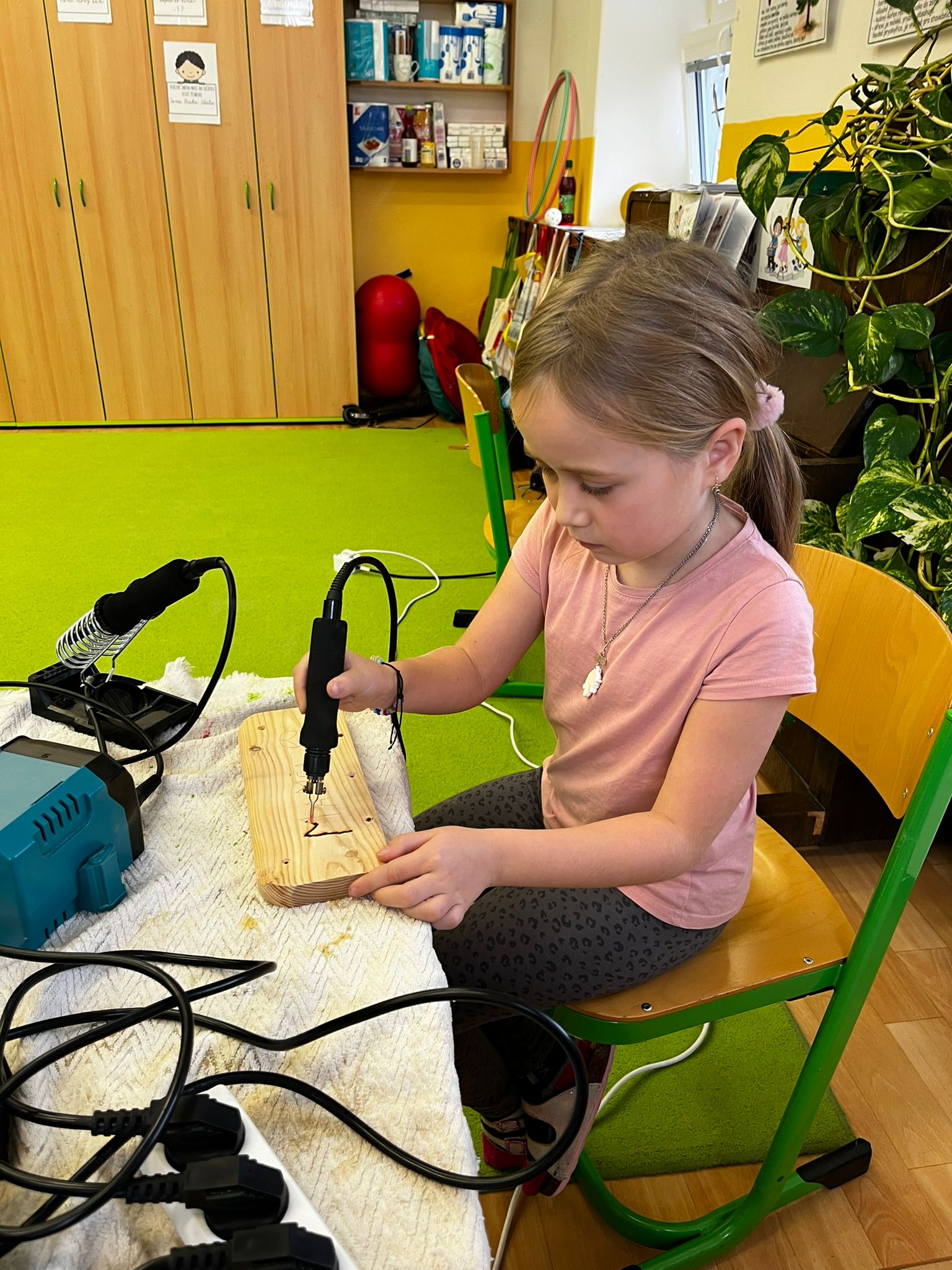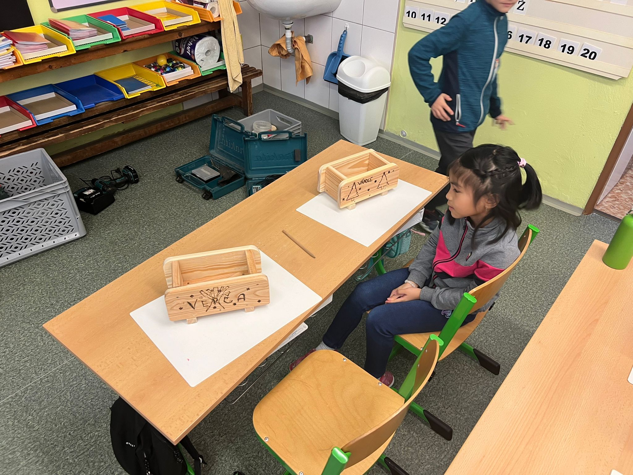 Žáci si vyrobili krásný dřevěný truhlík. Používali kladivo, šroubovák, akušroubovák, hřebíky, šrouby a dřevěné tyble. Obrázek na své truhlíky si pak vypálili pomocí speciální pájky.