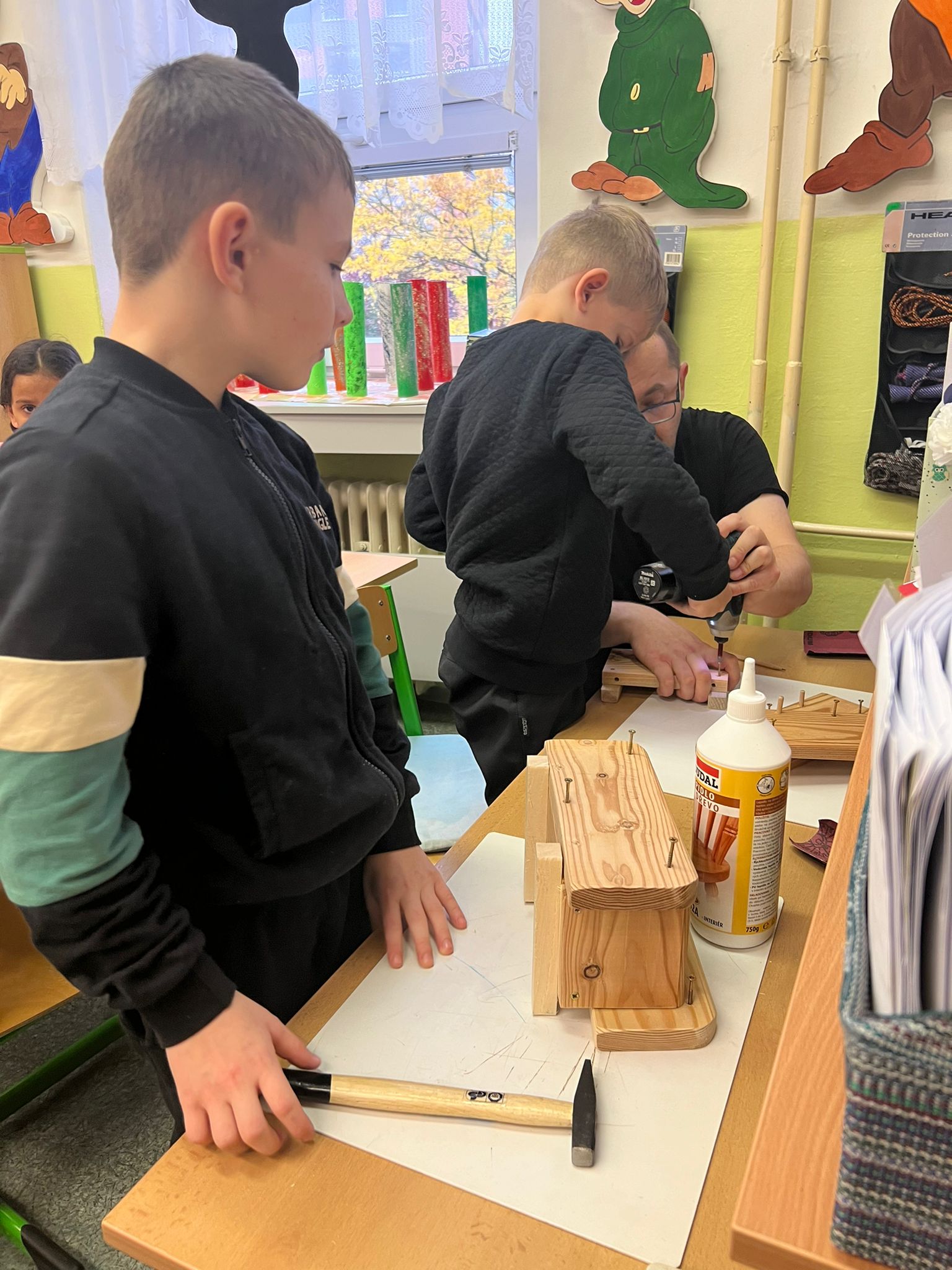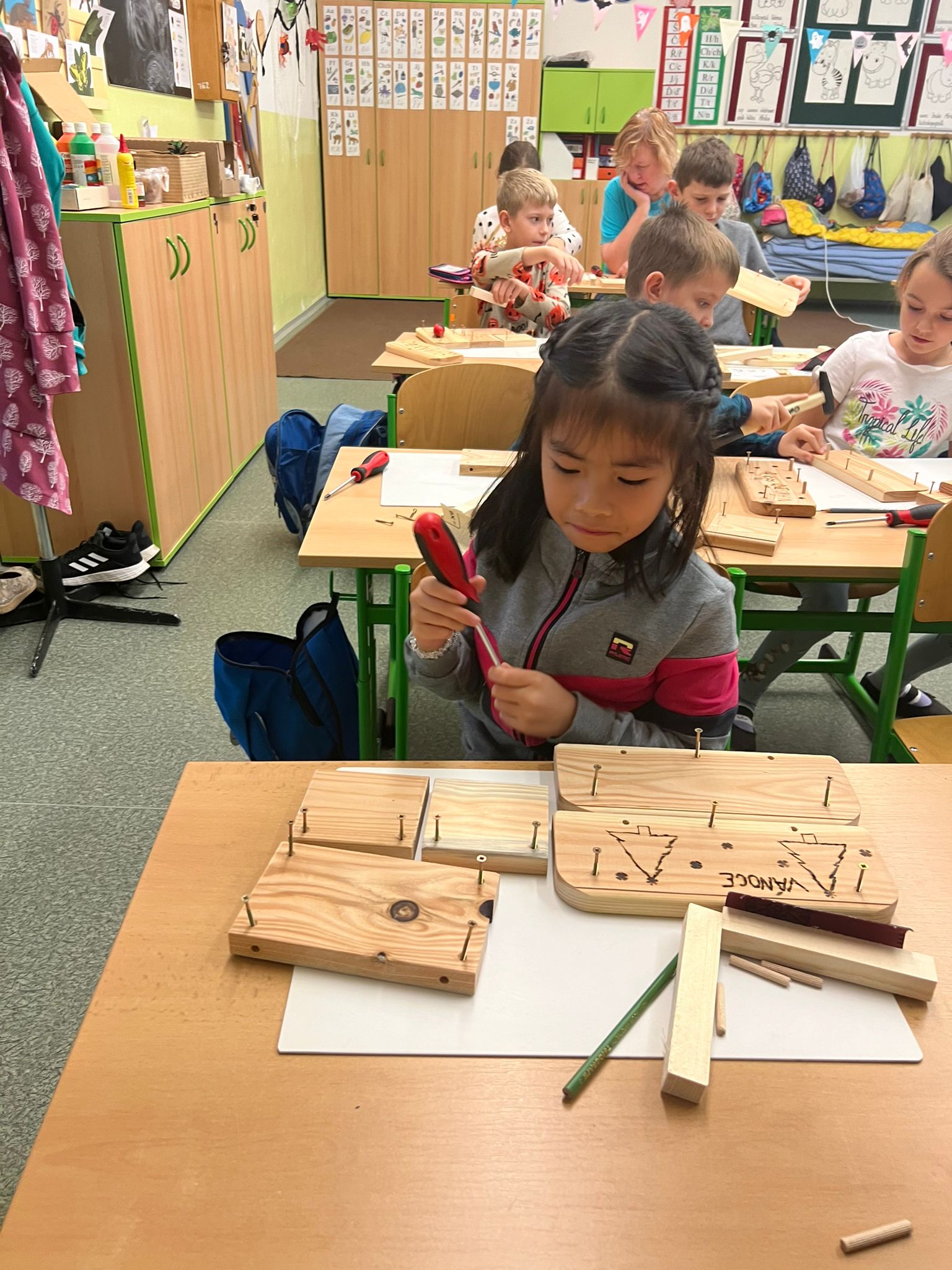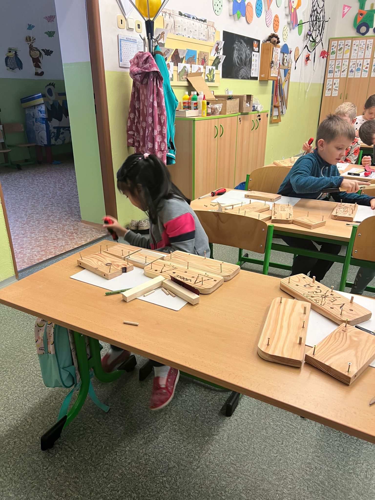 V pátek 3. 11. 2023 si děti ze tříd 2. A a 2. B zahrály pod vedením pana truhláře na malé truhláře a truhlářky.