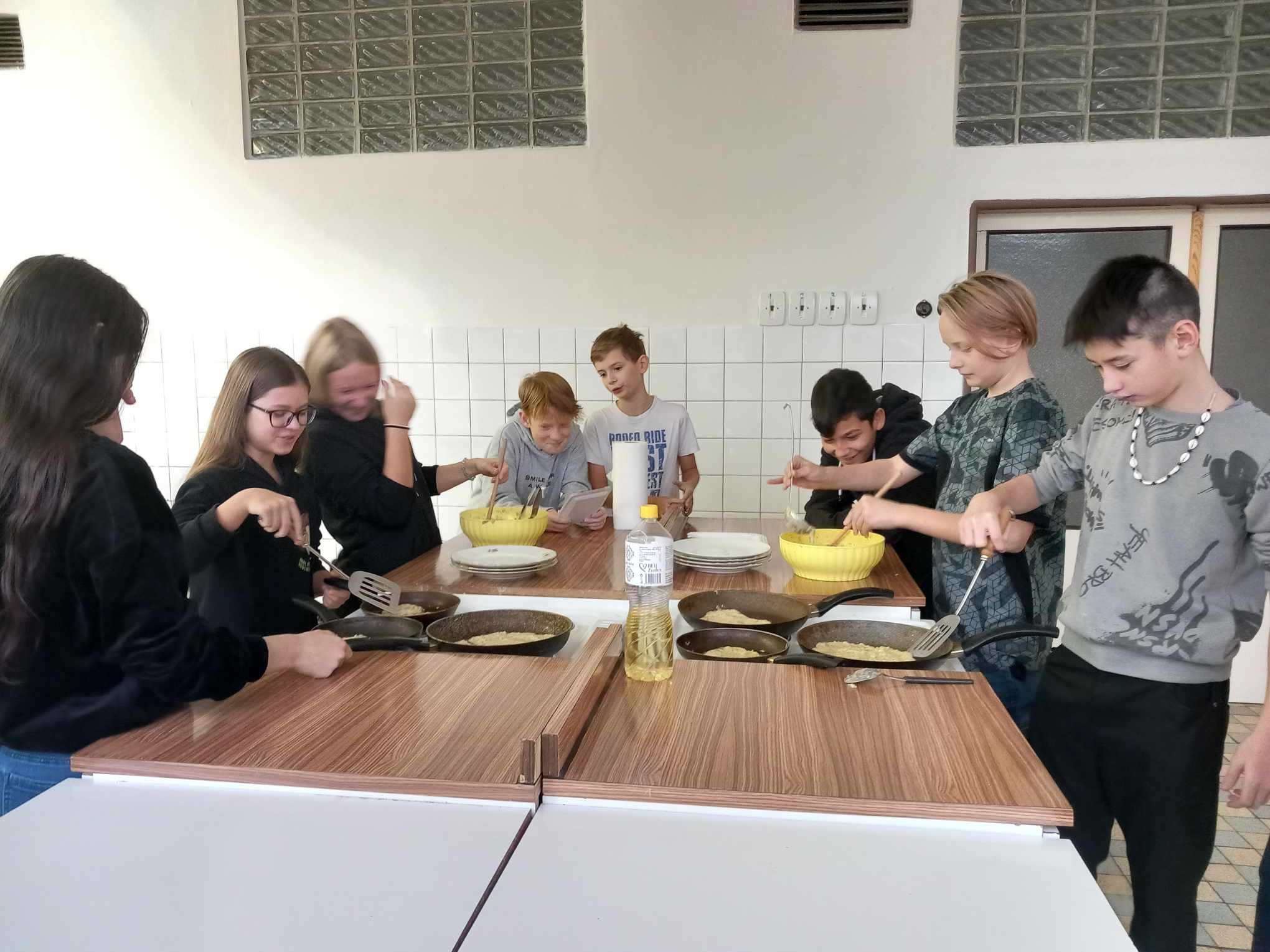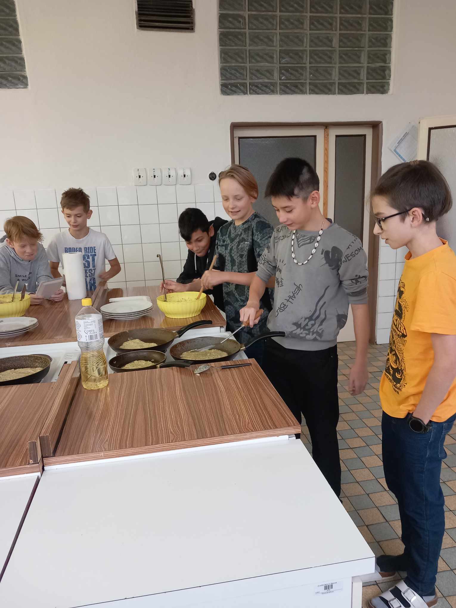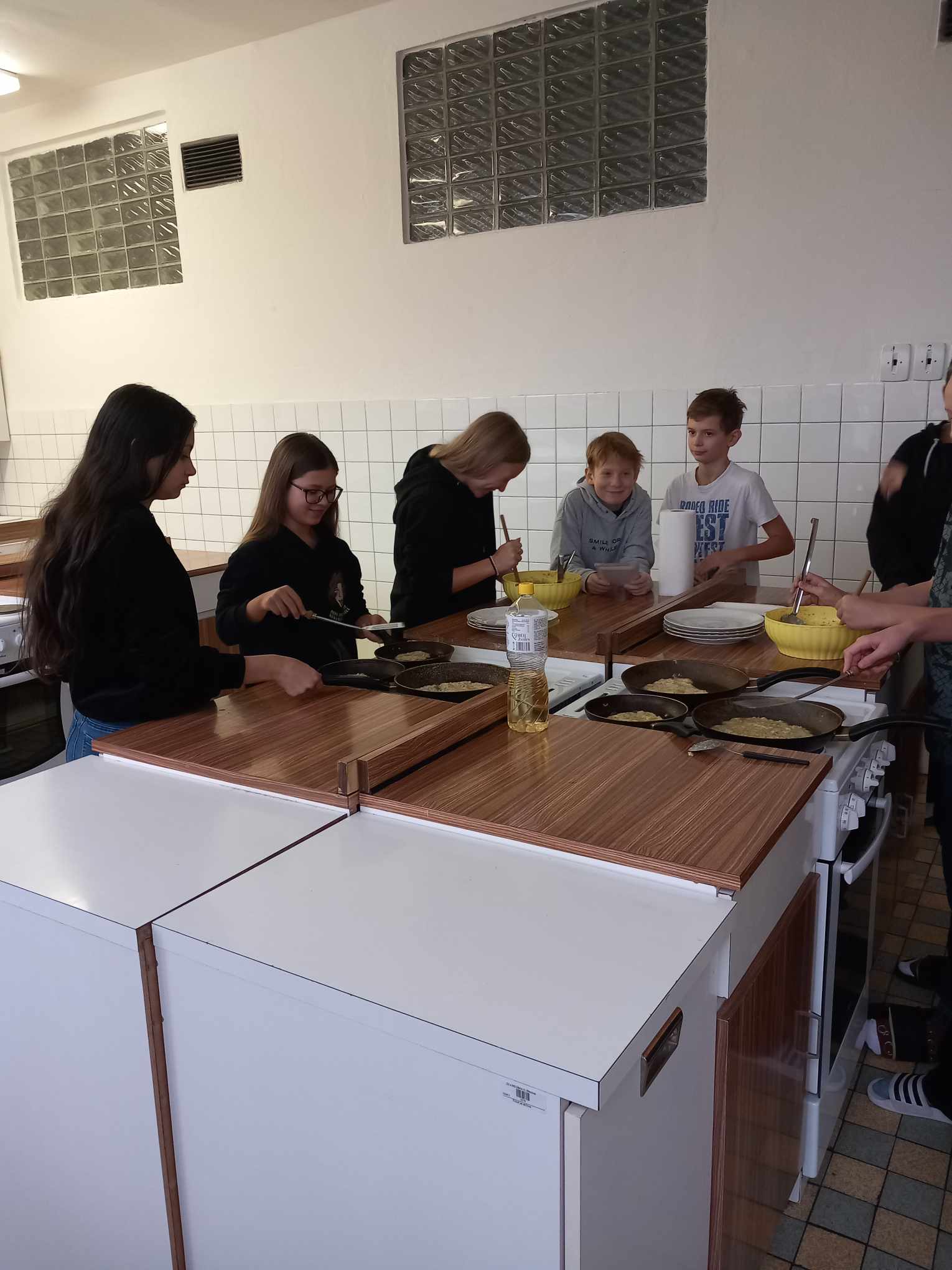 Brzy jsme zjistili, že uvařit dobré jídlo není jen tak. V pondělí jsme napekli plnou mísu bramboráčků. Loupání brambor, strouhání, zápas s vařečkou, pánví a obracečkou nebyl zrovna lehký úkol.