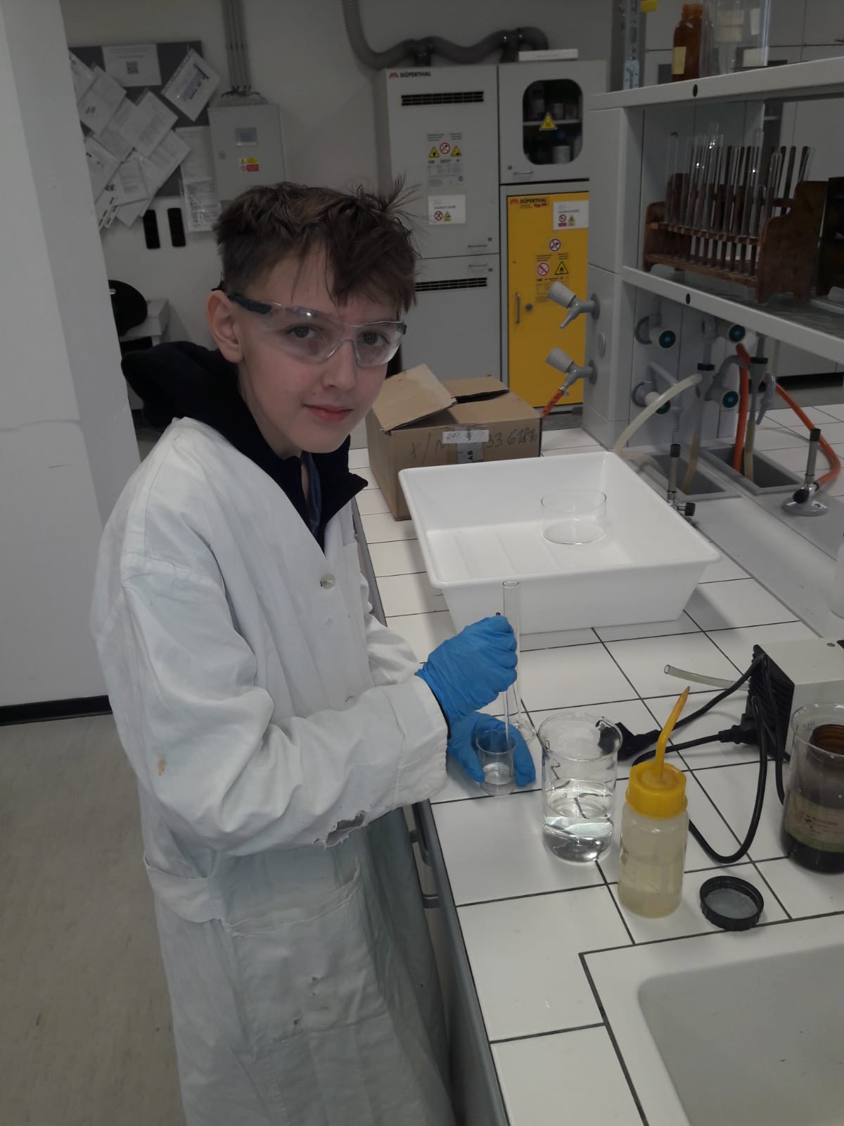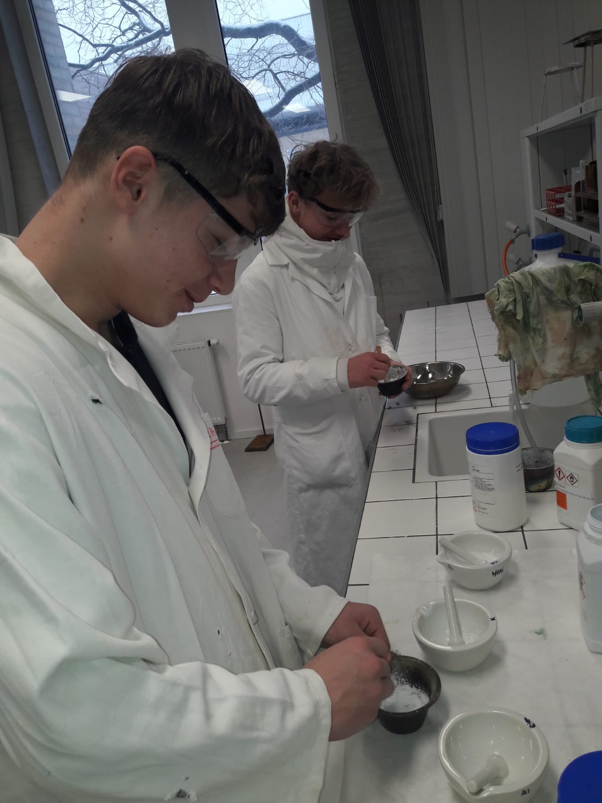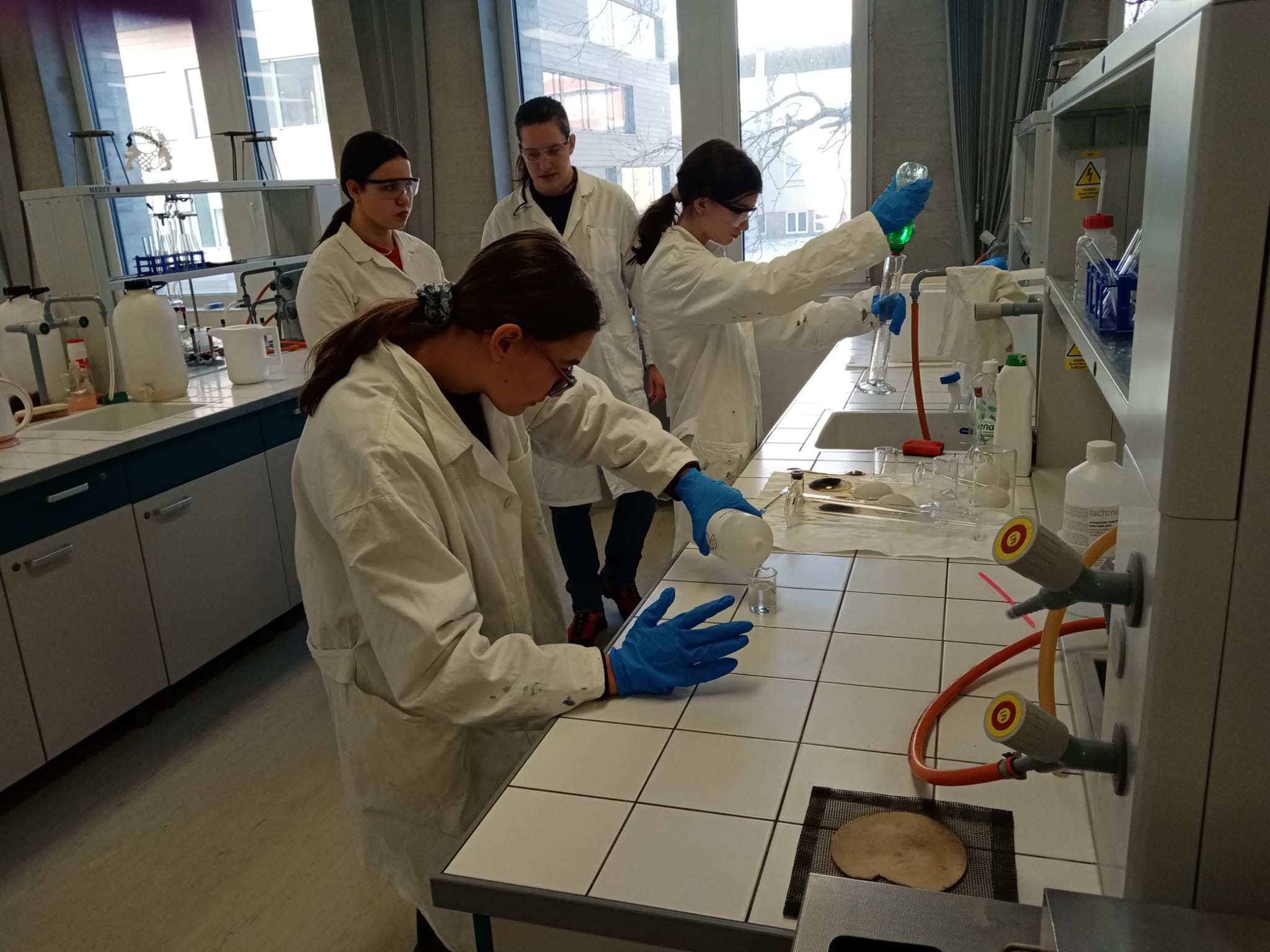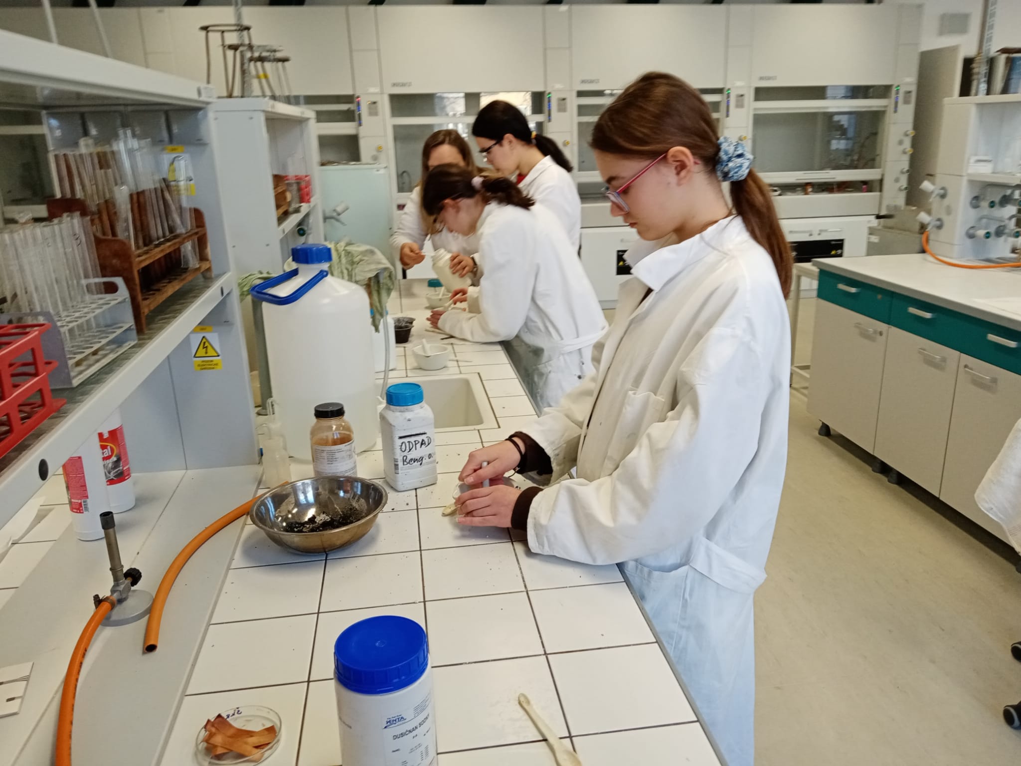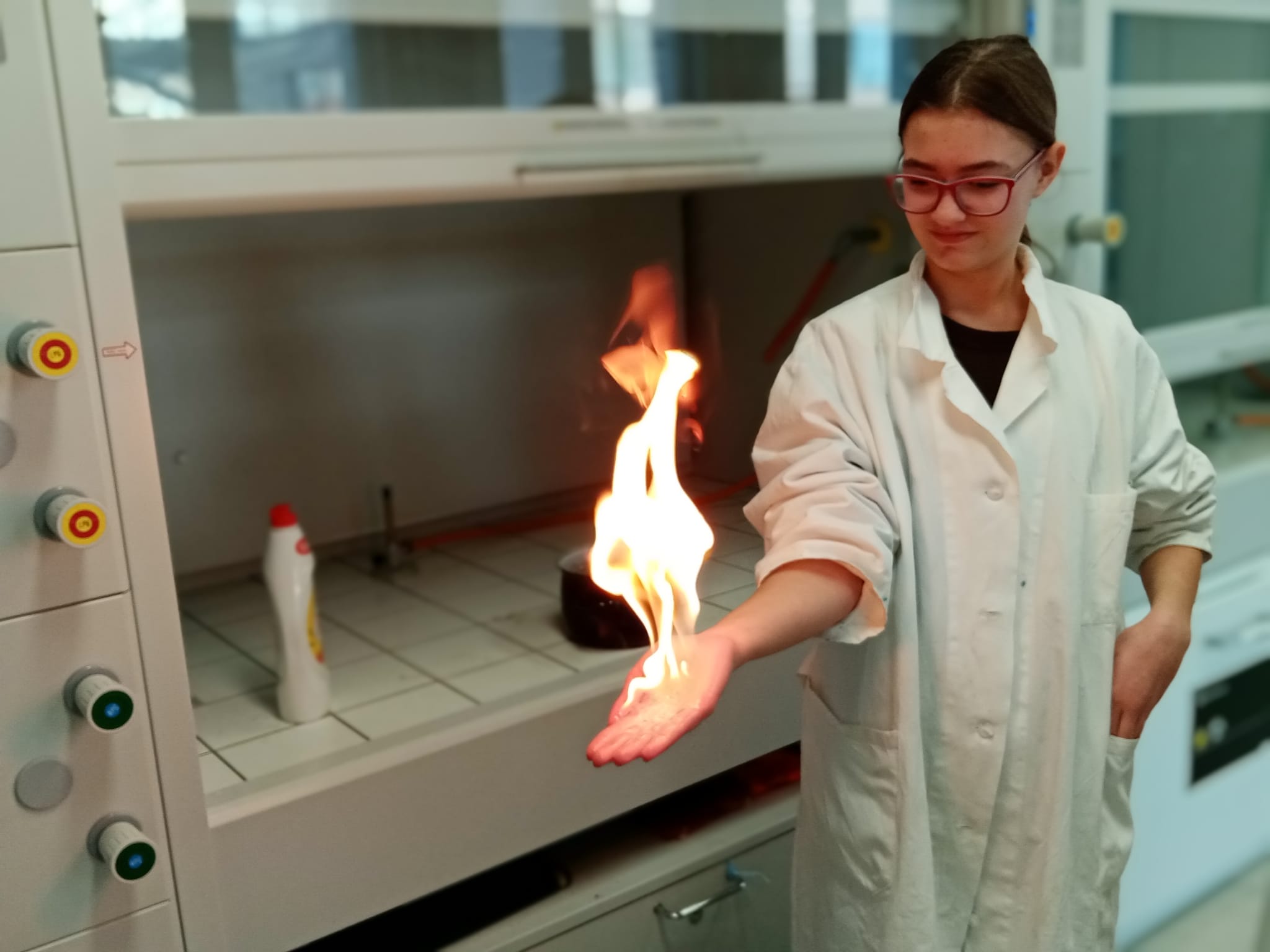 V laboratoři si každý vyzkoušel několik chemických pokusů - přípravu dendritických krystalů, barevné bengálské ohně a práci s tekutým dusíkem. Třešničkou na dortu pro zájemce bylo vzplanutí propanbutanové pěny přímo v dlaních.