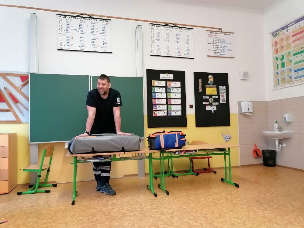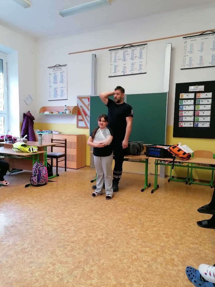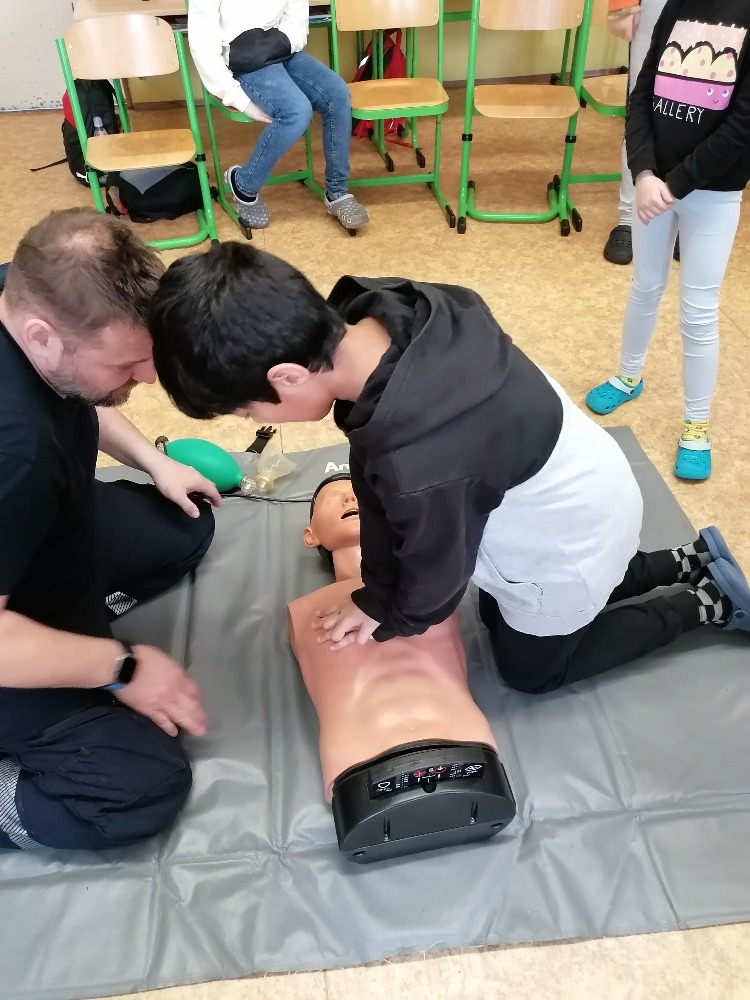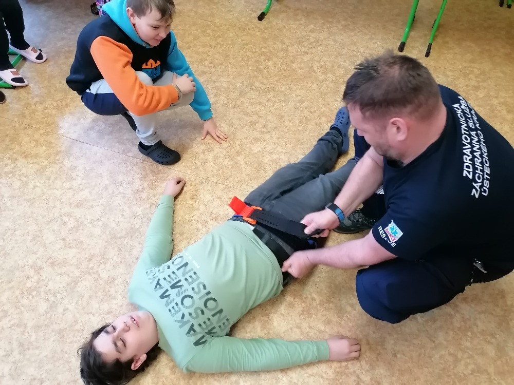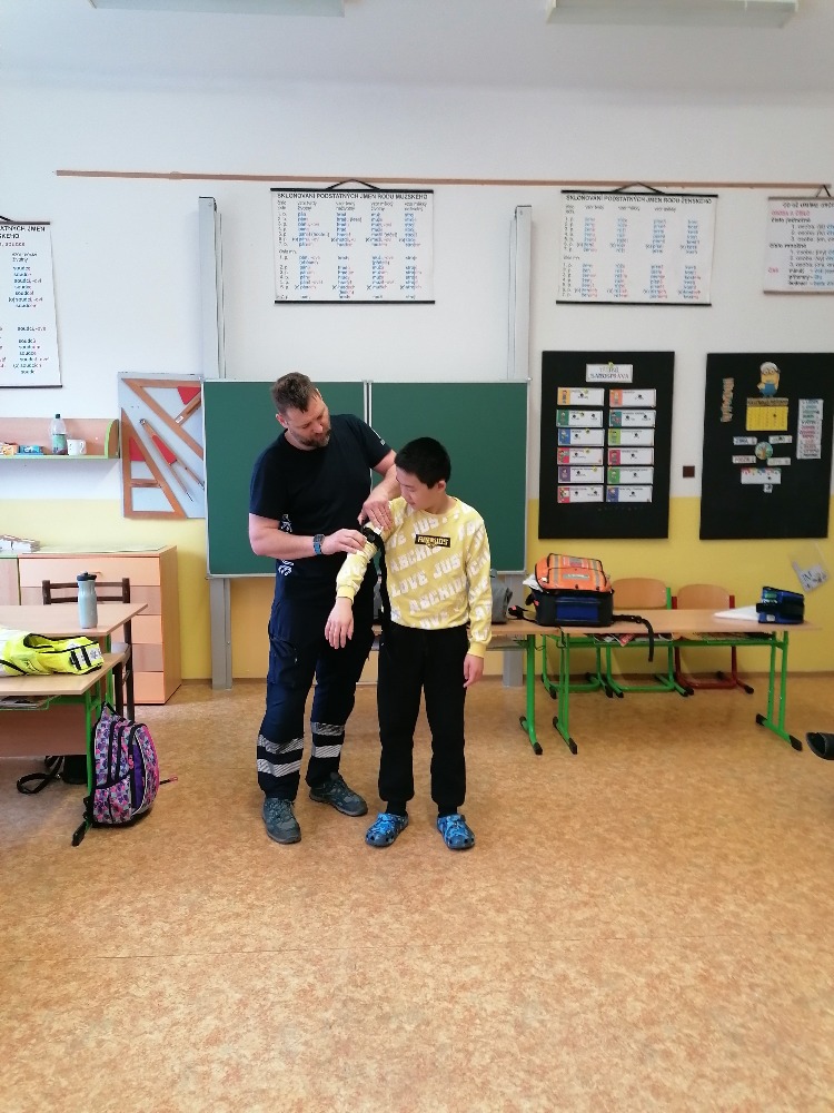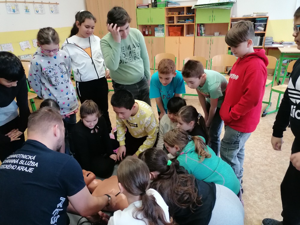 Všechny děti si mohly vyzkoušet umělé dýchaní a masáž srdce, obvázat spolužákovi zlomenou ruku a jak správně použít škrtidlo. Dále se žáci dozvěděli důležité informace k transportu zraněného a jak správně postupovat při volání záchranné služby. Při této příležitosti si žáci zopakovali všechna důležitá telefonní čísla.