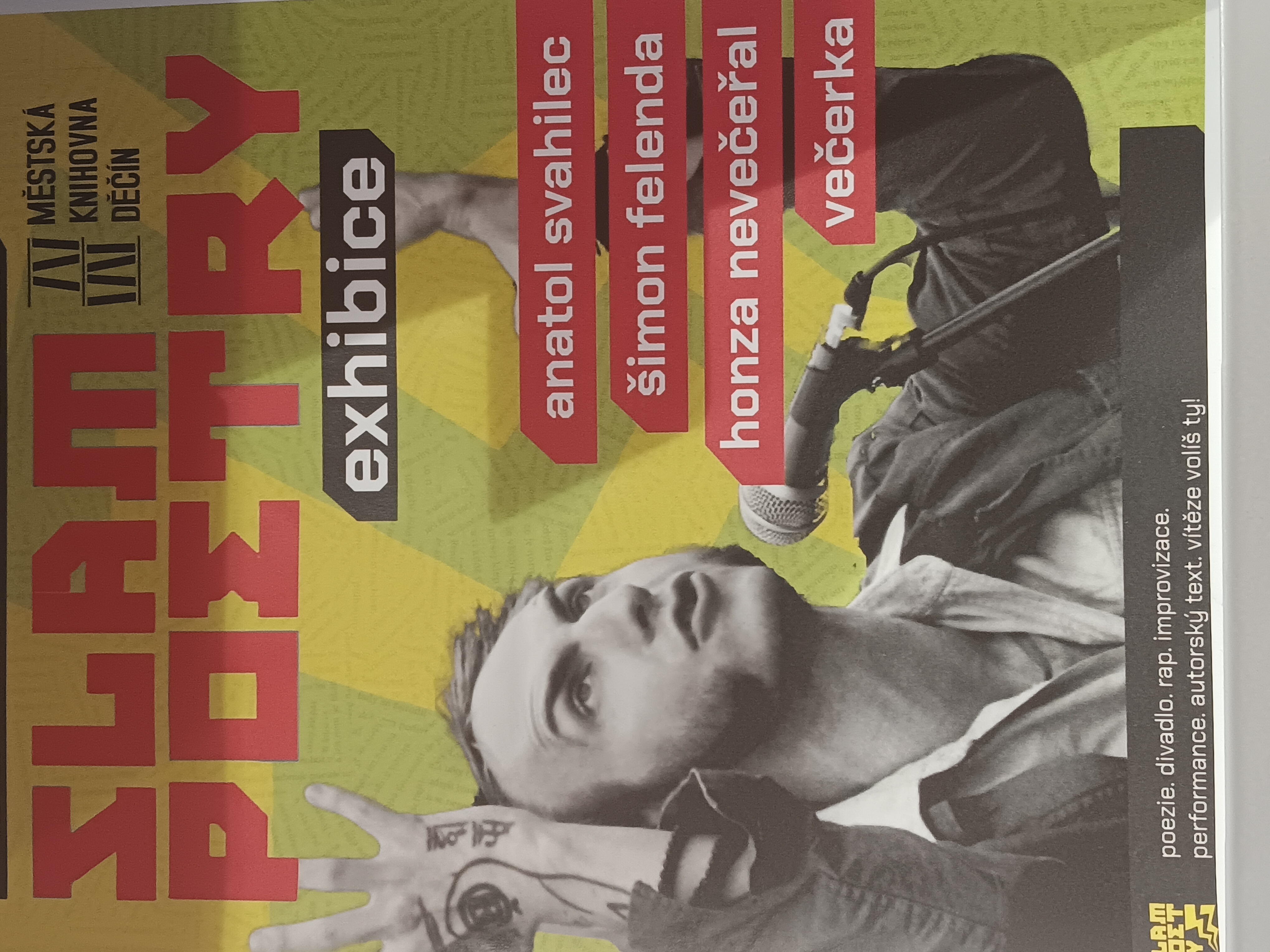 Exhibice se v Děčíně účastnil Anatol Svahilec (asi nejvýznamnější postava české Slam poetry scény), Šimon Falenda, Honza Nevečeřal a Večerka. Akce byla pojata jako souboj na dvě kola těchto 4 slamerů. Po každém vystoupení 6 zástupců z řad žáků obodovalo výkon vystupujícího. Slameři předvedli své texty na různá témata – např. vodáci, bezdomovci, život Asiatů v Česku, pohled paní učitelky na školy v přírodě, Anatol Svahilec dokonce ve 2. kole souboje předvedl slam poetry improvizaci, kdy vytvořil vlastní text přímo před námi na 3 náhodně vybraná slova od žáků. Vítěz byl jeden, ale v našich očích všichni. Akce se opravdu povedla a všichni naši žáci odcházeli s úsměvem na tváři a pocitem, že tahle akce se povedla.