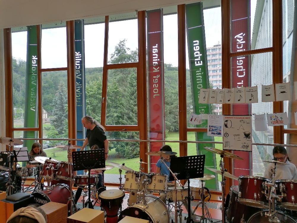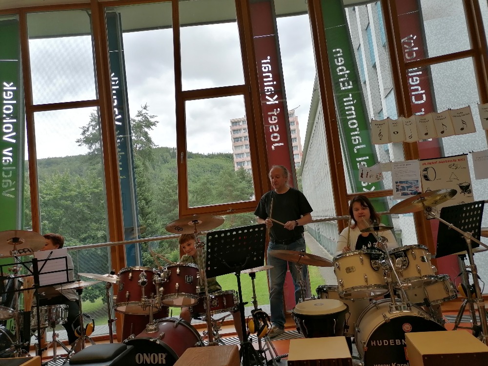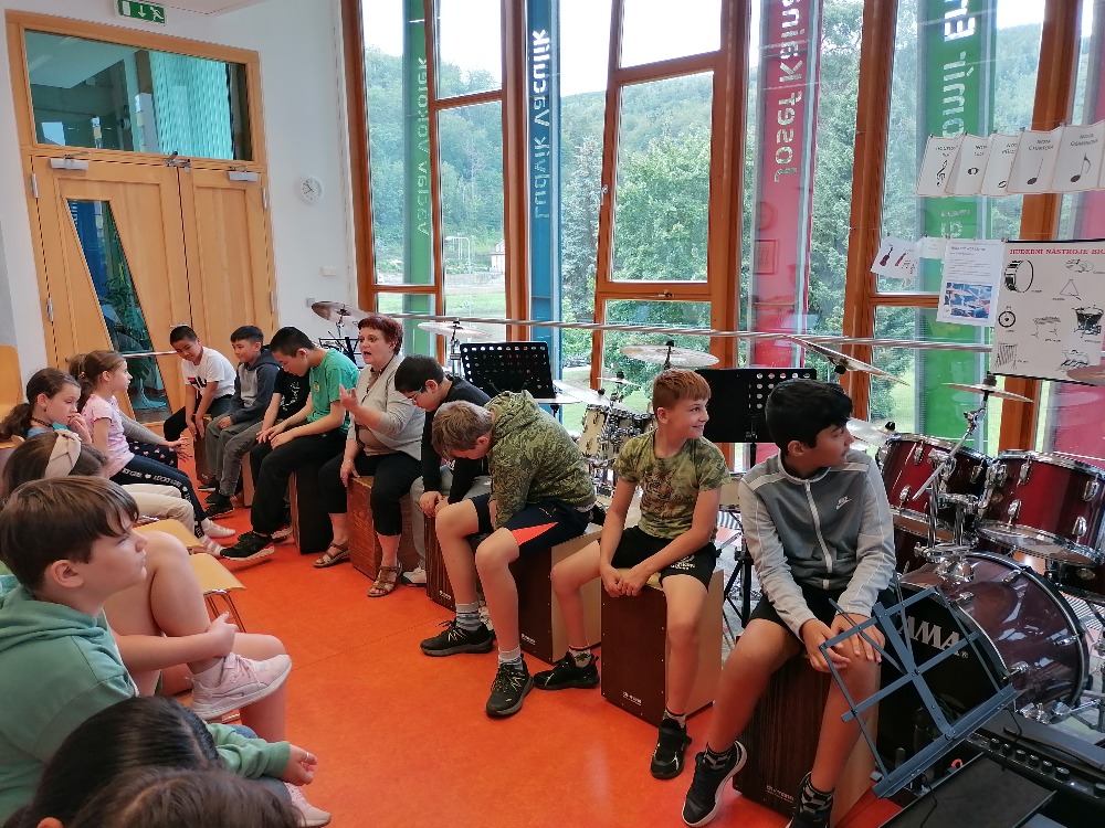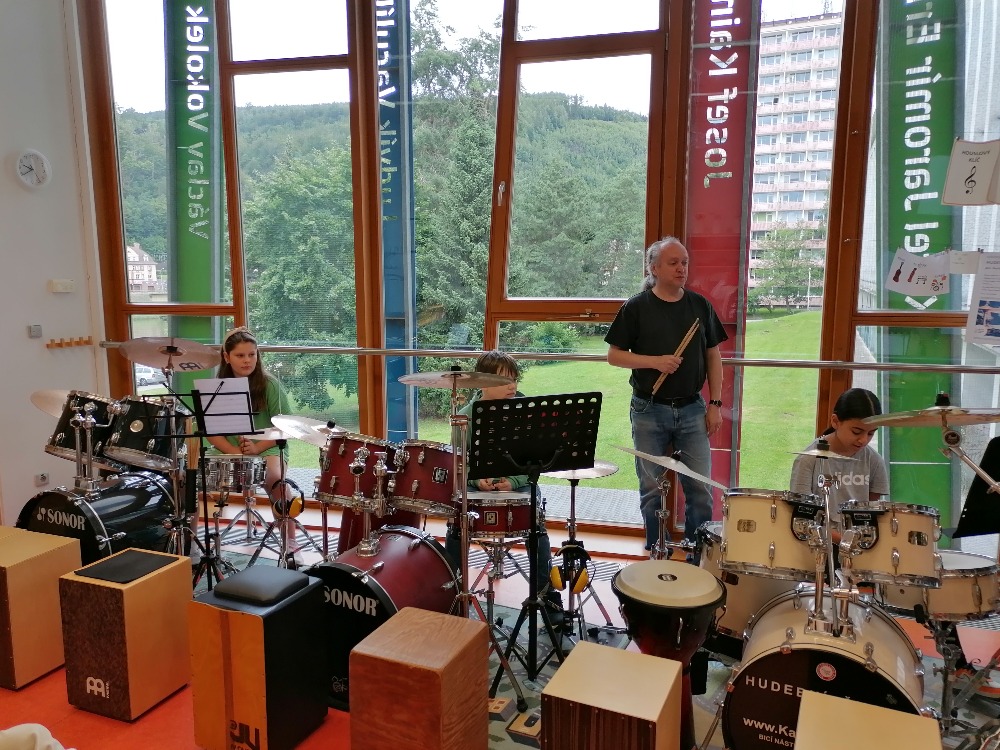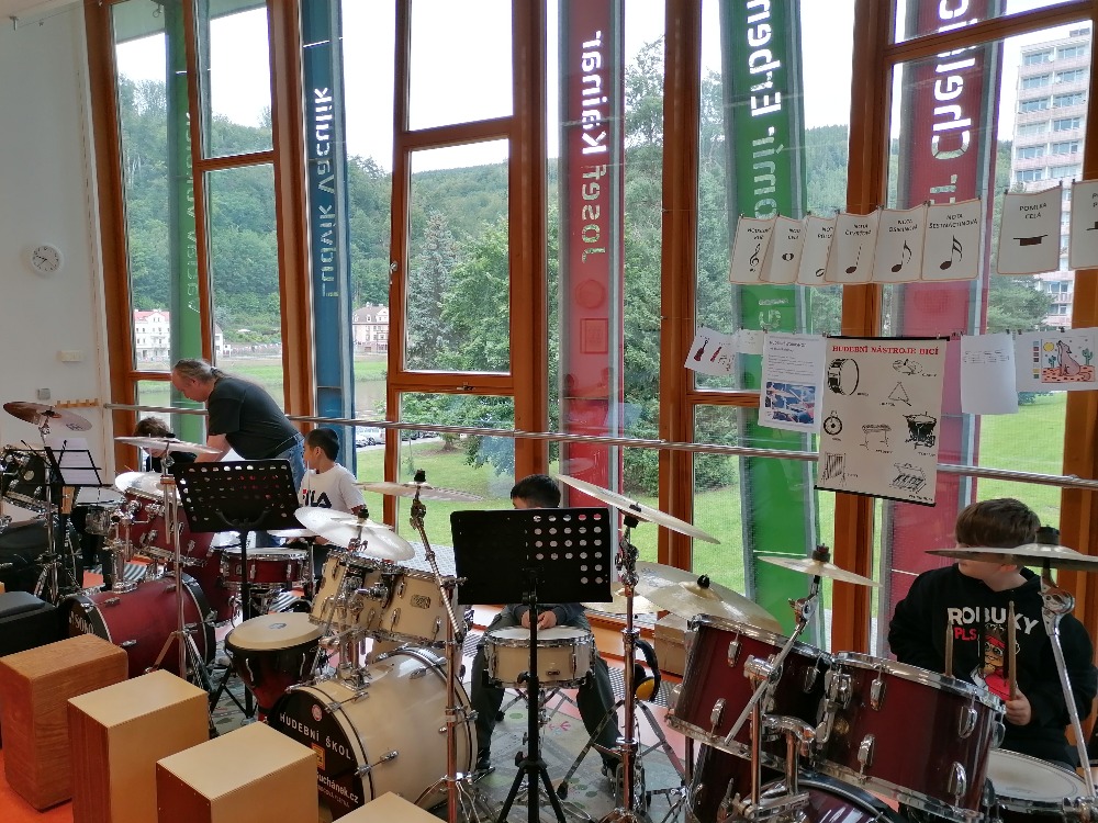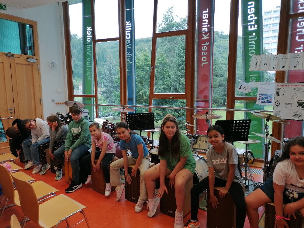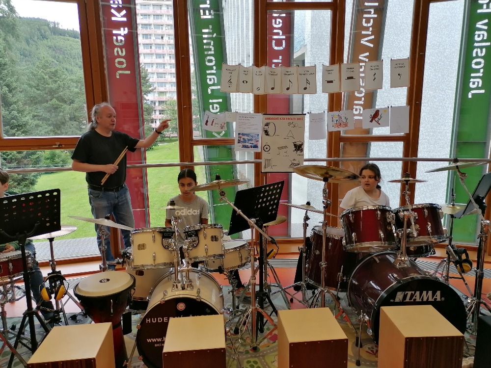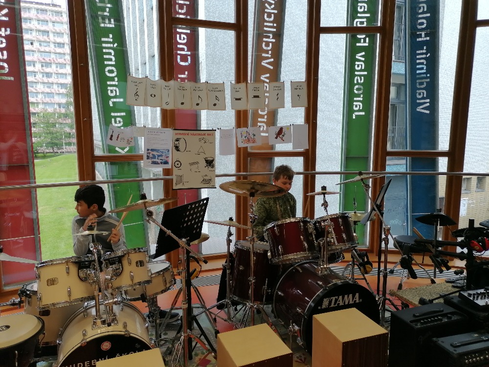 Nejdříve si děti zopakovaly základní rytmy při hře na bicí soupravu, které již znaly z prvního dílu tohoto hudebního programu. Poté se děti seznámily s dalšími a již složitějšími druhy rytmických doprovodů a všichni si je postupně vyzkoušeli (včetně nás učitelek). Tato již navazující lekce proběhla tedy ryze v praktickém duchu a celou hodinu žáci jen hráli, hráli a hráli.