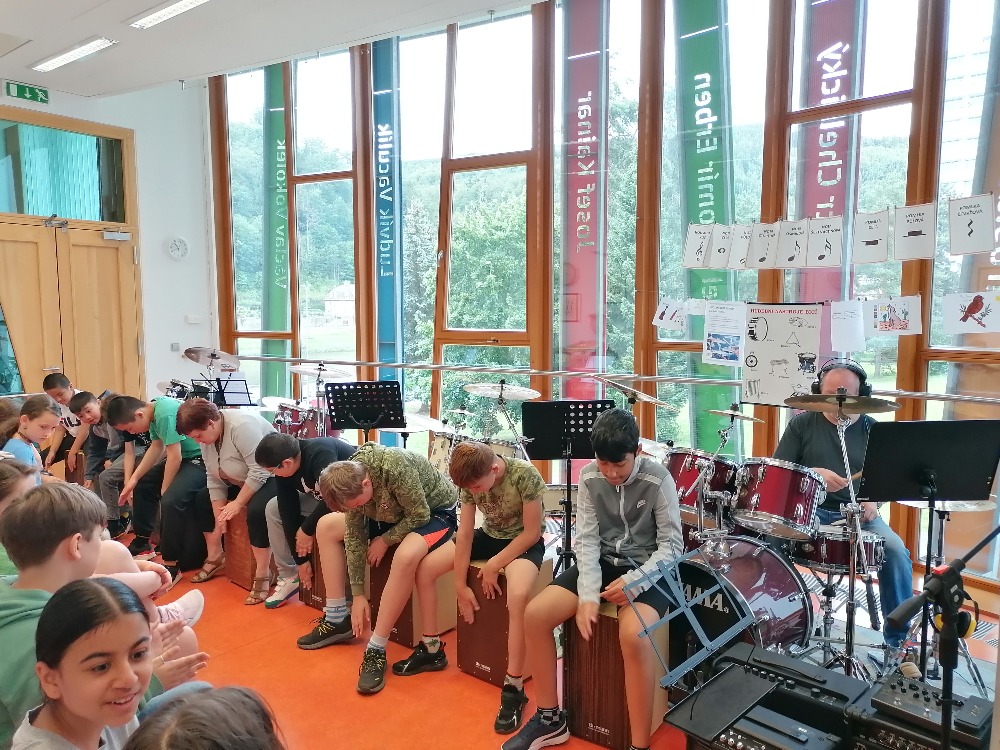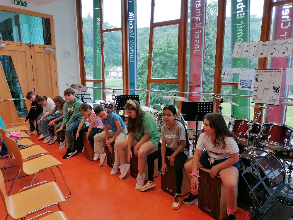 Závěr workshopu patřil opět skupinové hře na cajony. Děti si z minulé lekce zopakovaly a doprovodily hrou na cajony jeden z největších hitů hudební skupiny Queen – We will rock you.