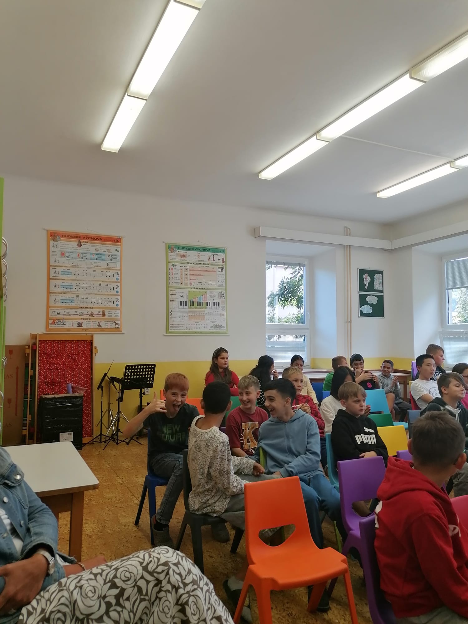 Žáci se například dozvěděli, že dříve se jako součást kytary používal například želví krunýř :-) Pánové také samozřejmě žáky seznámili s podobou současné dřevěné akustické kytary, elektroakustické a elektrické. Ta poslední měla samozřejmě největší úspěch, protože čím větší randál, tím samozřejmě lepší :-)