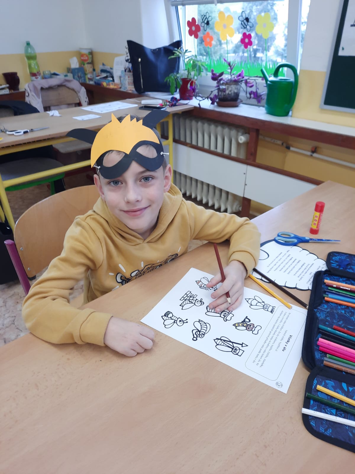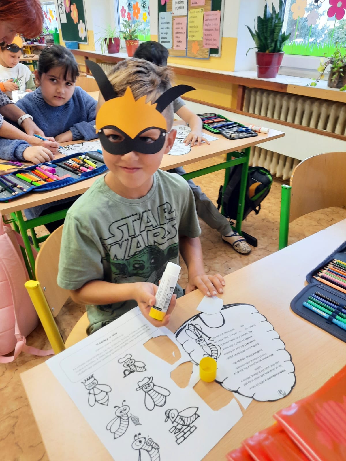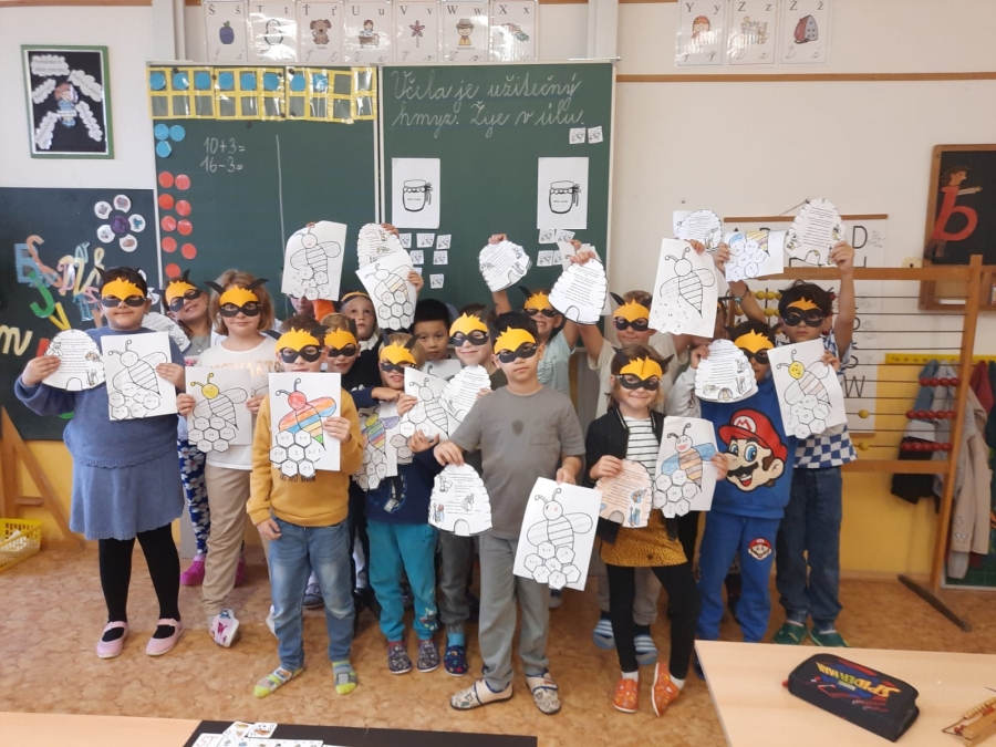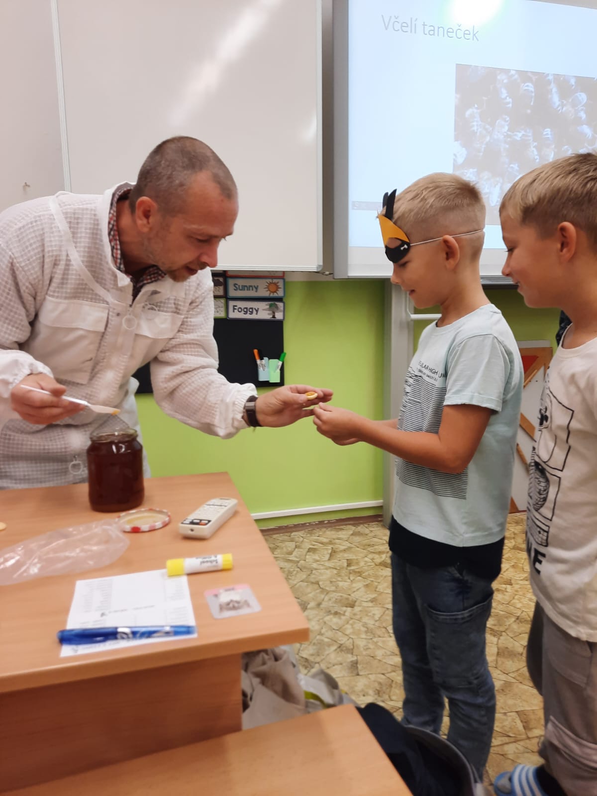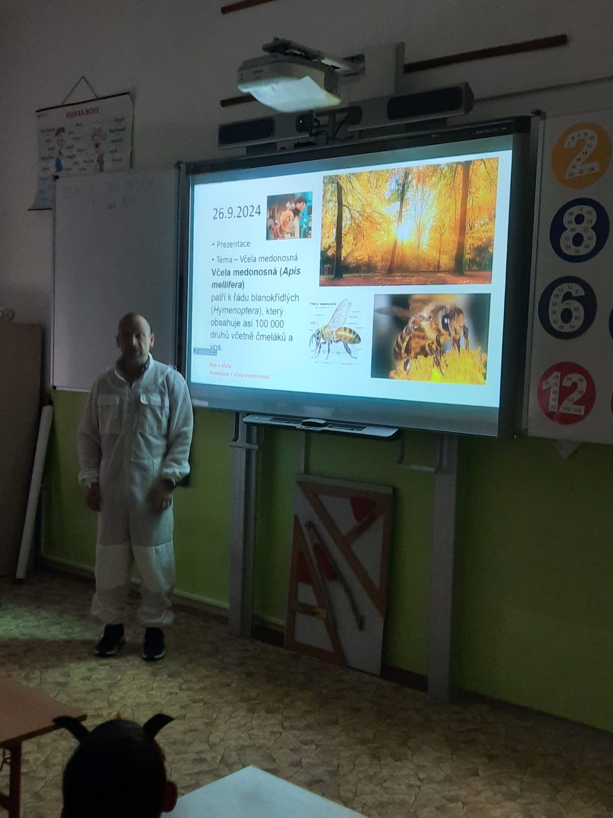 Do tříd jsme na přednášku pozvali pana Janoucha z Jílového, který se věnuje včelařině. Předem jsme si vyrobili masku včelky a přivítali jsme včelaře jako třída plná včeliček. Pan Janouch nám na oplátku vyprávěl o životě včely a o jejím významu pro člověka.