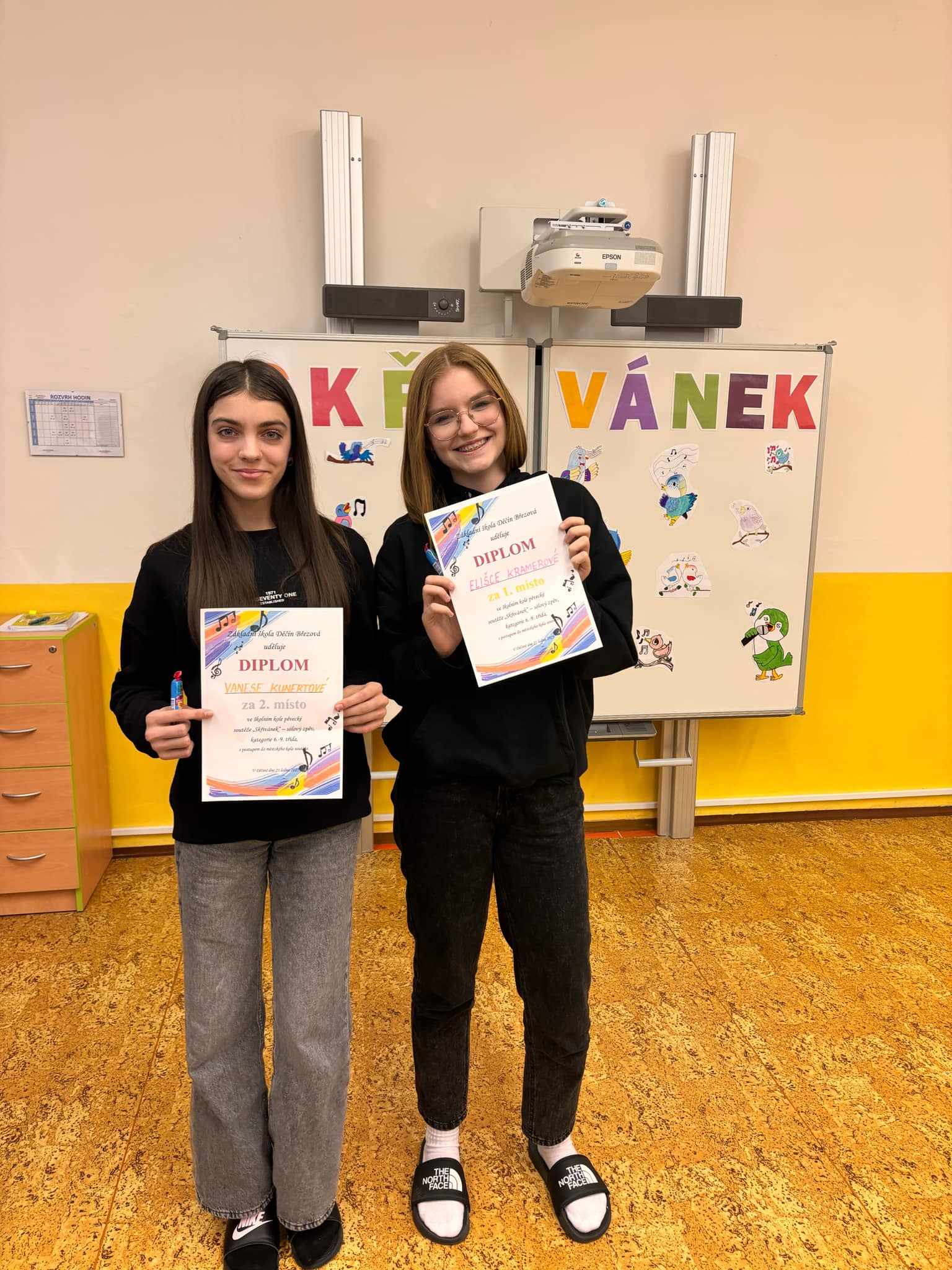 V kategorii 6.-9. tříd si zazpívala dvě děvčata, Eliška Kramerová a Vanessa Kunertová z 8.B. Obě děvčata si vyzpívala postup do městského kola, které se bude konat ve čtvrtek 13. 2. 2025 v DDM Děčín. Eliška obsadila 1. místo s písní Desatero a Vanessa si vyzpívala 2. místo s písní Tam za řekou.