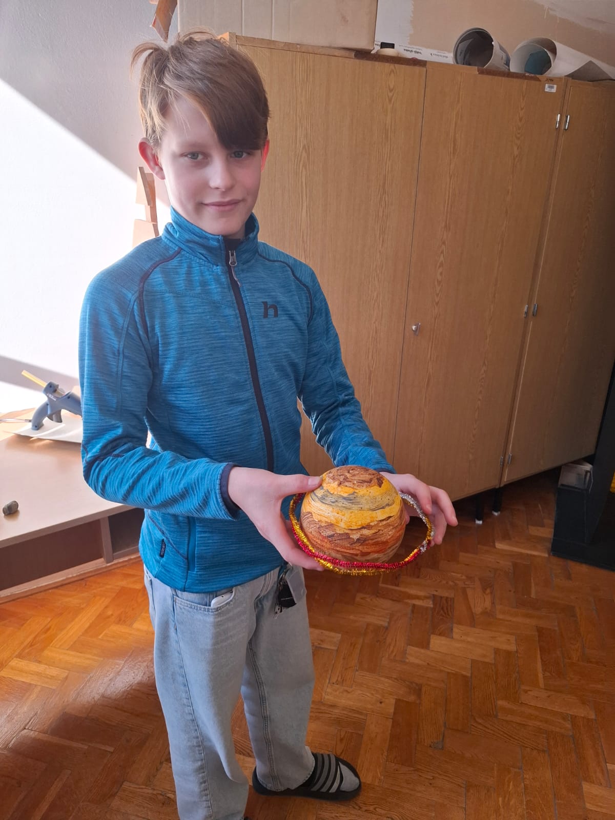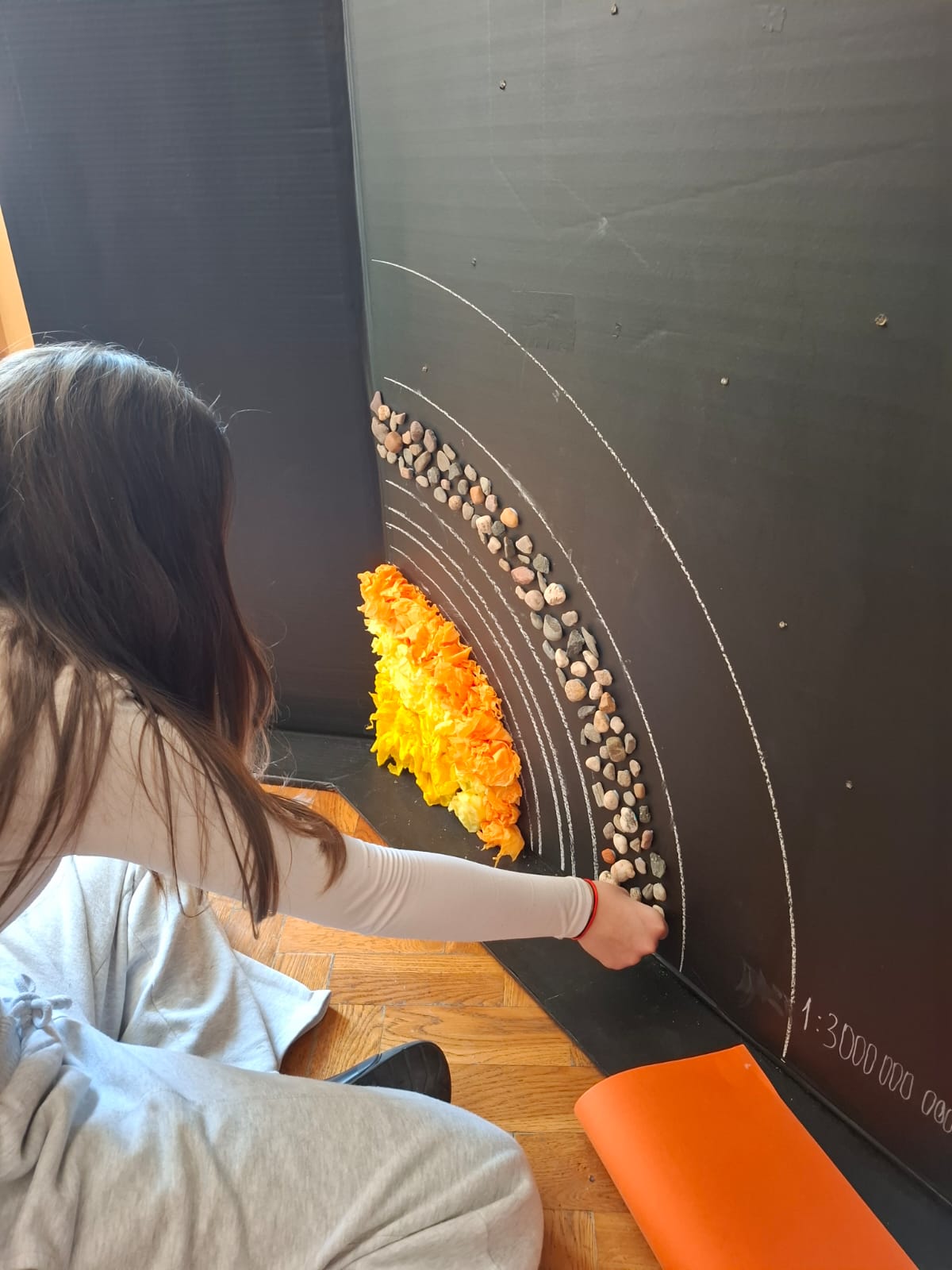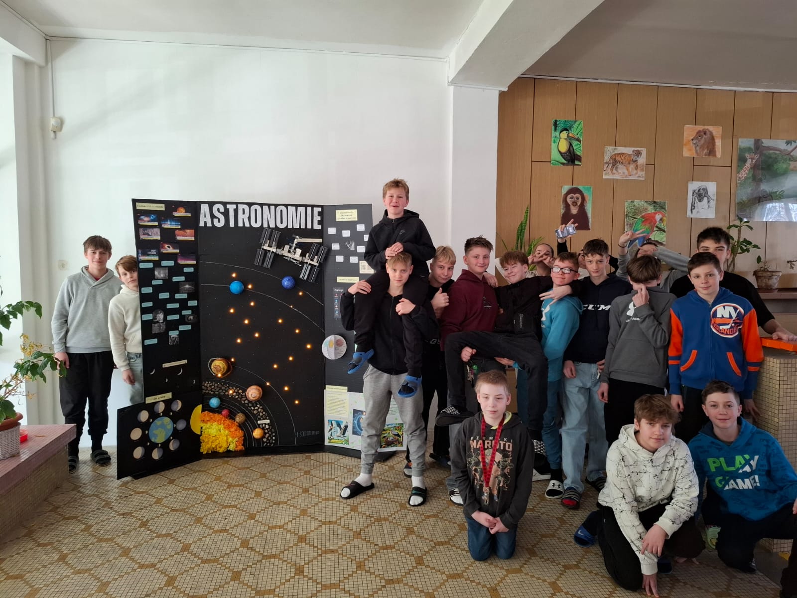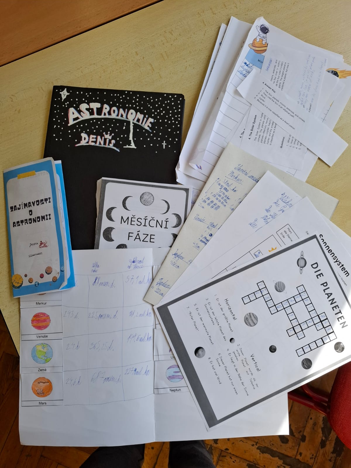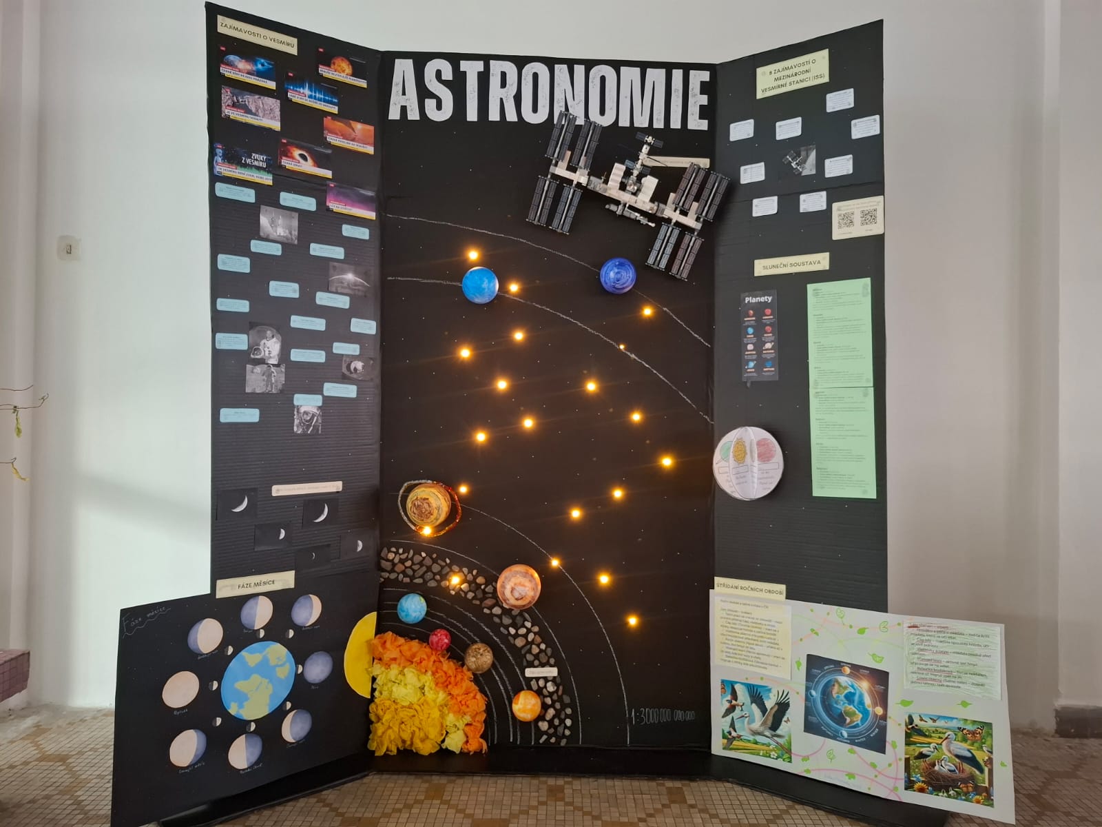 Napříč předměty zkoumali žáci vesmír - vytvořili planety, o kterých se zároveň dozvěděli podrobnější informace, měřítkem se naučili určovat vzdálenosti jednotlivých planet od Slunce, vypracovali si brožuru s astronomickými zajímavostmi, naprojektovali jednotlivé měsíční fáze a střídání ročních období.