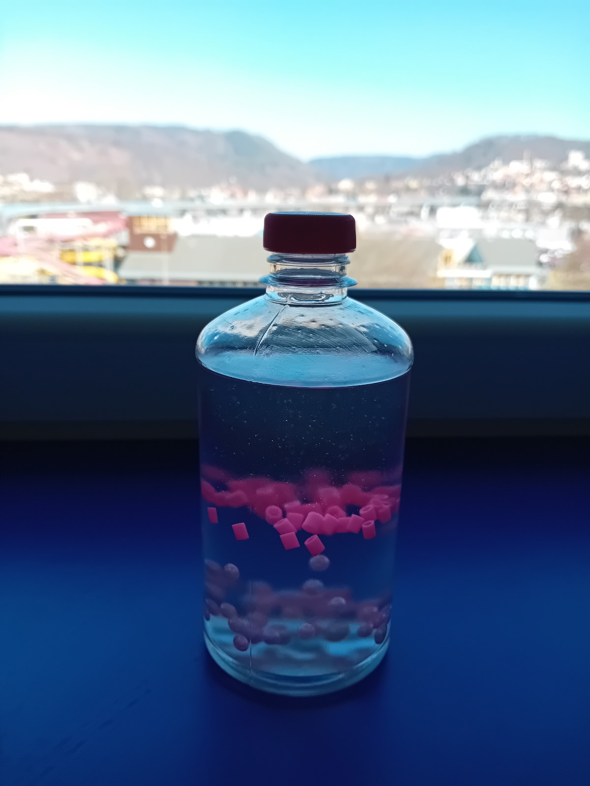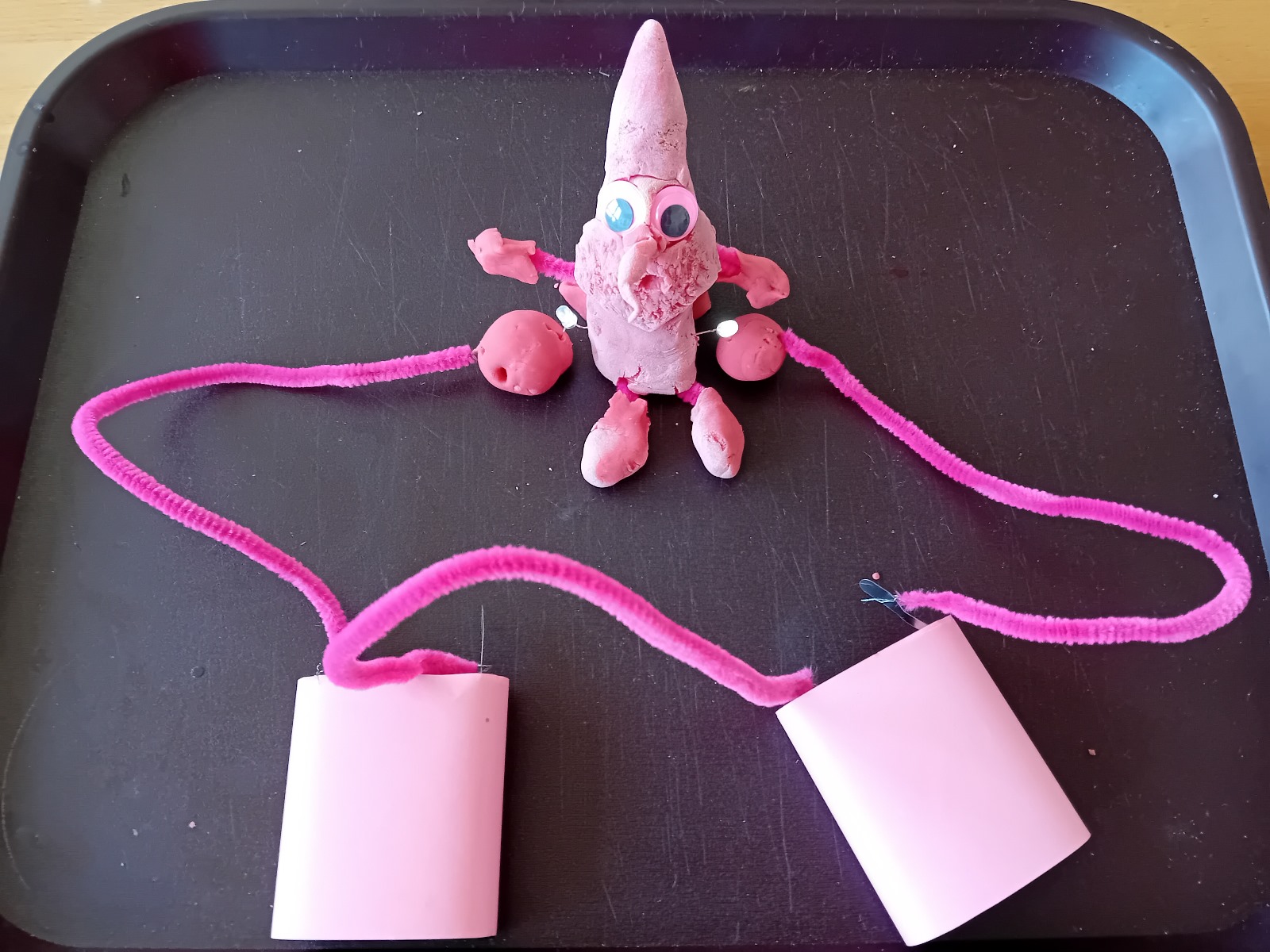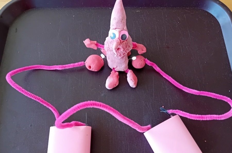 Na březen si zvolili růžovou barvu. Vyrobili oblíbenou “Seanovu láhev” s korálky, která je k vidění v učebně fyziky. Vymodelovali trpaslíka z vodivé modelíny, který vedl el. proud a dokázal rozsvítit led diody.