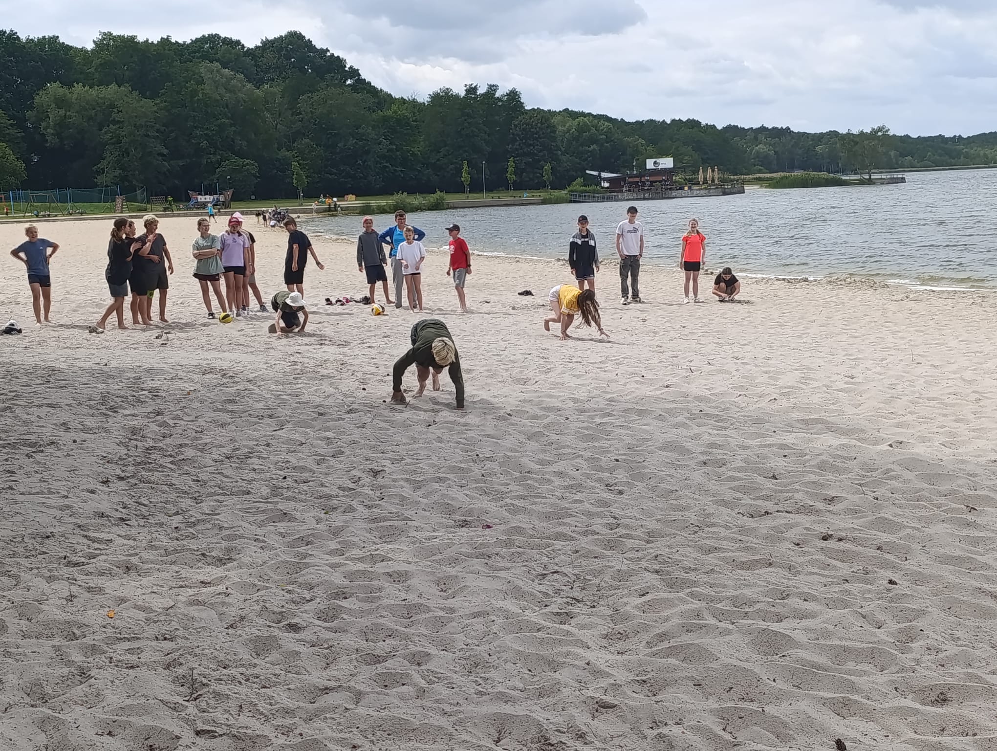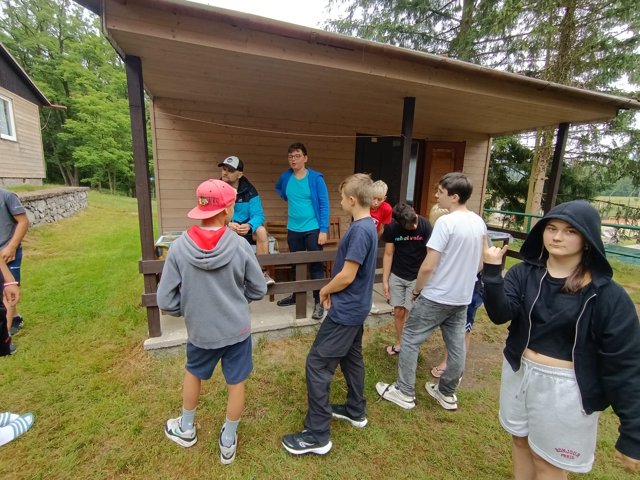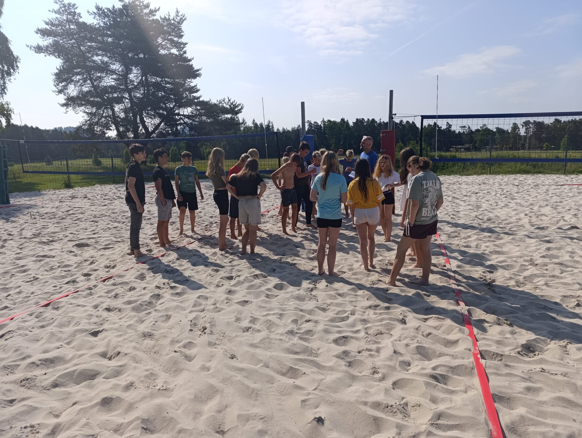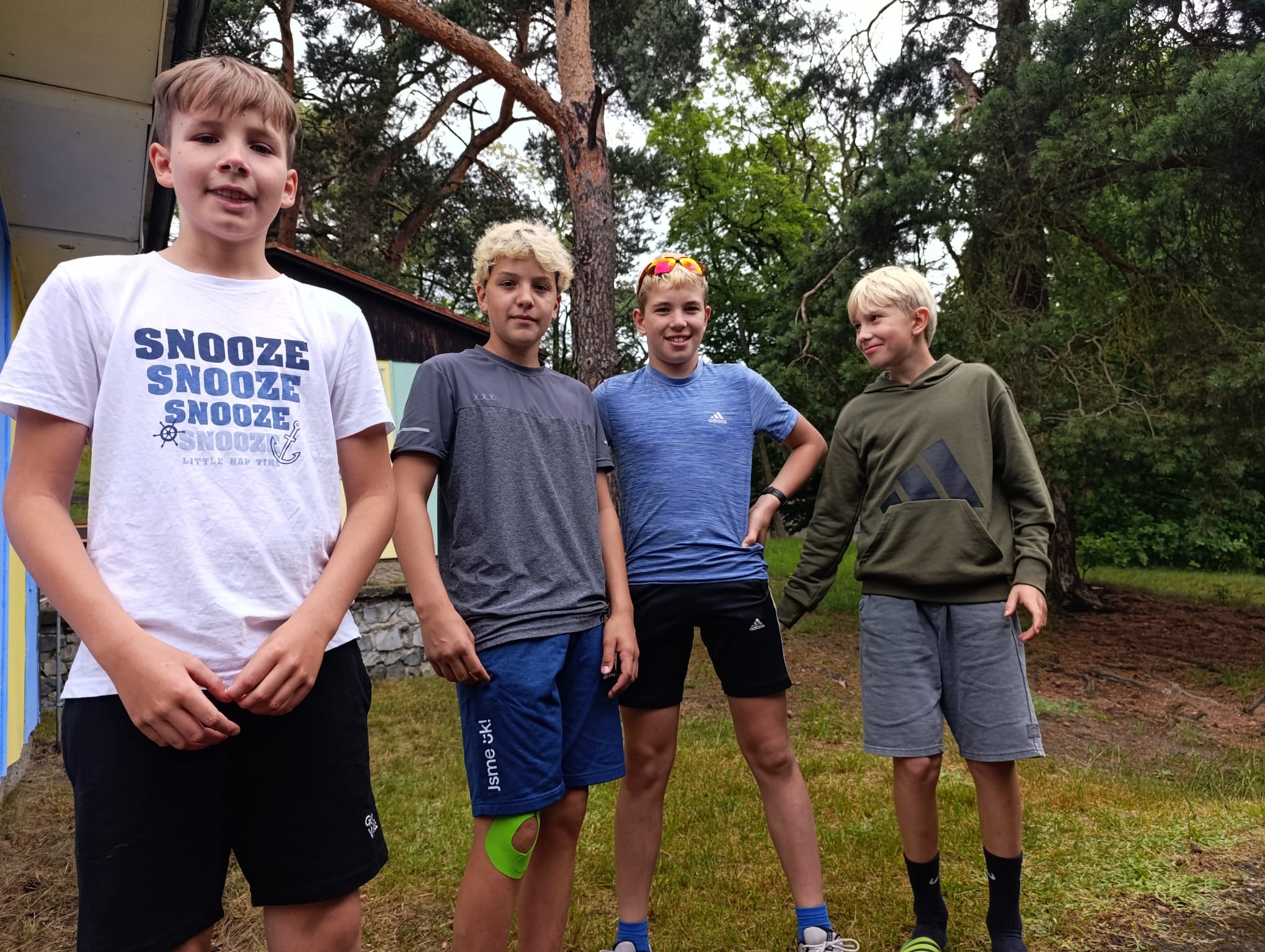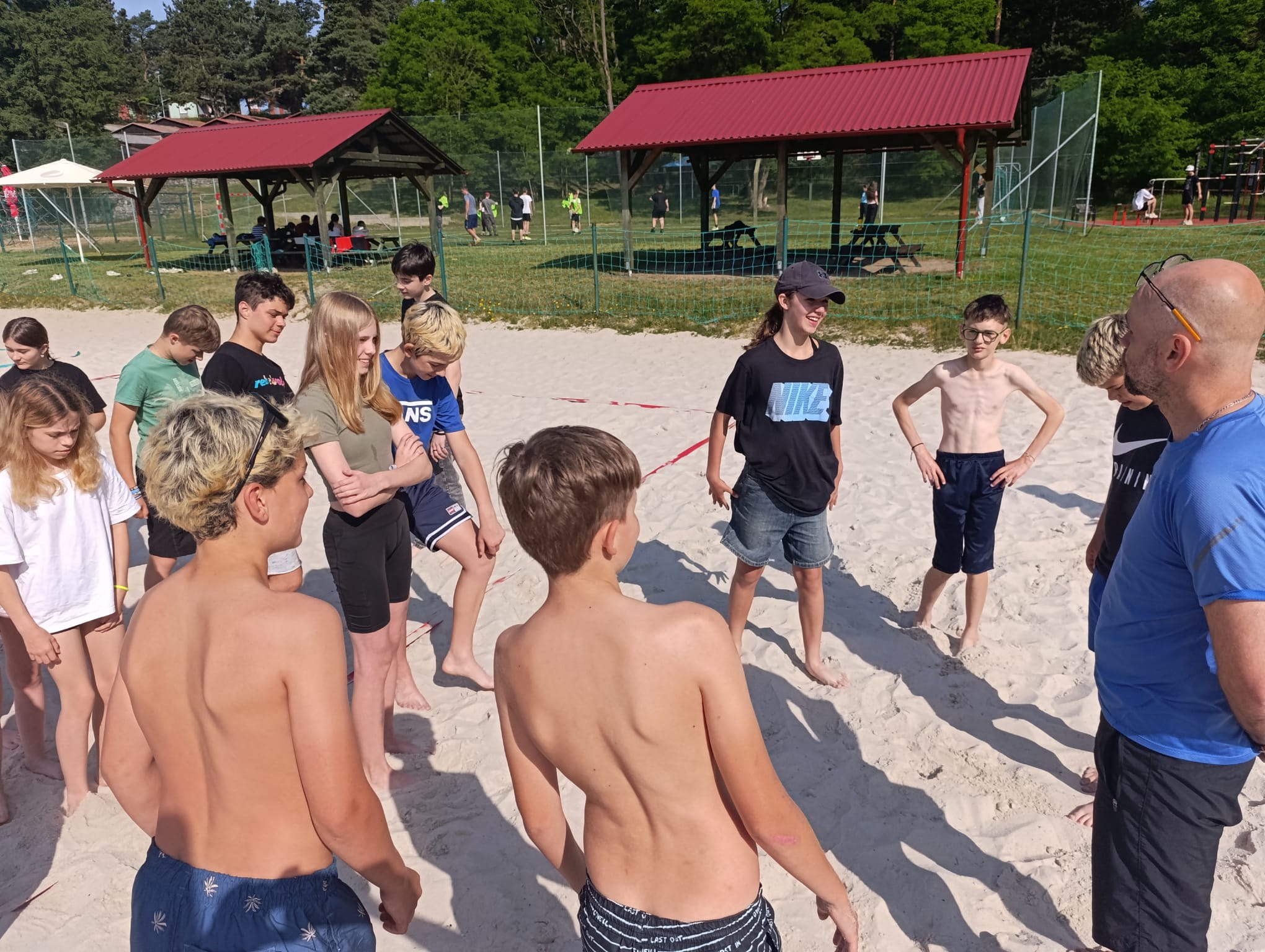 Po příchodu do areálu přestalo pršet a my se mohli po vybalení věcí a povlečení lůžkovin věnovat mnoha plánovaným i neplánovaným aktivitám. Bazén, beachvolejbalové kurty, hřiště na fotbal, pingpongové stoly, lezecká stěna, workoutové hřiště byly využity v plné míře. Po druhé hodině jsme si udělali procházku k Máchovu jezeru. Cestou jsme hráli několikrát „na medvěda“. Na hlavní pláži jsme pak soutěžili v písečných bězích a ve stavění přepychových staveb z písku. Odvážlivci se vykoupali v jezeře, někteří si zahráli beachvolejbal. Po příchodu jsme šli na večeři a poté jsme připravovali dřevo na večerní táborák. Plno z nás si opeklo všemožné buřtíky a klobásky.