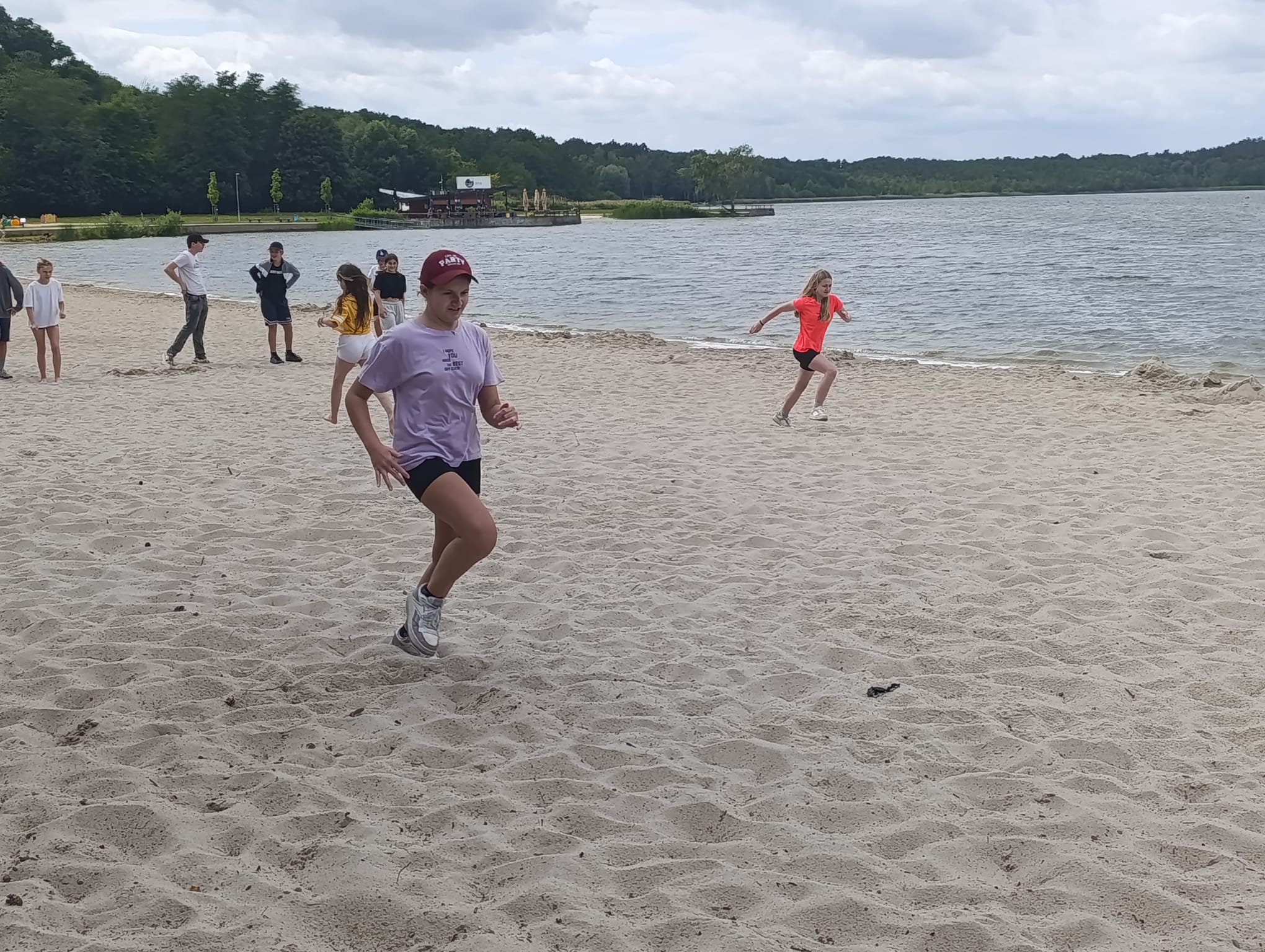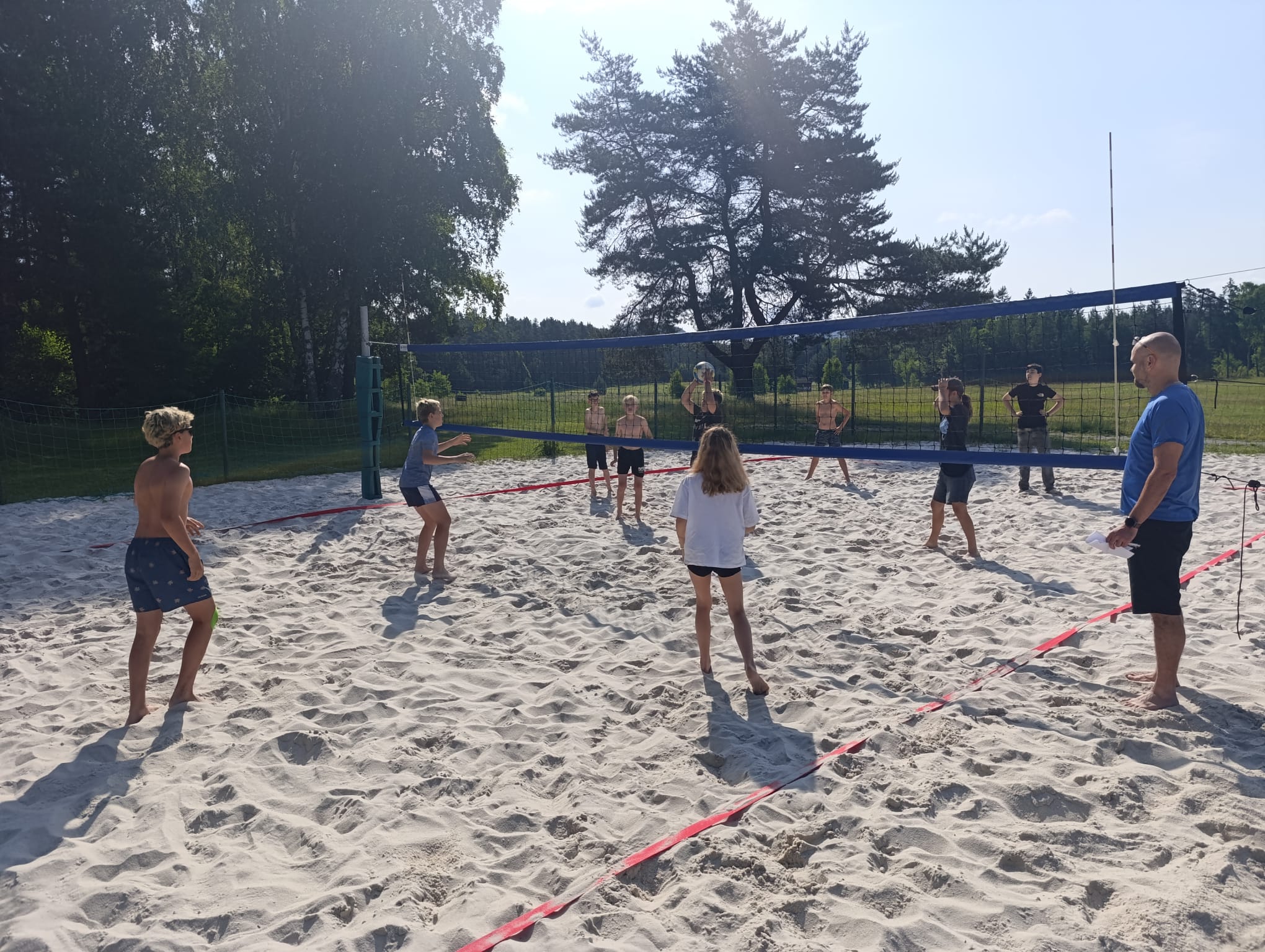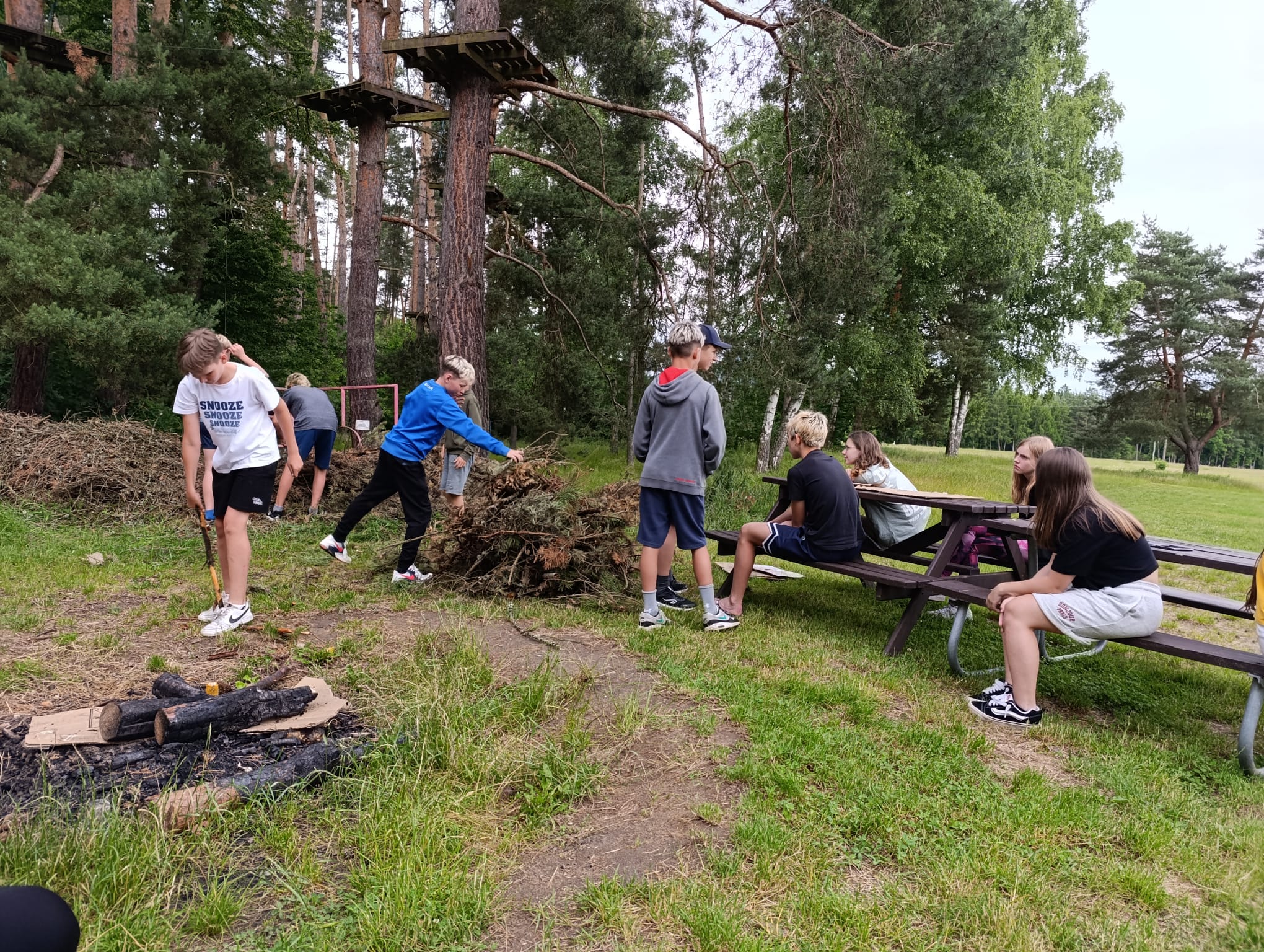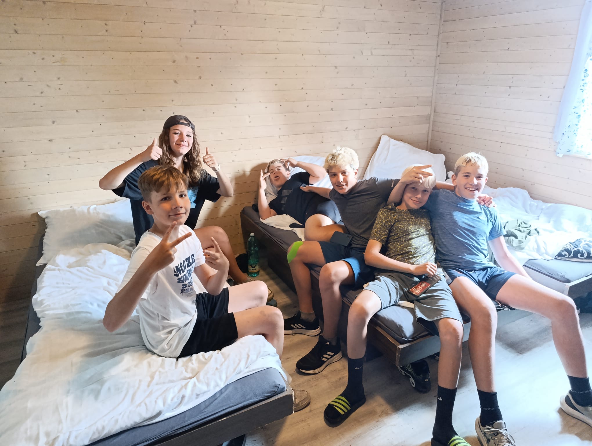 Po příchodu do areálu přestalo pršet a my se mohli po vybalení věcí a povlečení lůžkovin věnovat mnoha plánovaným i neplánovaným aktivitám. Bazén, beachvolejbalové kurty, hřiště na fotbal, pingpongové stoly, lezecká stěna, workoutové hřiště byly využity v plné míře. Po druhé hodině jsme si udělali procházku k Máchovu jezeru. Cestou jsme hráli několikrát „na medvěda“. Na hlavní pláži jsme pak soutěžili v písečných bězích a ve stavění přepychových staveb z písku. Odvážlivci se vykoupali v jezeře, někteří si zahráli beachvolejbal. Po příchodu jsme šli na večeři a poté jsme připravovali dřevo na večerní táborák. Plno z nás si opeklo všemožné buřtíky a klobásky.