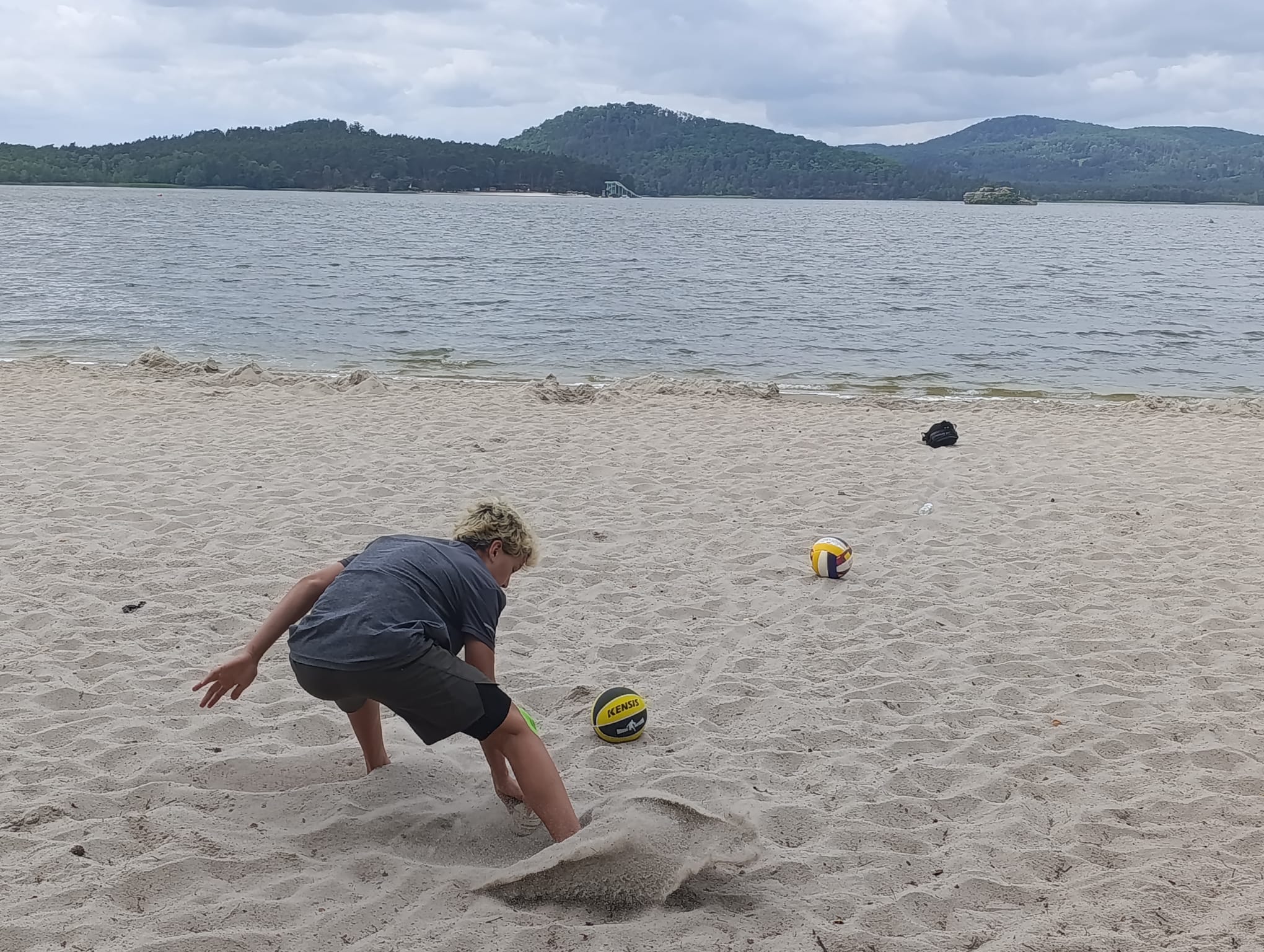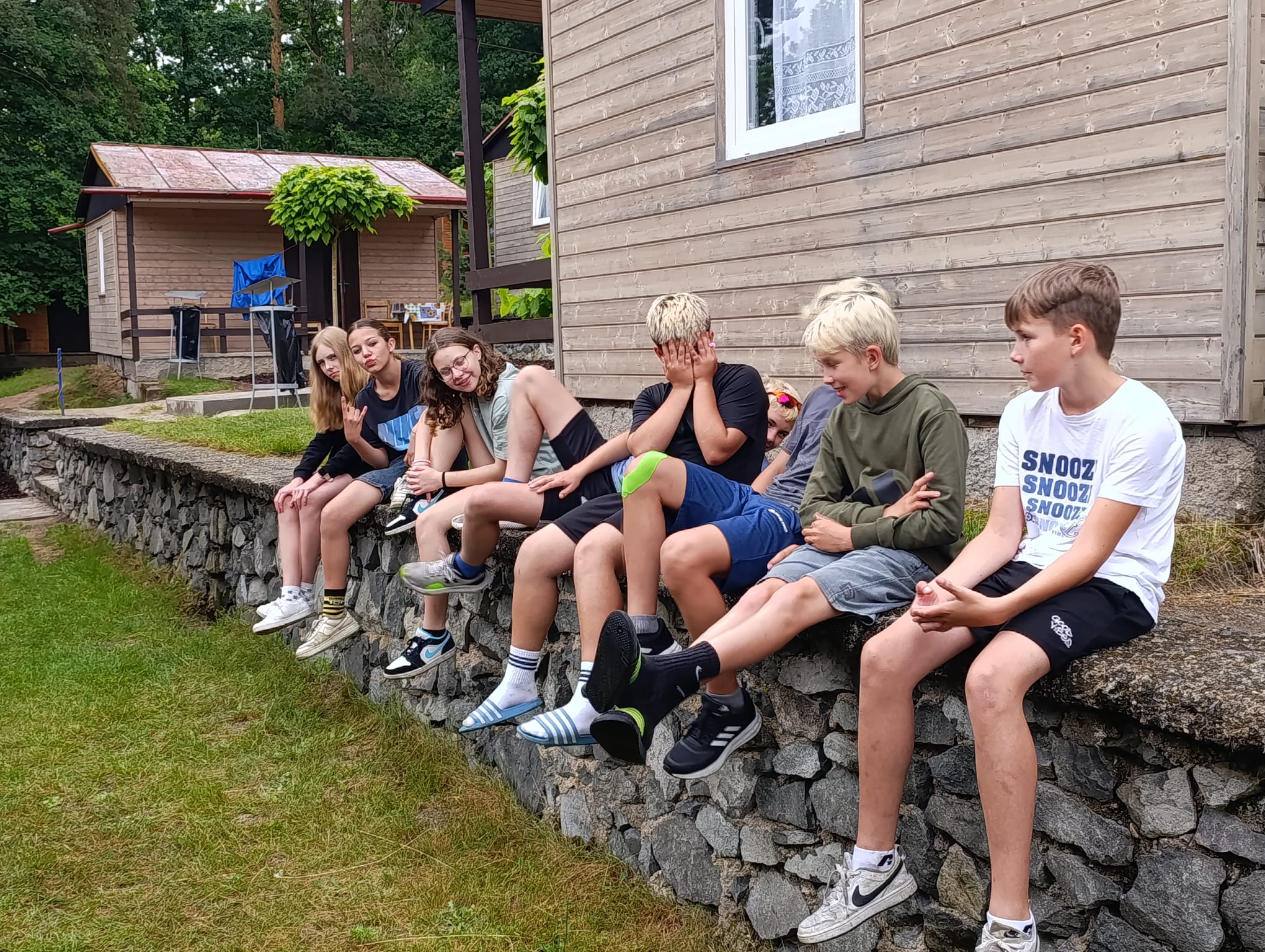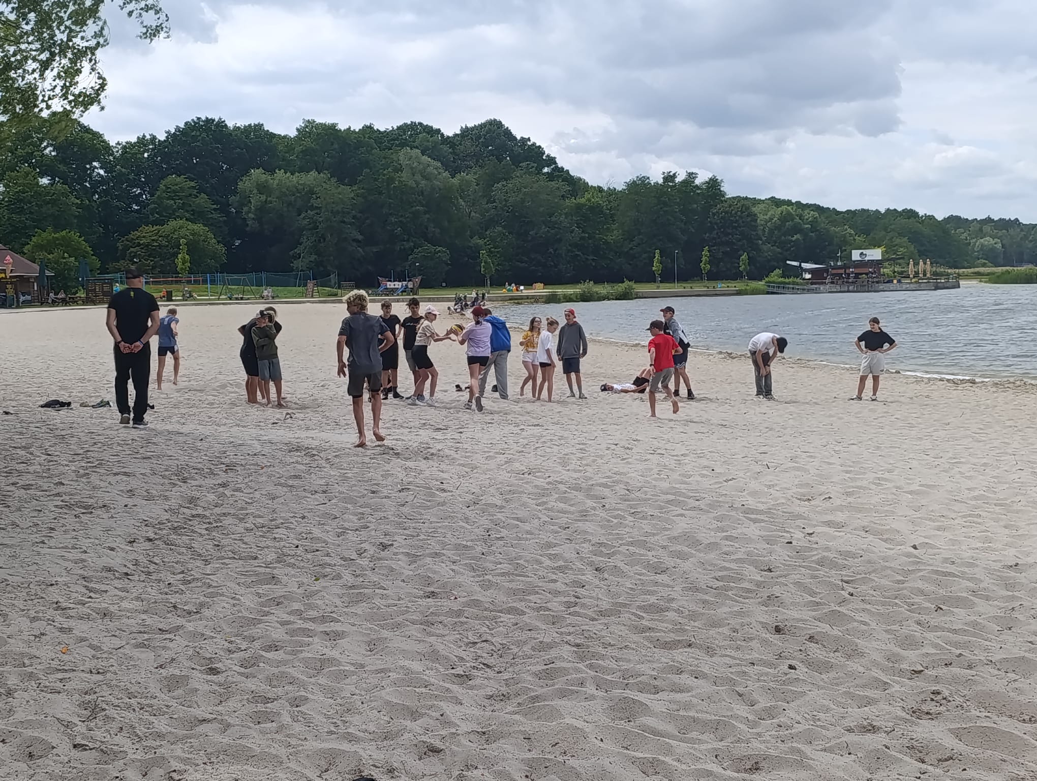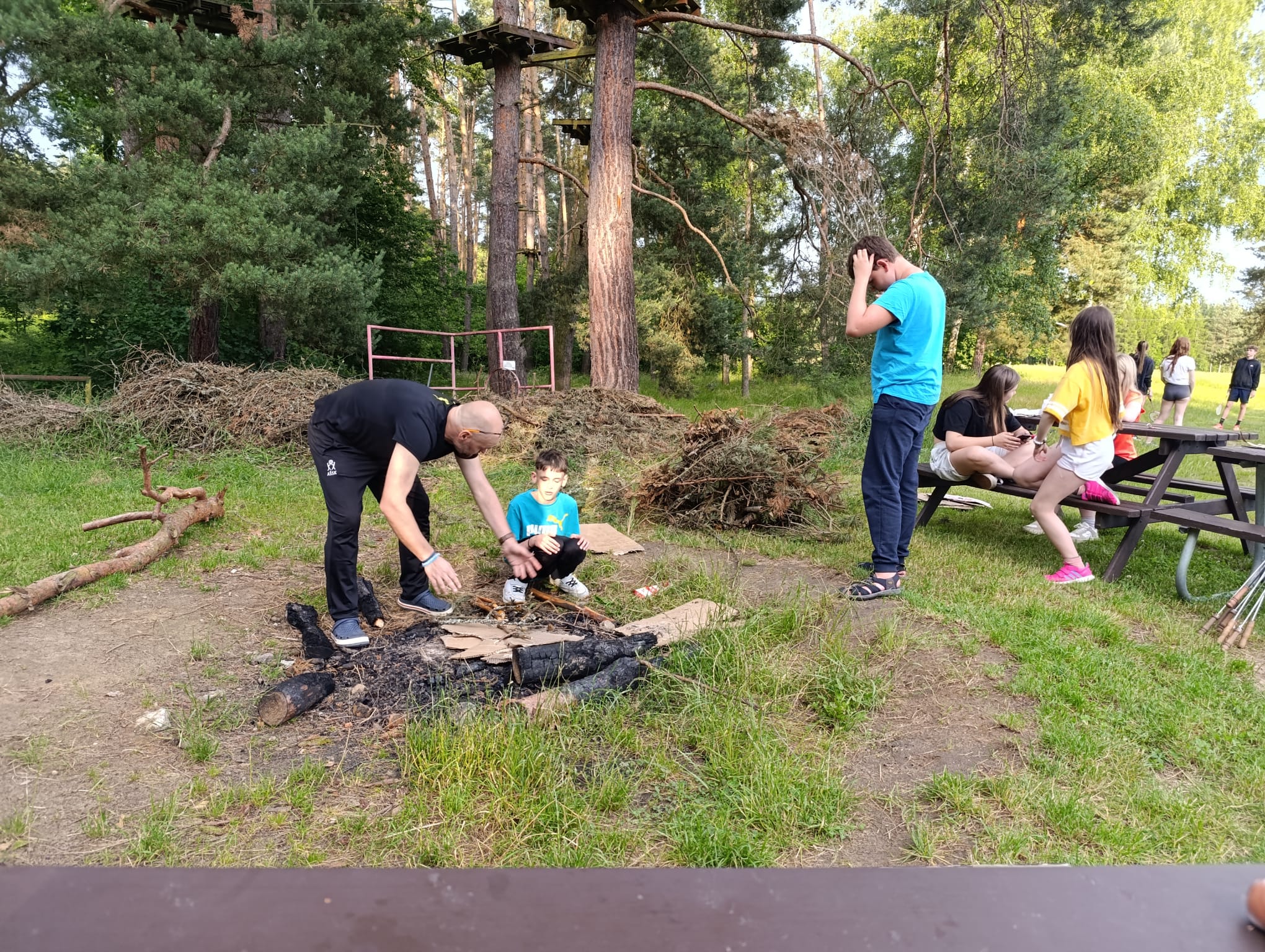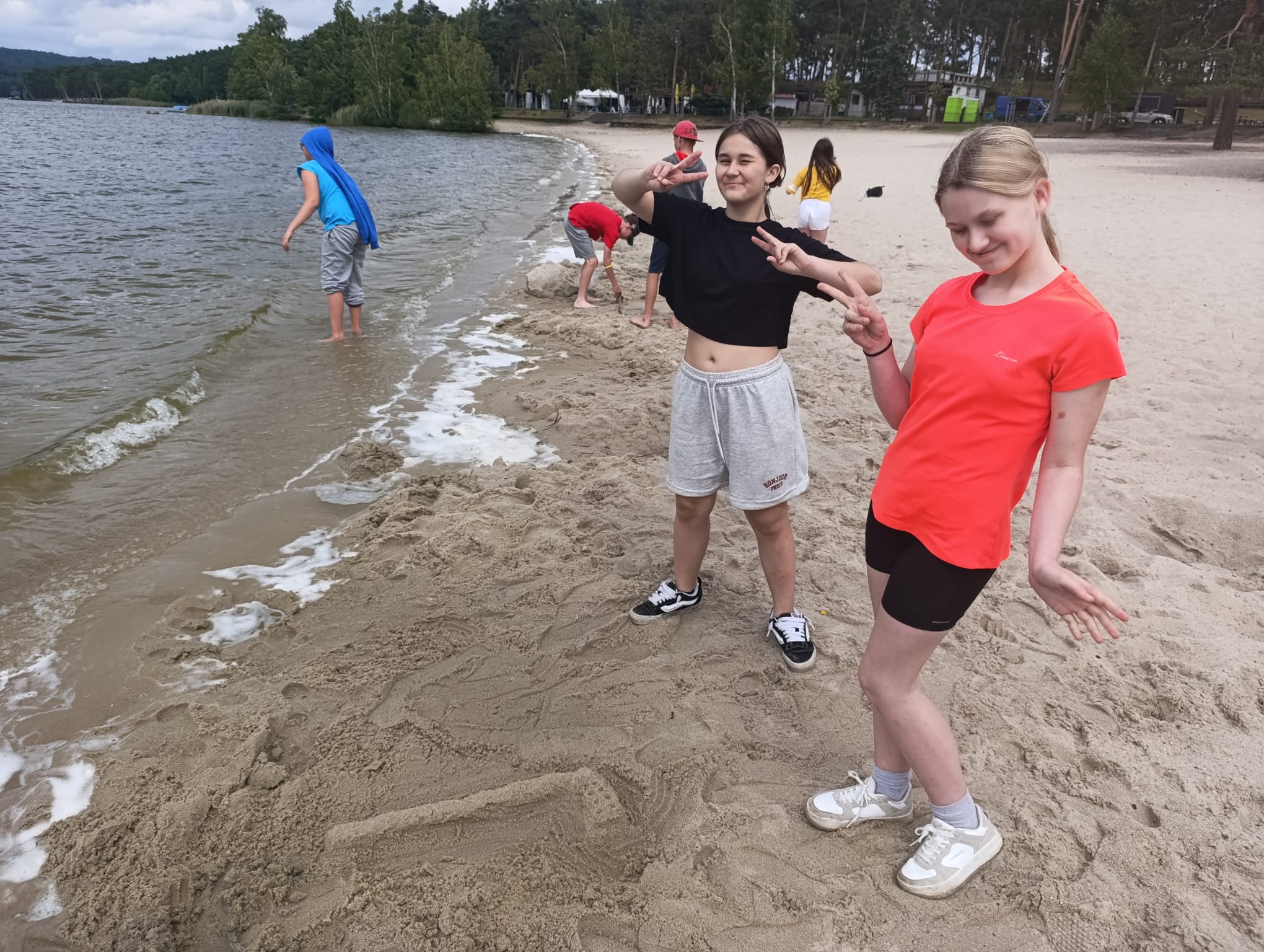 Po příchodu do areálu přestalo pršet a my se mohli po vybalení věcí a povlečení lůžkovin věnovat mnoha plánovaným i neplánovaným aktivitám. Bazén, beachvolejbalové kurty, hřiště na fotbal, pingpongové stoly, lezecká stěna, workoutové hřiště byly využity v plné míře. Po druhé hodině jsme si udělali procházku k Máchovu jezeru. Cestou jsme hráli několikrát „na medvěda“. Na hlavní pláži jsme pak soutěžili v písečných bězích a ve stavění přepychových staveb z písku. Odvážlivci se vykoupali v jezeře, někteří si zahráli beachvolejbal. Po příchodu jsme šli na večeři a poté jsme připravovali dřevo na večerní táborák. Plno z nás si opeklo všemožné buřtíky a klobásky.