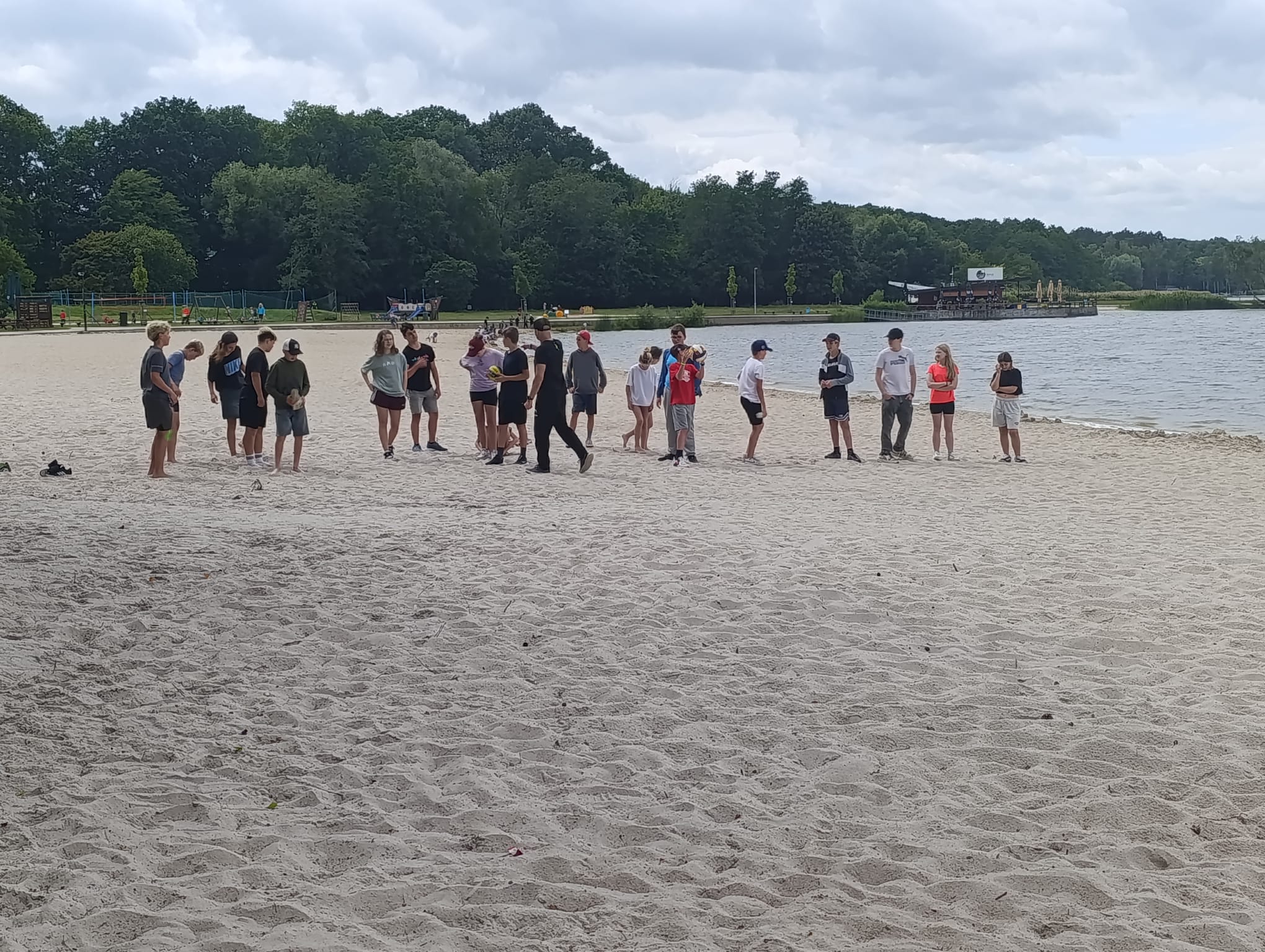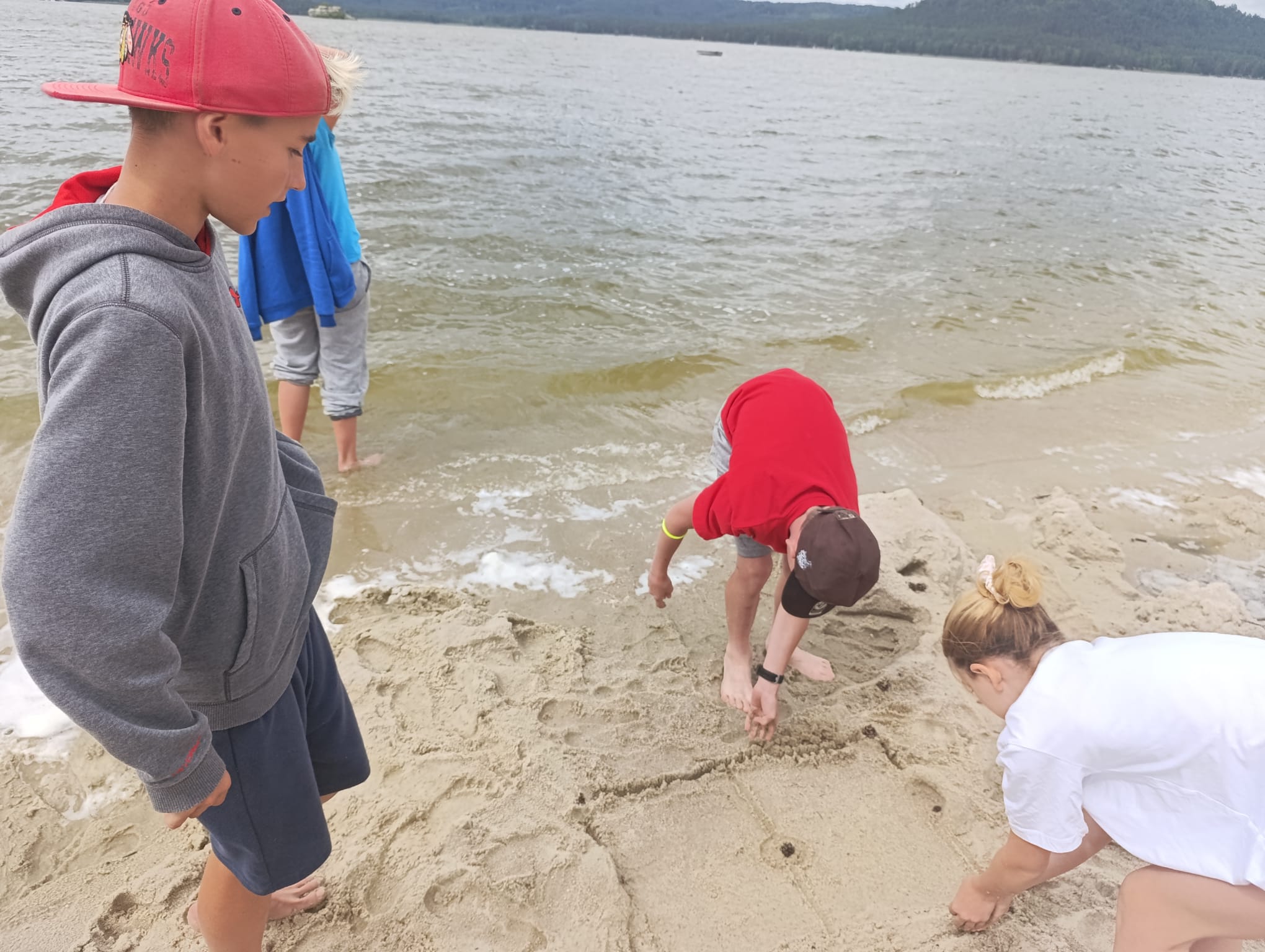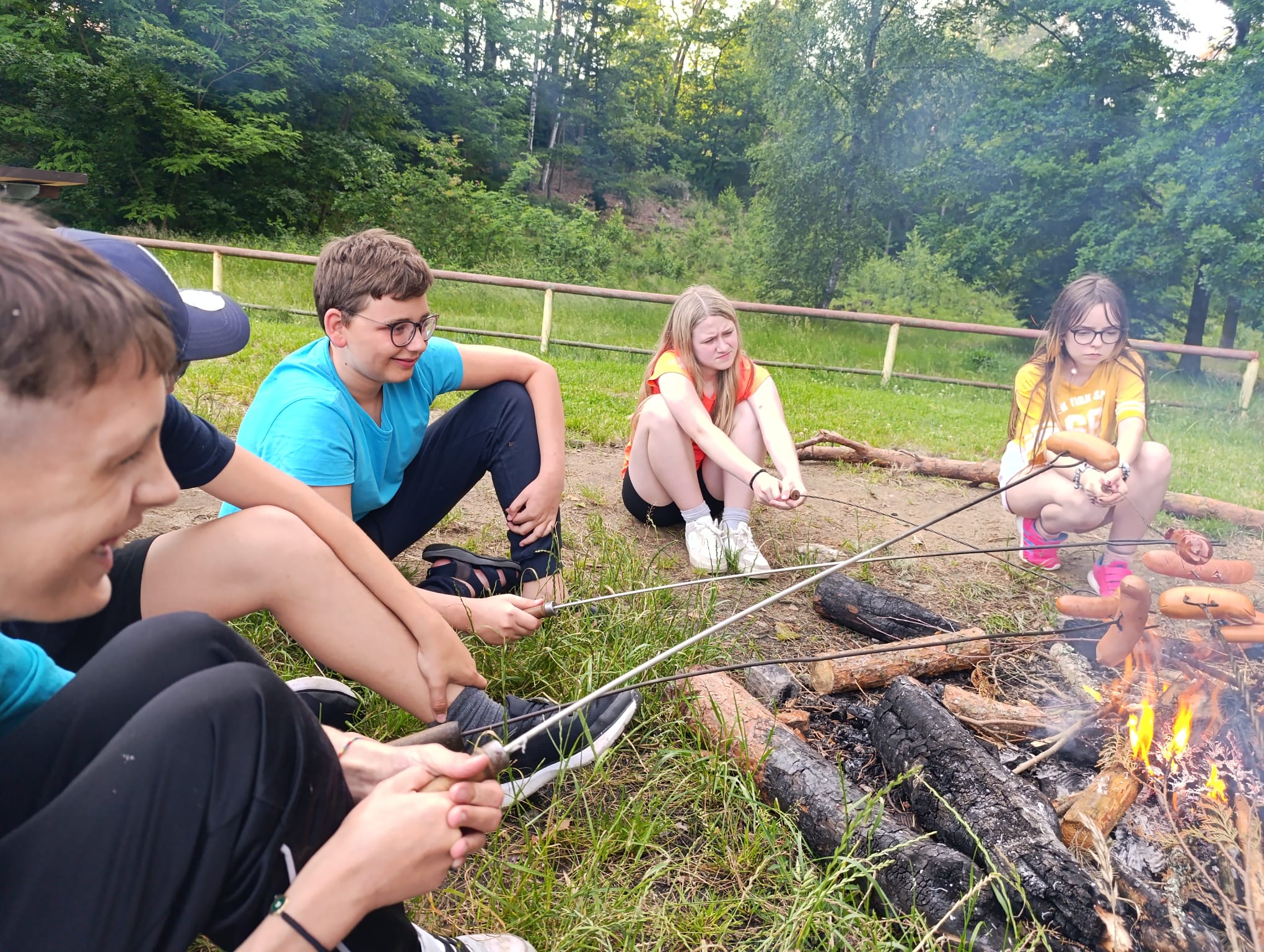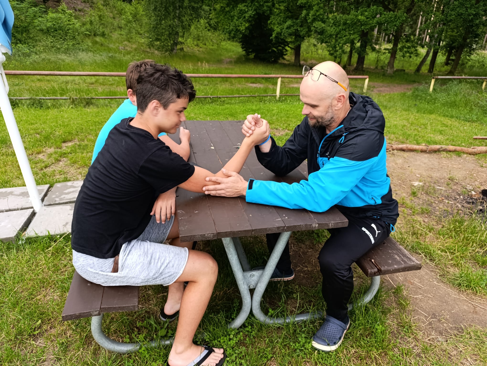 Po příchodu do areálu přestalo pršet a my se mohli po vybalení věcí a povlečení lůžkovin věnovat mnoha plánovaným i neplánovaným aktivitám. Bazén, beachvolejbalové kurty, hřiště na fotbal, pingpongové stoly, lezecká stěna, workoutové hřiště byly využity v plné míře. Po druhé hodině jsme si udělali procházku k Máchovu jezeru. Cestou jsme hráli několikrát „na medvěda“. Na hlavní pláži jsme pak soutěžili v písečných bězích a ve stavění přepychových staveb z písku. Odvážlivci se vykoupali v jezeře, někteří si zahráli beachvolejbal. Po příchodu jsme šli na večeři a poté jsme připravovali dřevo na večerní táborák. Plno z nás si opeklo všemožné buřtíky a klobásky.