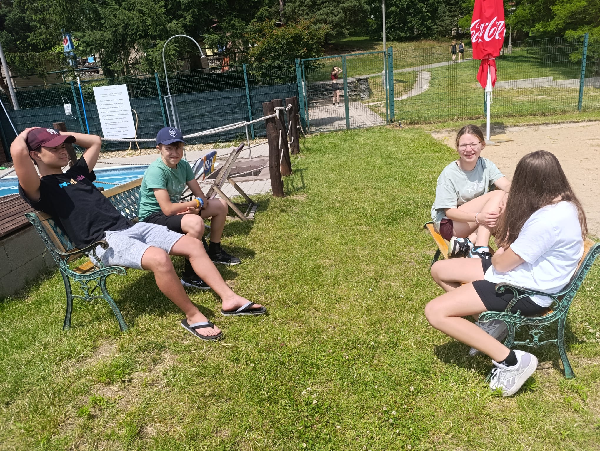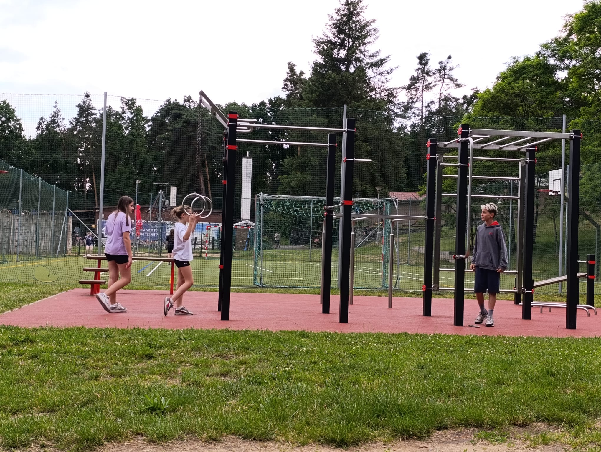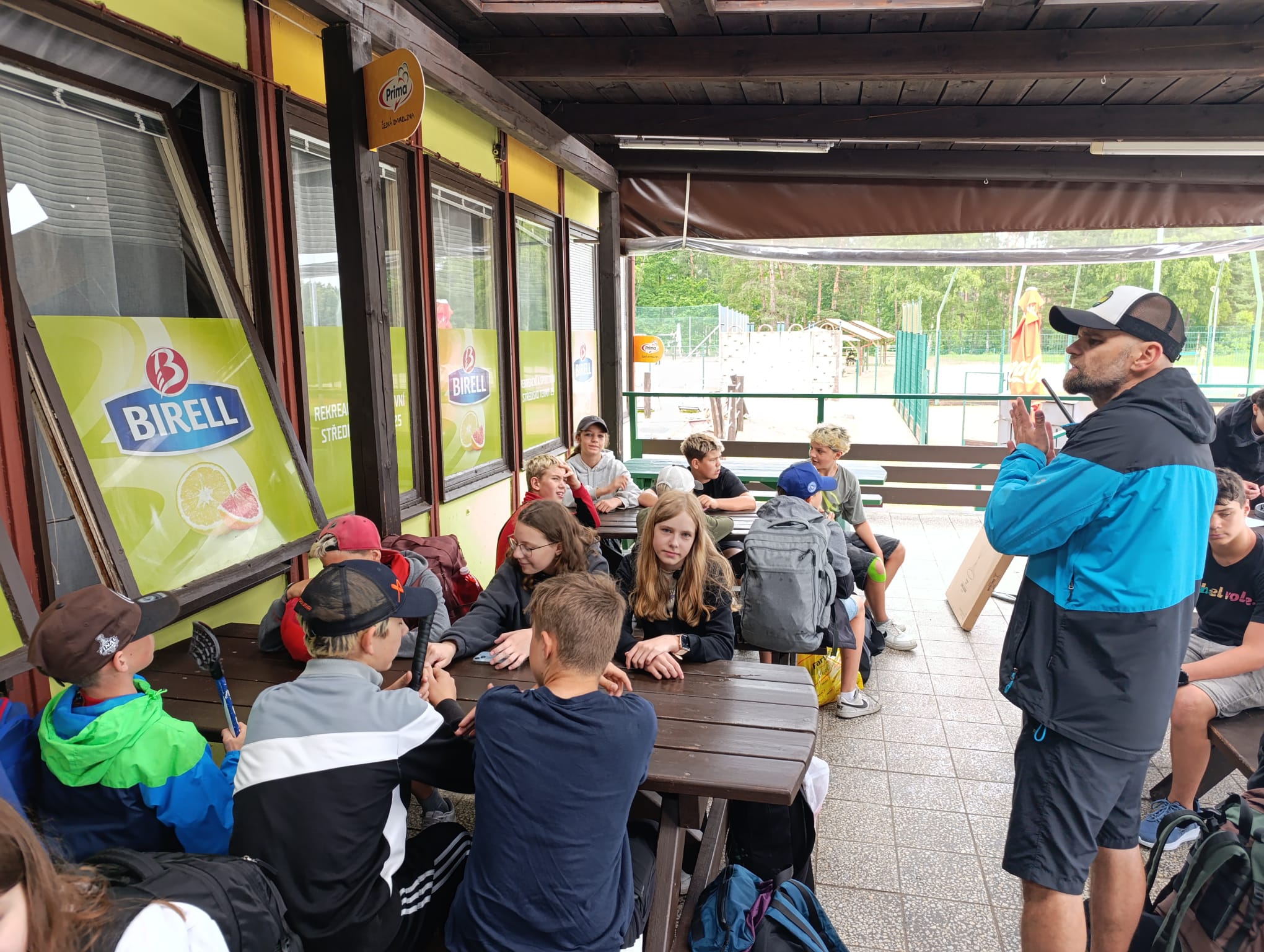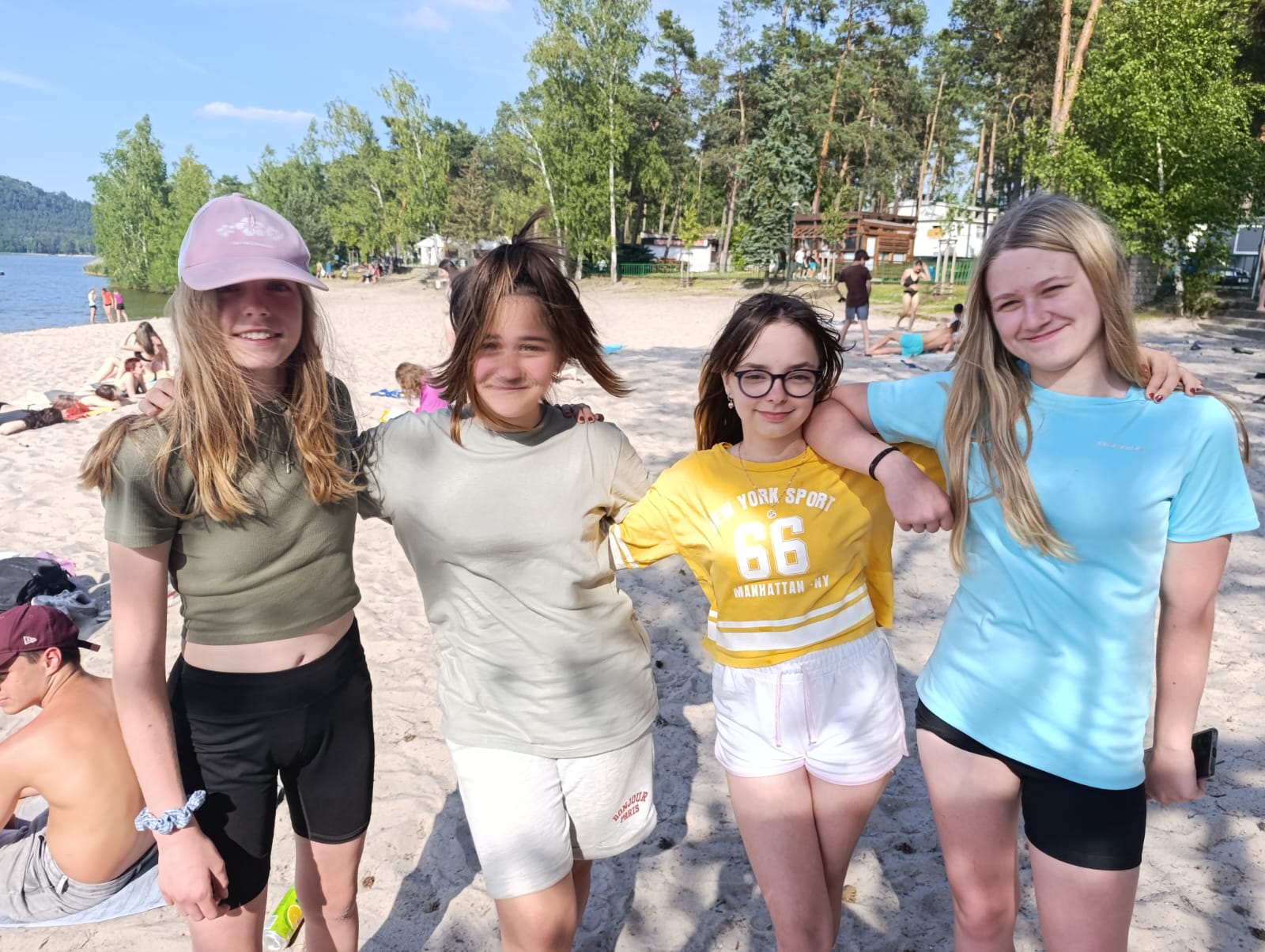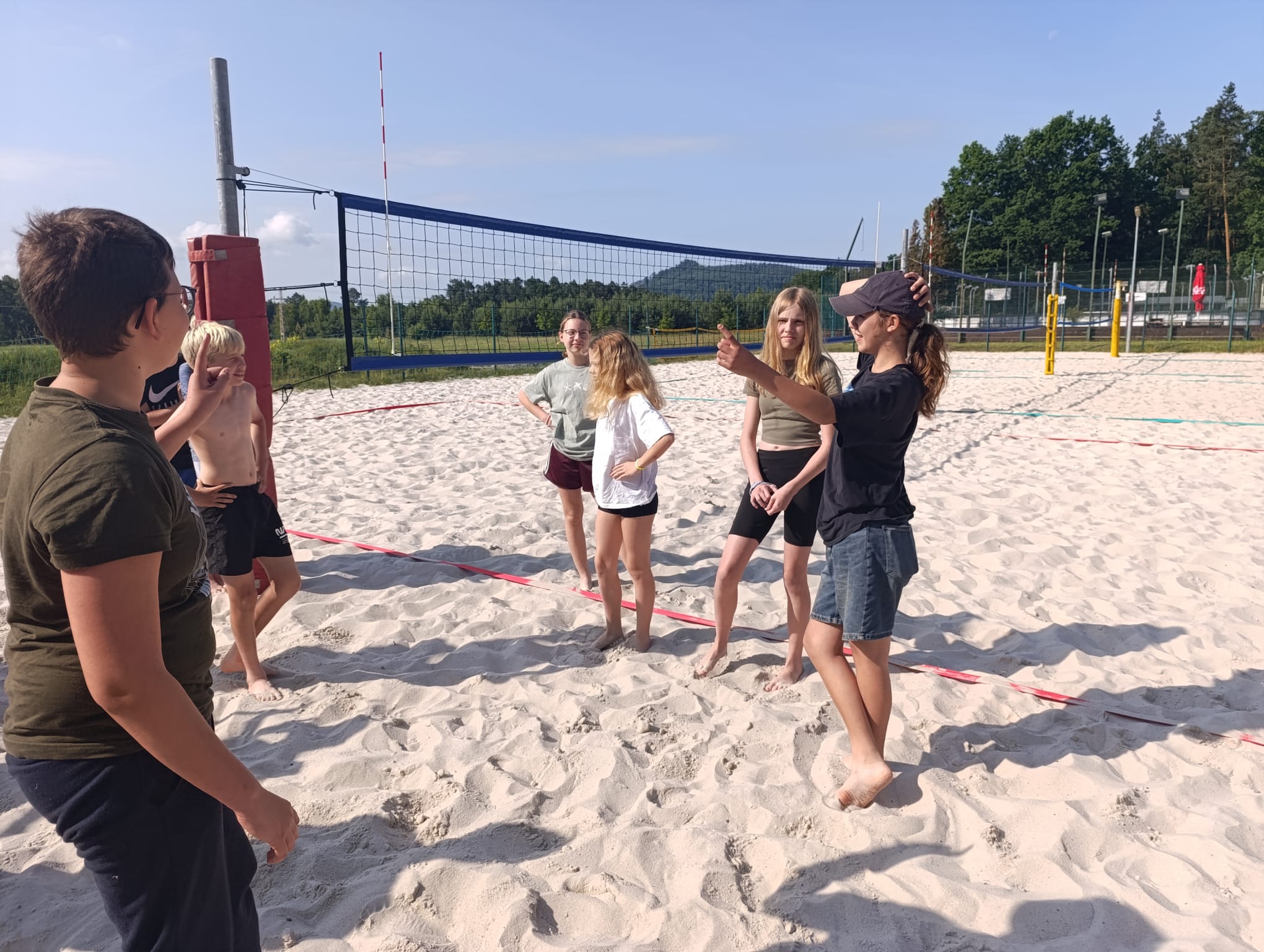 Po příchodu do areálu přestalo pršet a my se mohli po vybalení věcí a povlečení lůžkovin věnovat mnoha plánovaným i neplánovaným aktivitám. Bazén, beachvolejbalové kurty, hřiště na fotbal, pingpongové stoly, lezecká stěna, workoutové hřiště byly využity v plné míře. Po druhé hodině jsme si udělali procházku k Máchovu jezeru. Cestou jsme hráli několikrát „na medvěda“. Na hlavní pláži jsme pak soutěžili v písečných bězích a ve stavění přepychových staveb z písku. Odvážlivci se vykoupali v jezeře, někteří si zahráli beachvolejbal. Po příchodu jsme šli na večeři a poté jsme připravovali dřevo na večerní táborák. Plno z nás si opeklo všemožné buřtíky a klobásky.