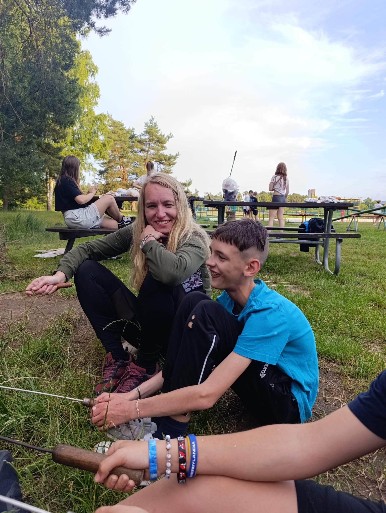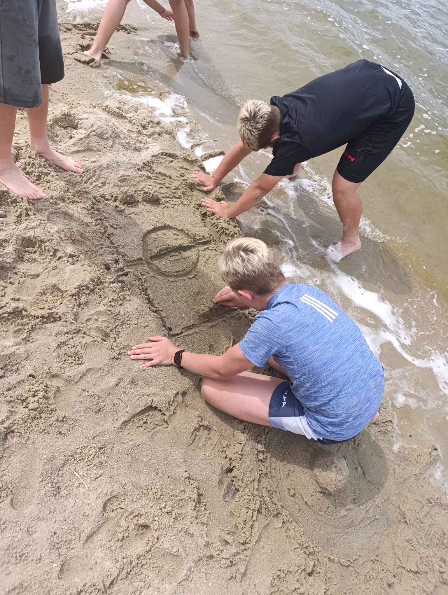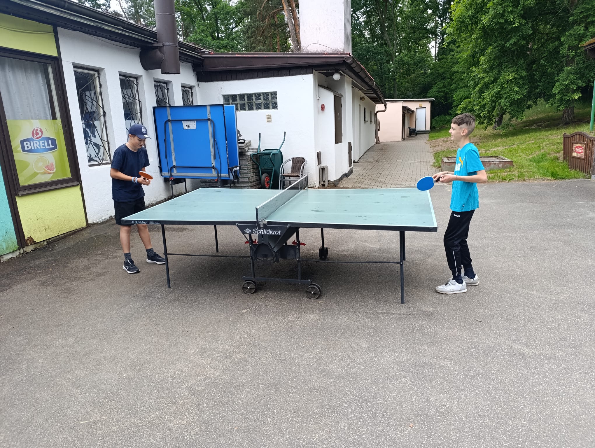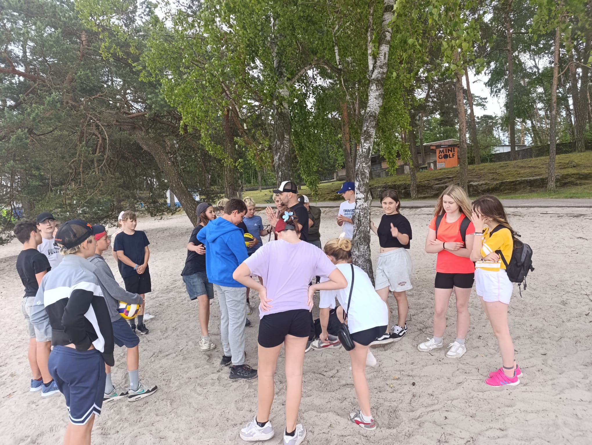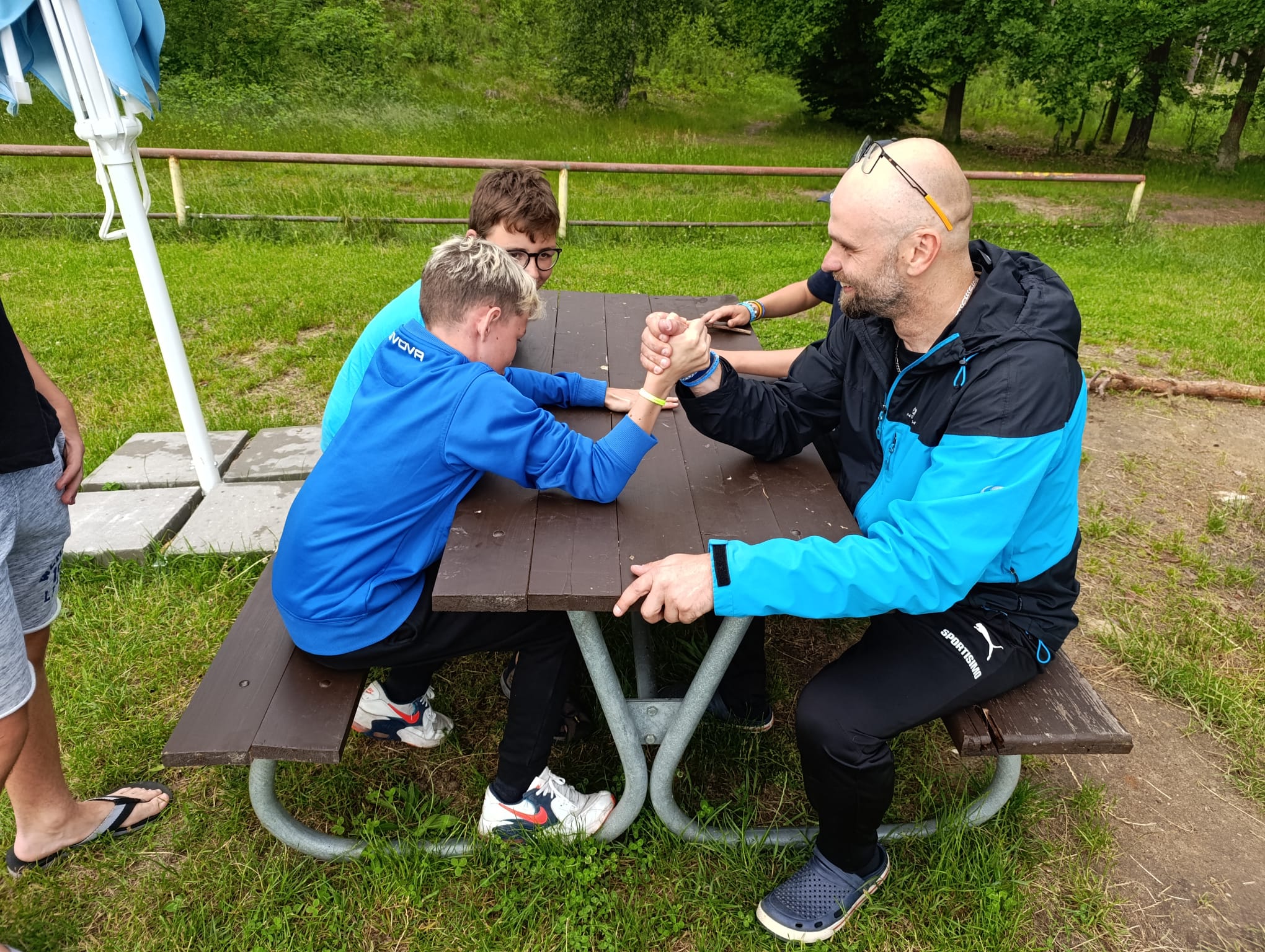 Po příchodu do areálu přestalo pršet a my se mohli po vybalení věcí a povlečení lůžkovin věnovat mnoha plánovaným i neplánovaným aktivitám. Bazén, beachvolejbalové kurty, hřiště na fotbal, pingpongové stoly, lezecká stěna, workoutové hřiště byly využity v plné míře. Po druhé hodině jsme si udělali procházku k Máchovu jezeru. Cestou jsme hráli několikrát „na medvěda“. Na hlavní pláži jsme pak soutěžili v písečných bězích a ve stavění přepychových staveb z písku. Odvážlivci se vykoupali v jezeře, někteří si zahráli beachvolejbal. Po příchodu jsme šli na večeři a poté jsme připravovali dřevo na večerní táborák. Plno z nás si opeklo všemožné buřtíky a klobásky.
