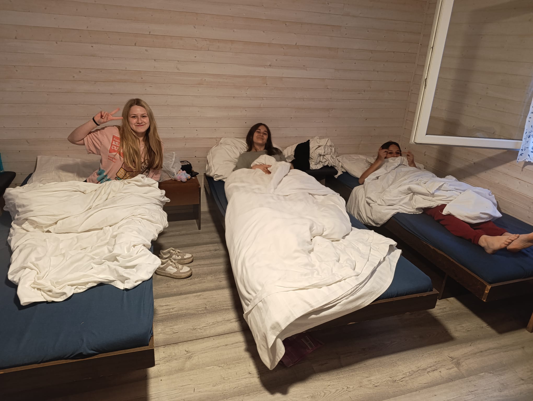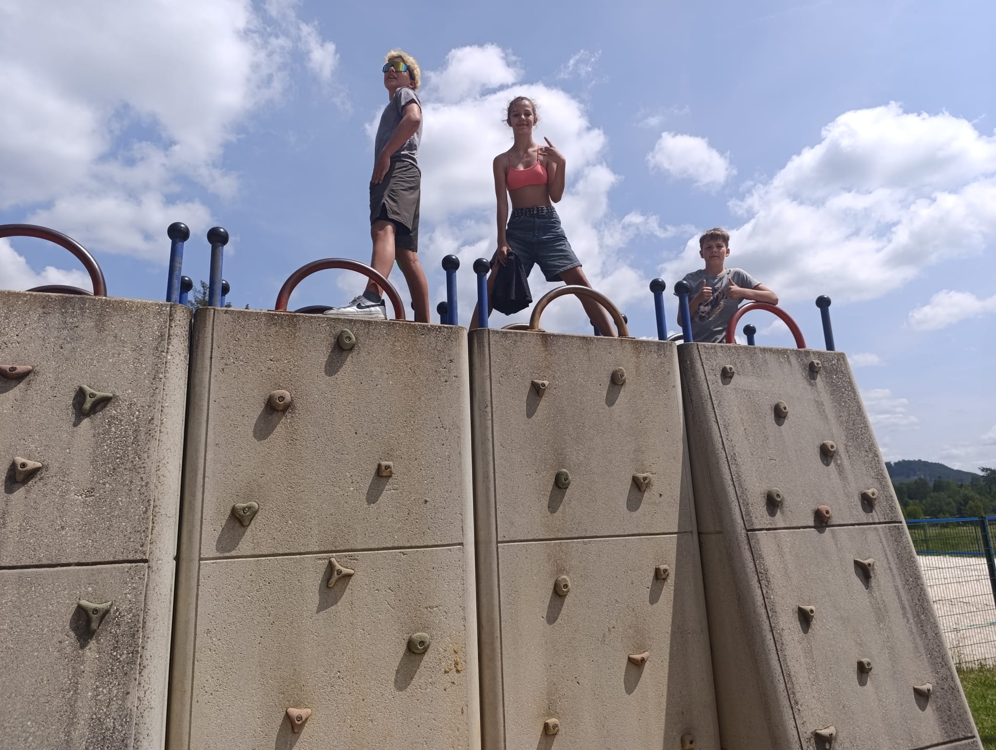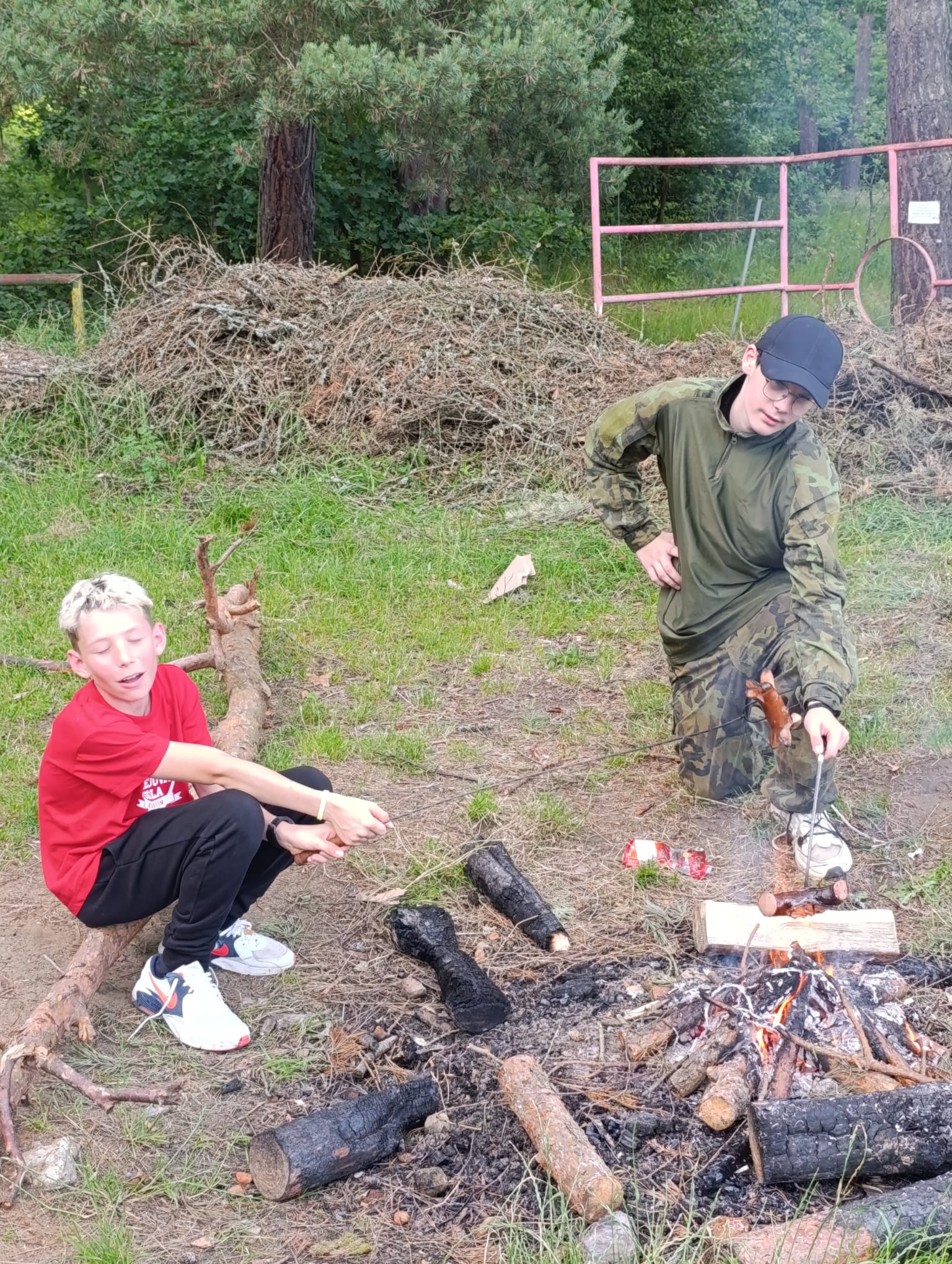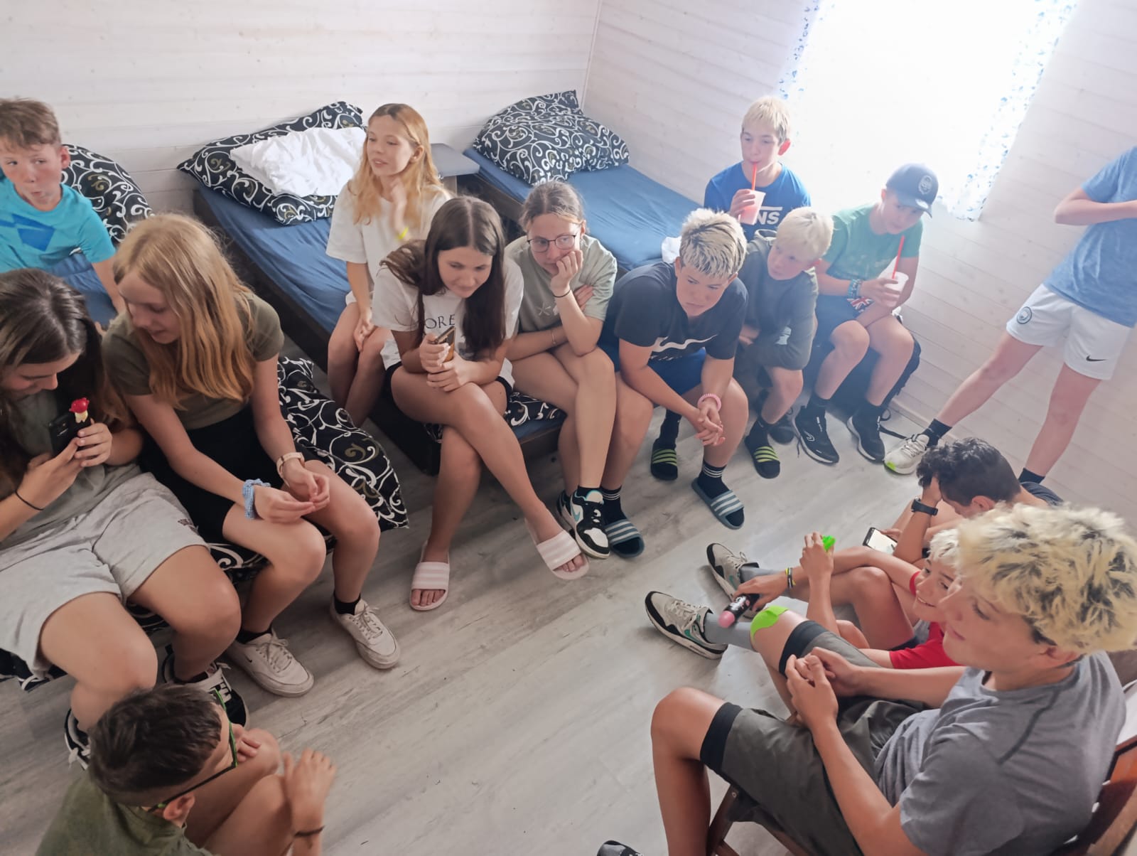 Po příchodu do areálu přestalo pršet a my se mohli po vybalení věcí a povlečení lůžkovin věnovat mnoha plánovaným i neplánovaným aktivitám. Bazén, beachvolejbalové kurty, hřiště na fotbal, pingpongové stoly, lezecká stěna, workoutové hřiště byly využity v plné míře. Po druhé hodině jsme si udělali procházku k Máchovu jezeru. Cestou jsme hráli několikrát „na medvěda“. Na hlavní pláži jsme pak soutěžili v písečných bězích a ve stavění přepychových staveb z písku. Odvážlivci se vykoupali v jezeře, někteří si zahráli beachvolejbal. Po příchodu jsme šli na večeři a poté jsme připravovali dřevo na večerní táborák. Plno z nás si opeklo všemožné buřtíky a klobásky.