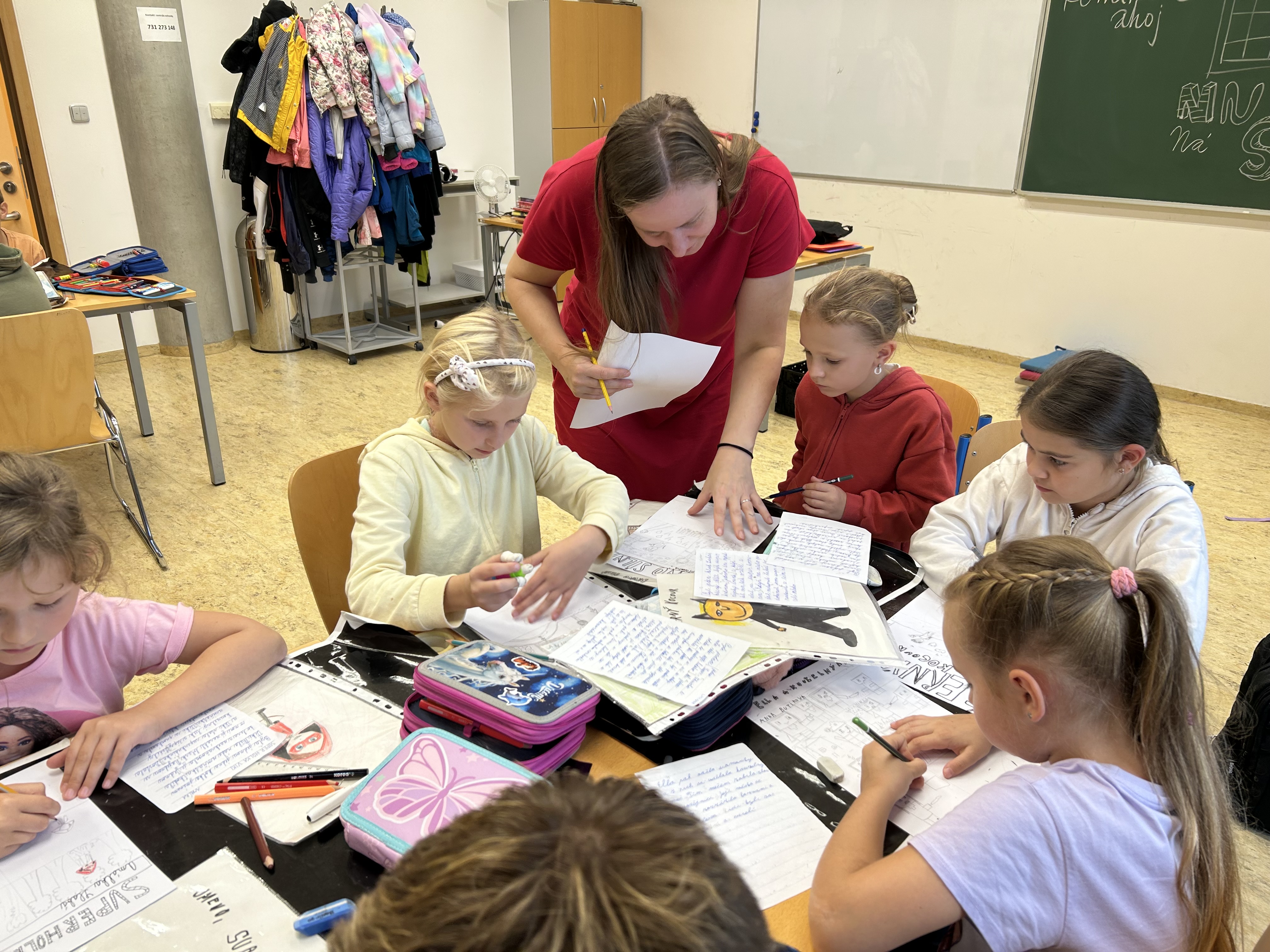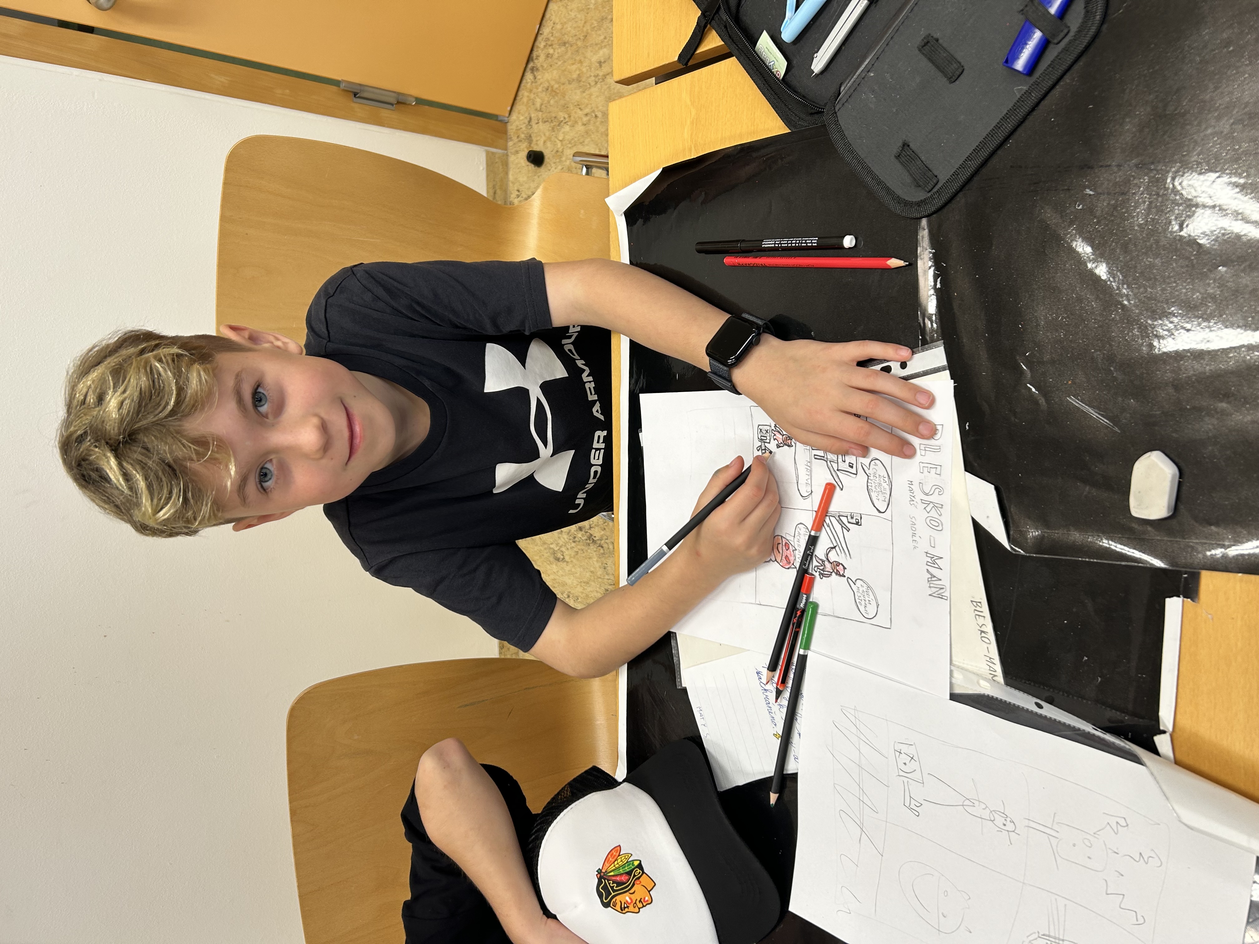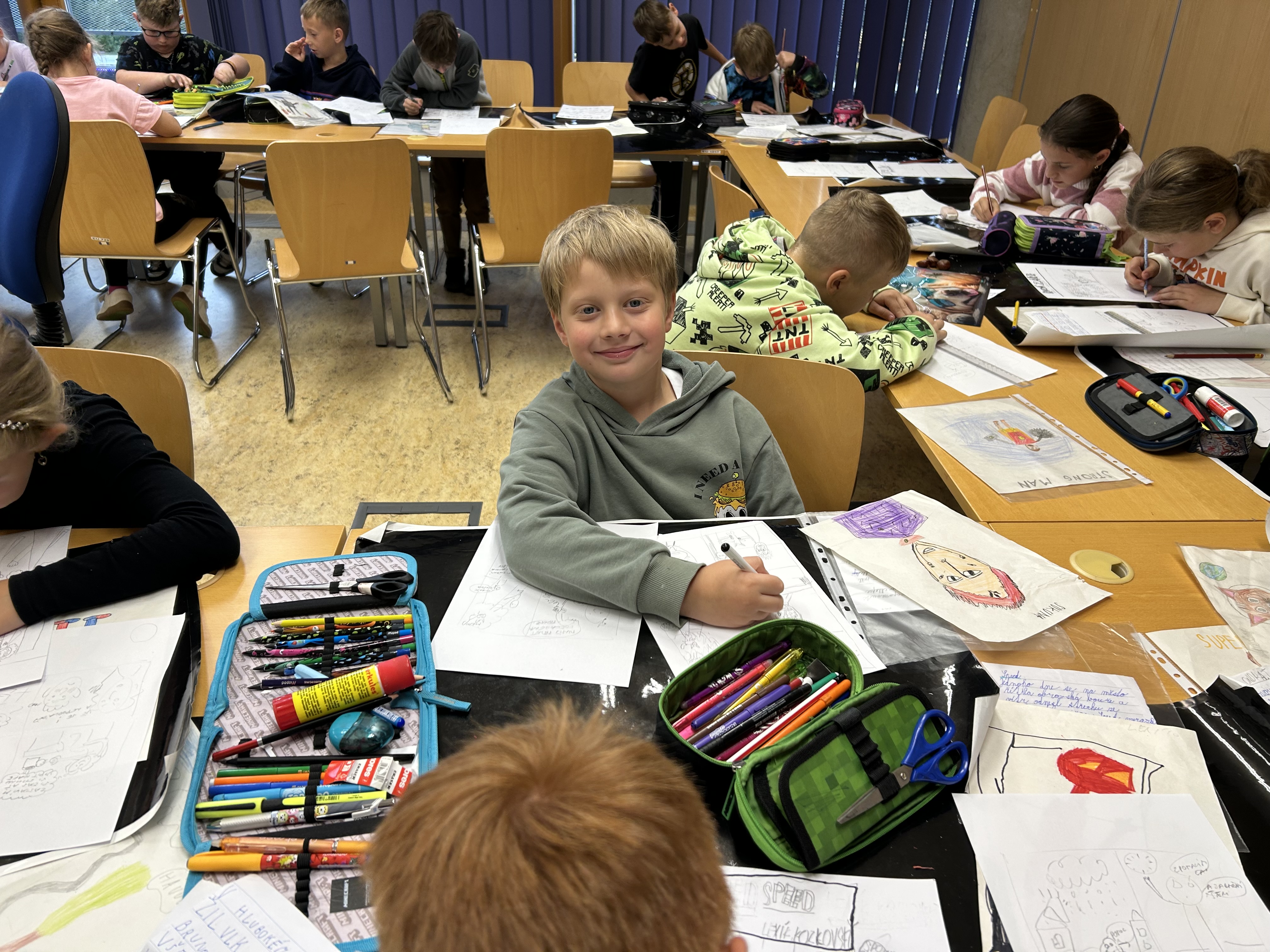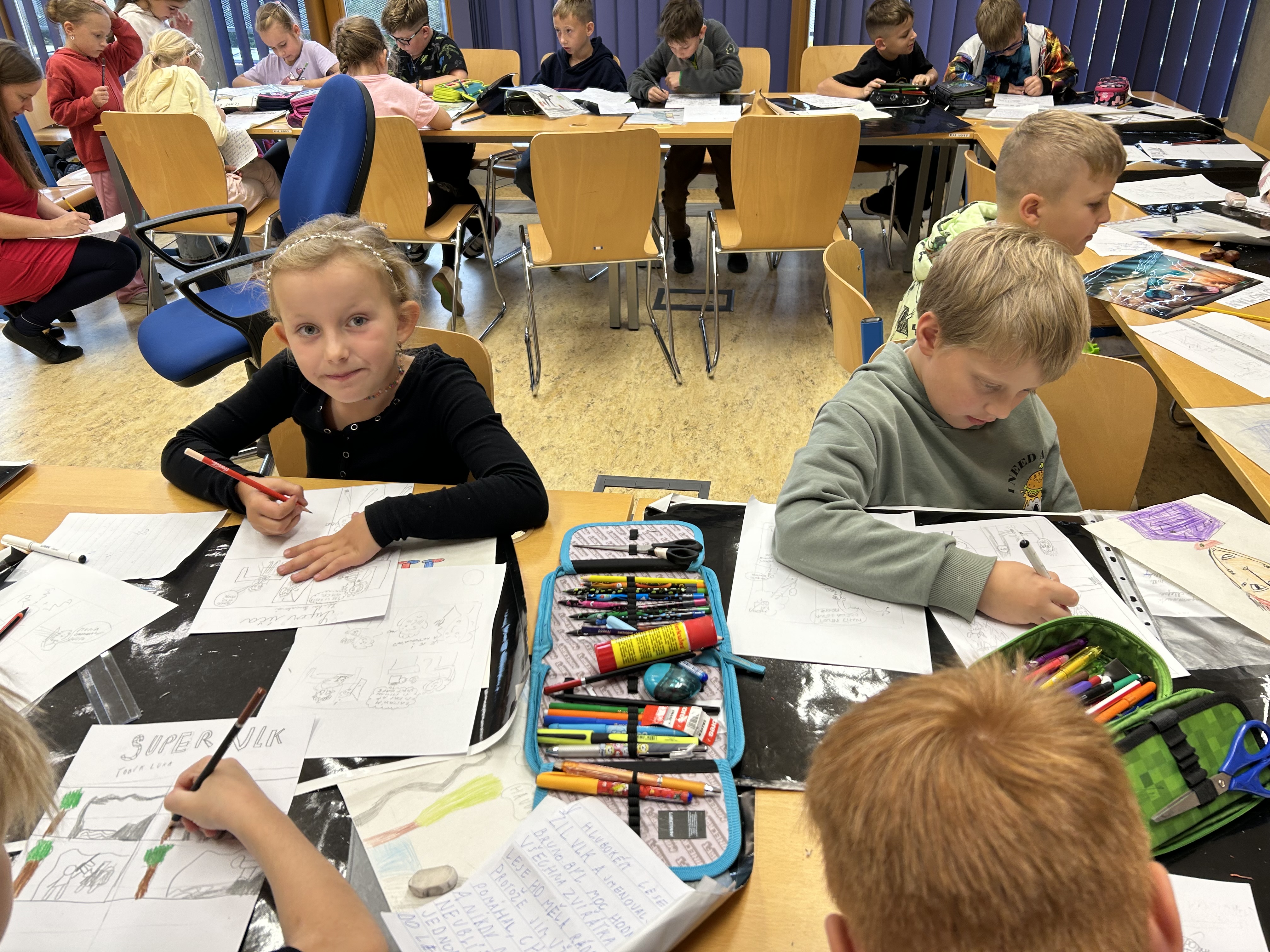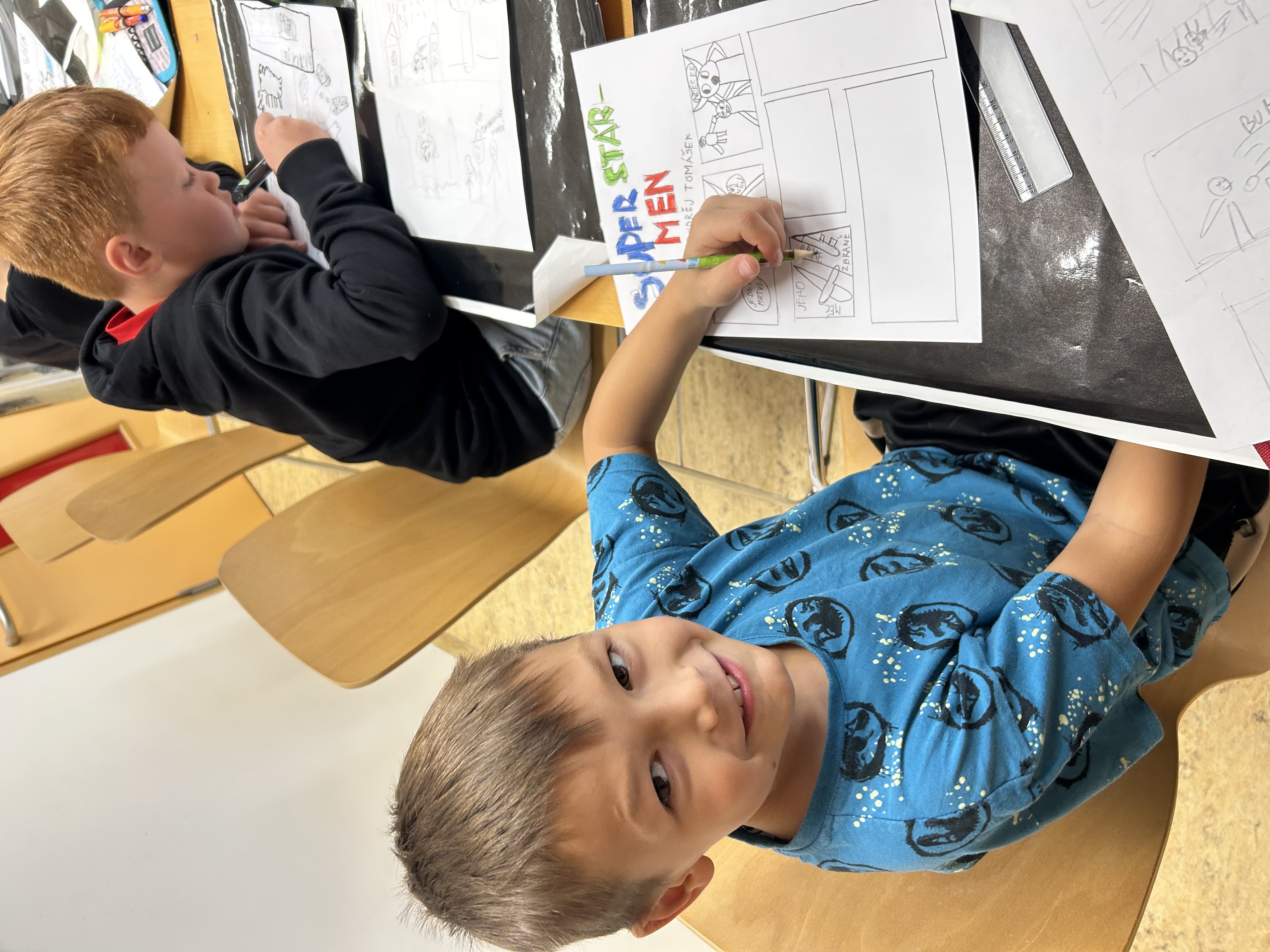 Děti si přinesly obrázek svého superhrdiny a krátký scénář k příběhu, který budou tvořit.