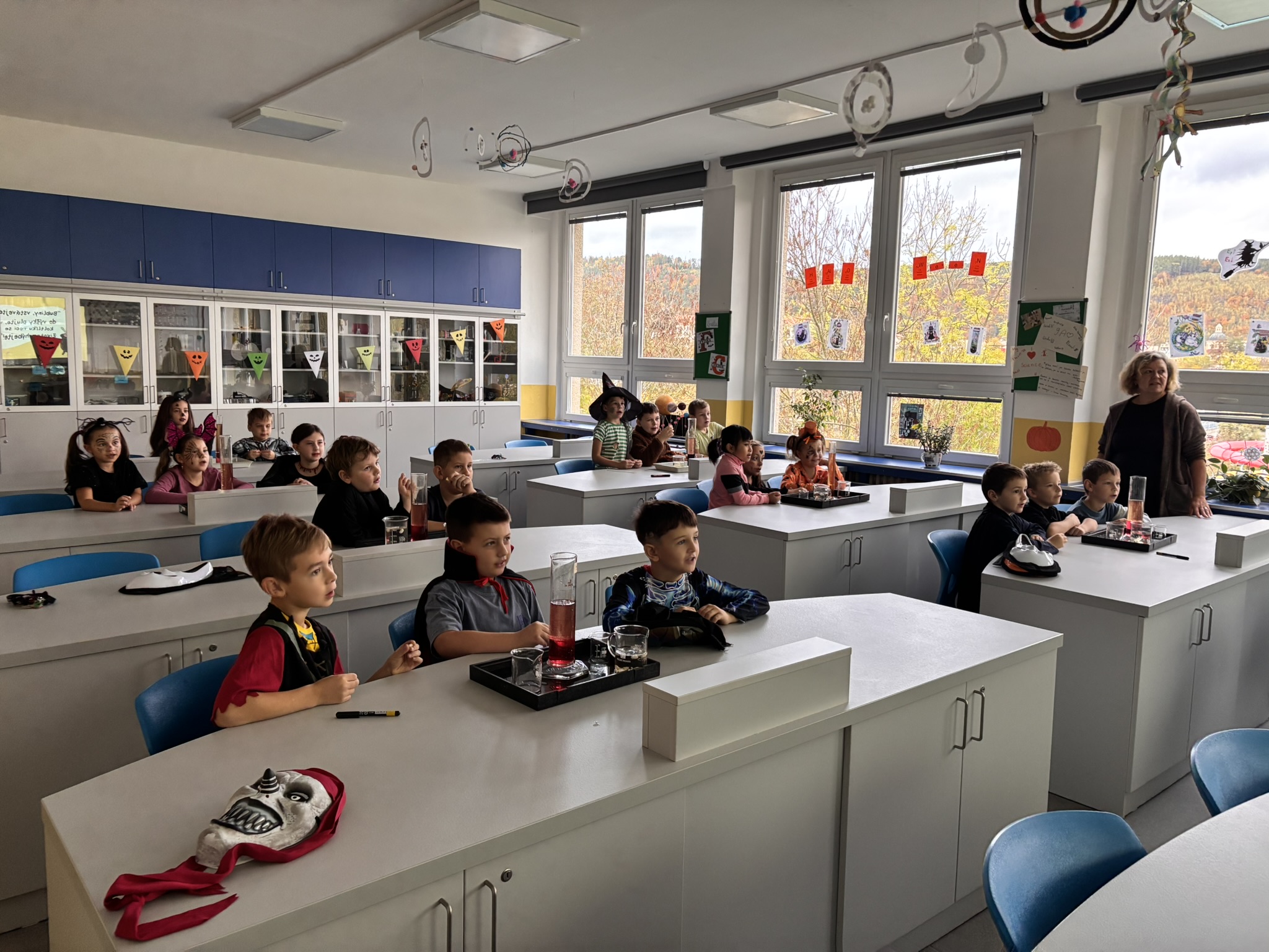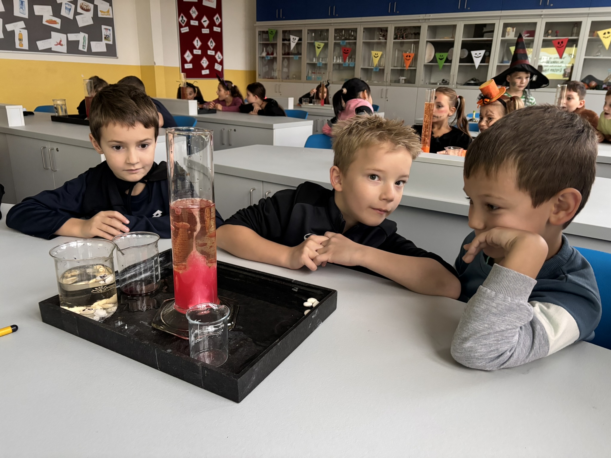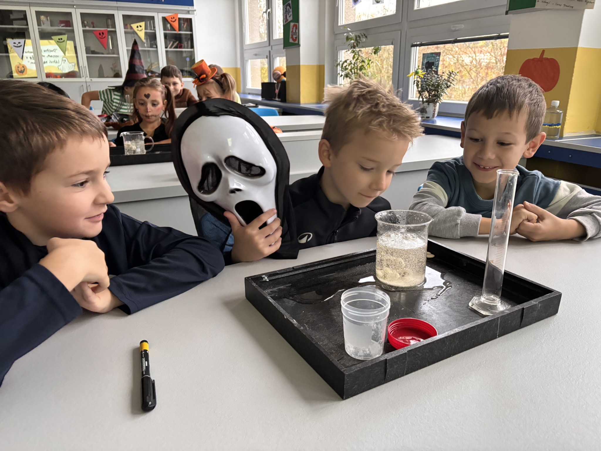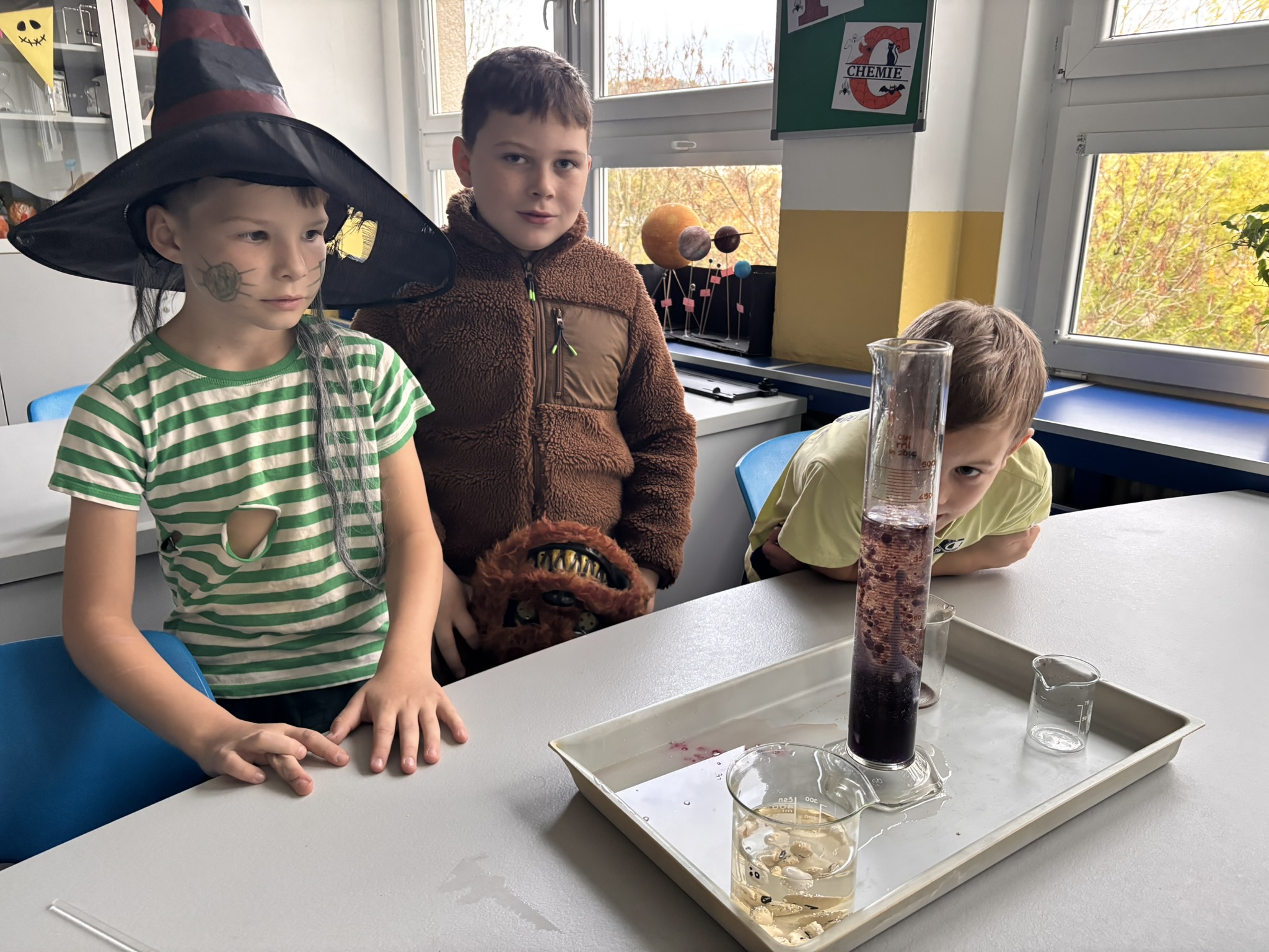 Tematické dopoledne jsme zahájili na 2.stupni v učebně fyziky, kde si děti pod vedením paní učitelky Jany Kozlovskyi zahrály na malé badatele. Vyzkoušely si kouzlo s bublajícími fazolemi, prokoukly tajemství tajemného obrázku a nakonec si vyzkoušely, jak vyrobit lávovou lampu.