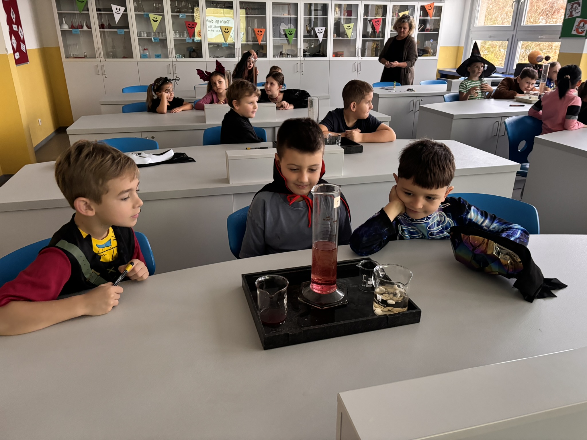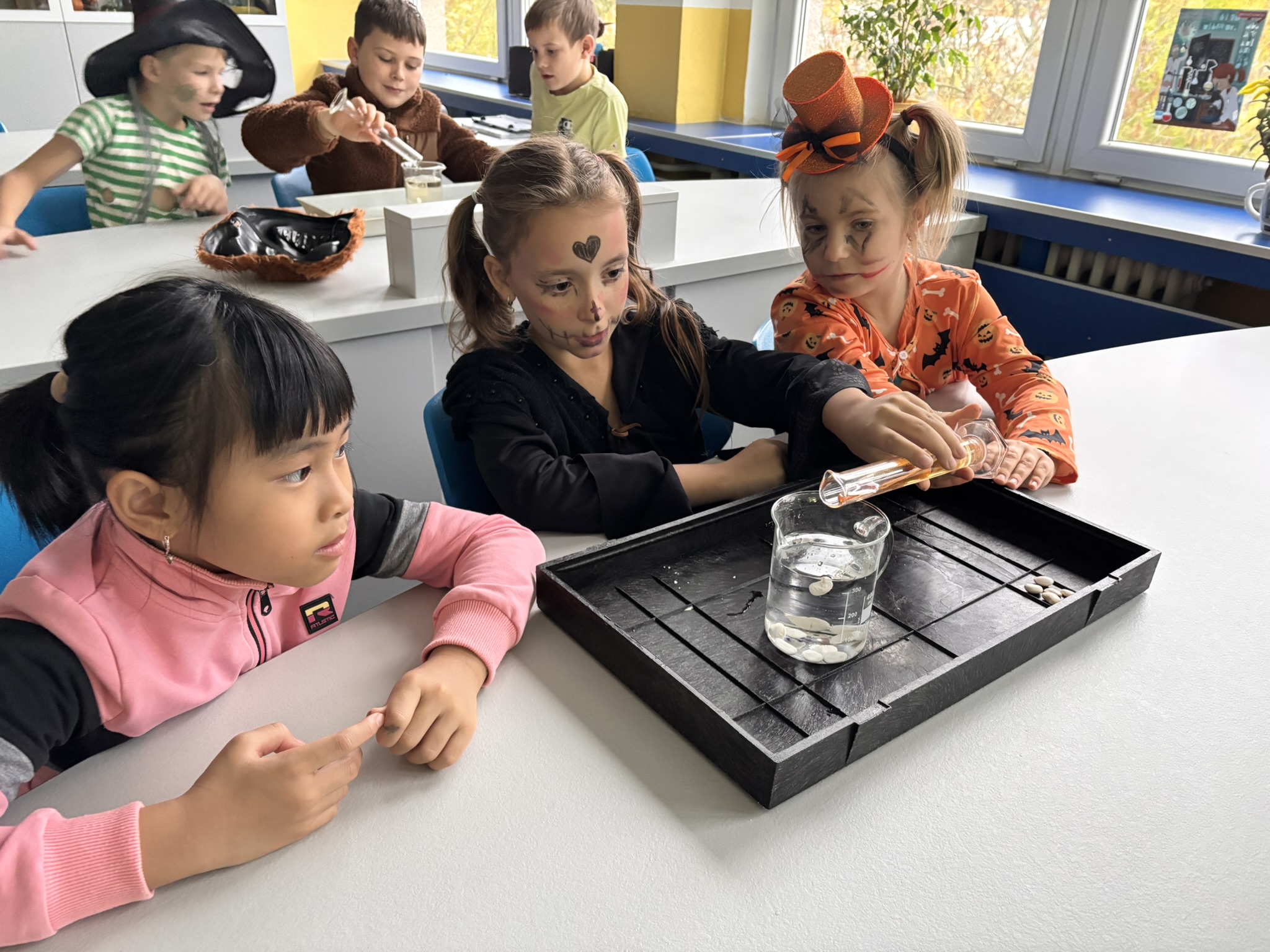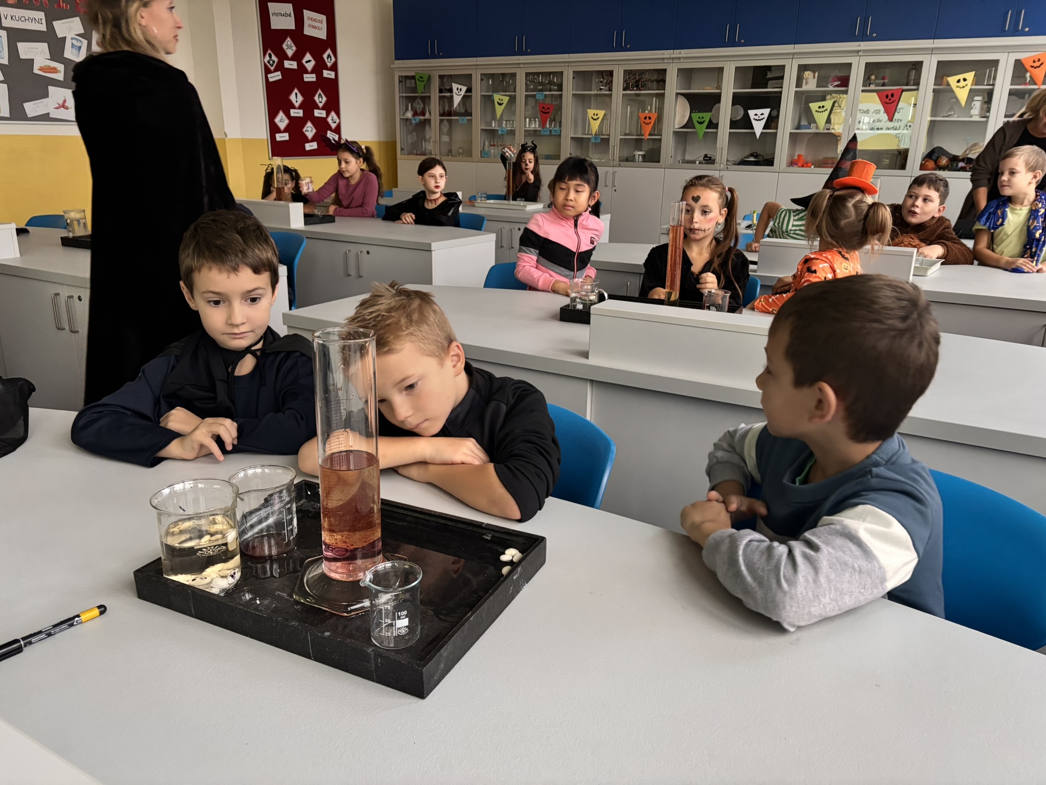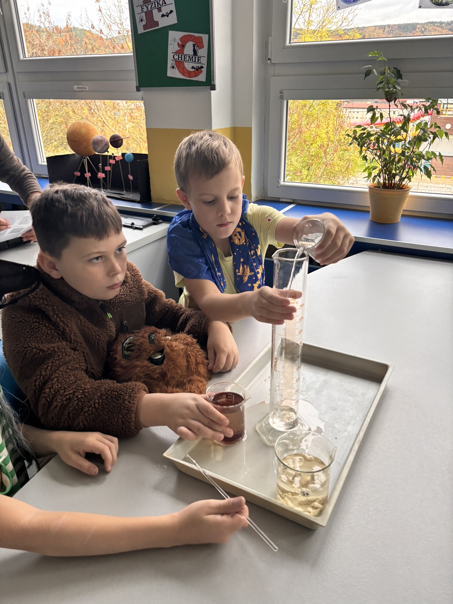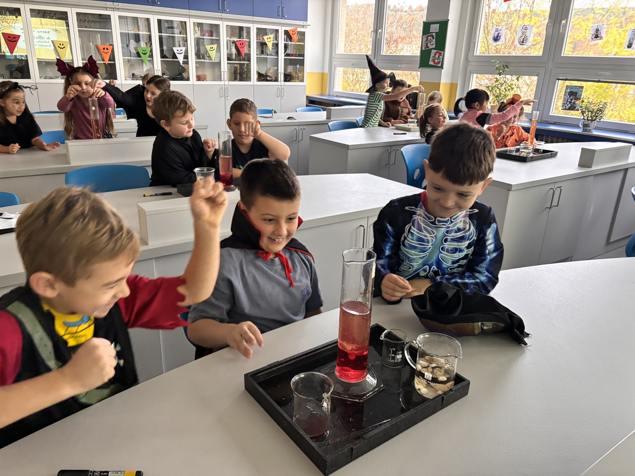 Tematické dopoledne jsme zahájili na 2.stupni v učebně fyziky, kde si děti pod vedením paní učitelky Jany Kozlovskyi zahrály na malé badatele. Vyzkoušely si kouzlo s bublajícími fazolemi, prokoukly tajemství tajemného obrázku a nakonec si vyzkoušely, jak vyrobit lávovou lampu.