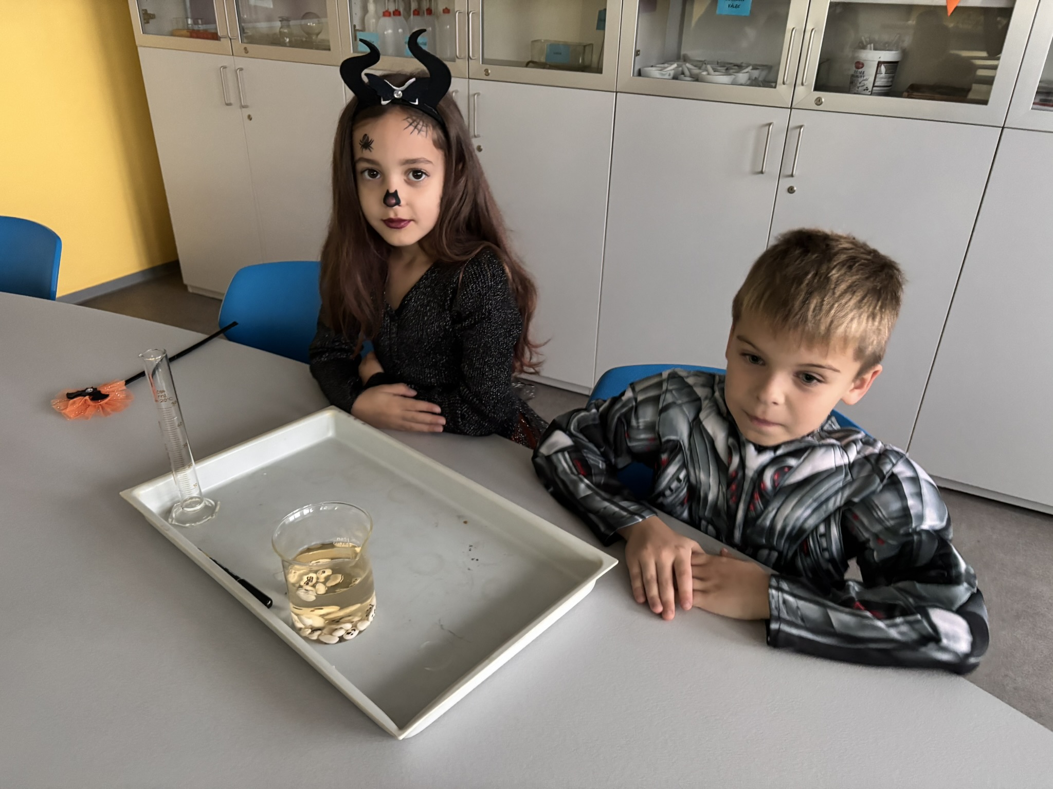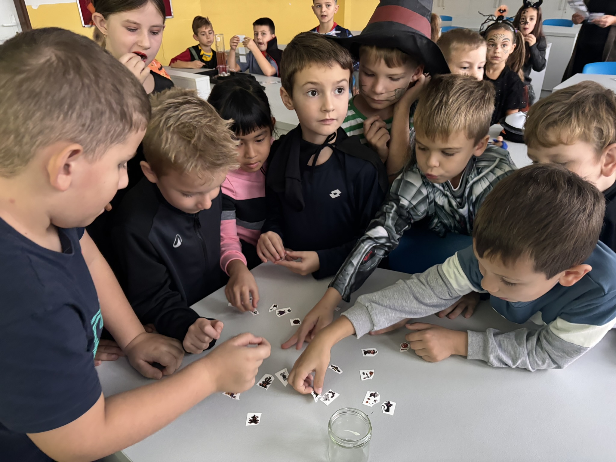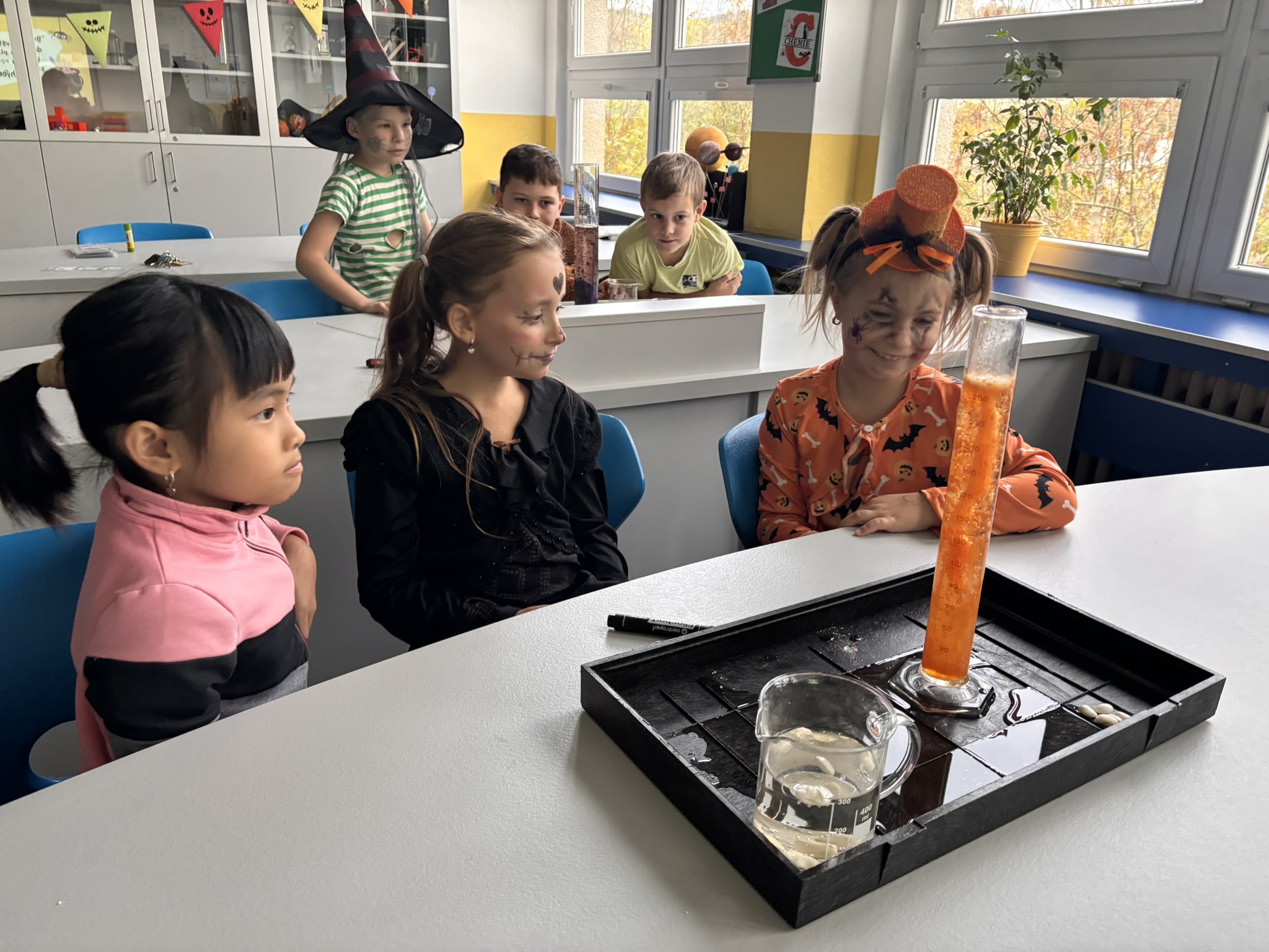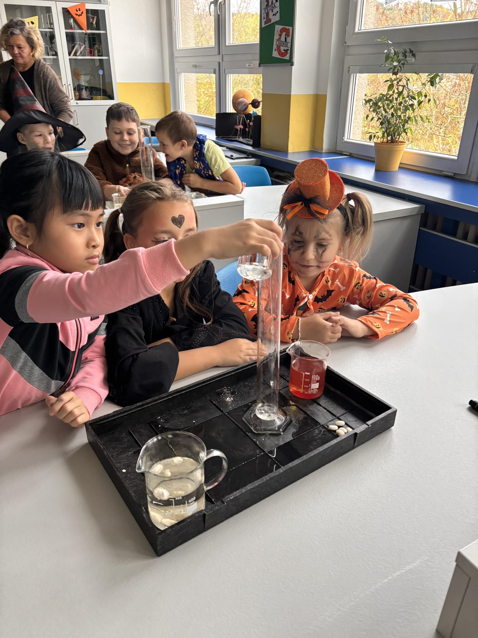 Tematické dopoledne jsme zahájili na 2.stupni v učebně fyziky, kde si děti pod vedením paní učitelky Jany Kozlovskyi zahrály na malé badatele. Vyzkoušely si kouzlo s bublajícími fazolemi, prokoukly tajemství tajemného obrázku a nakonec si vyzkoušely, jak vyrobit lávovou lampu.