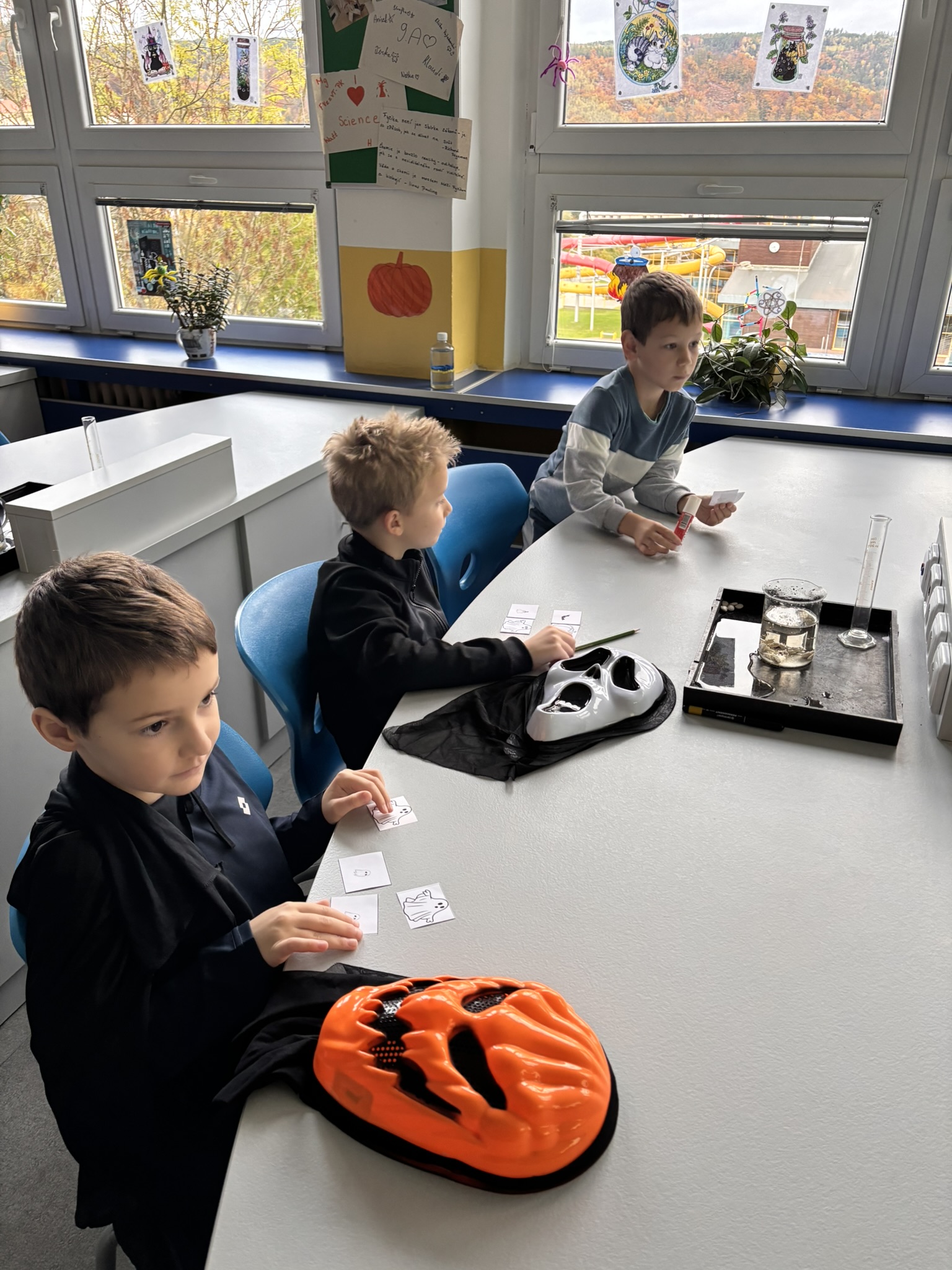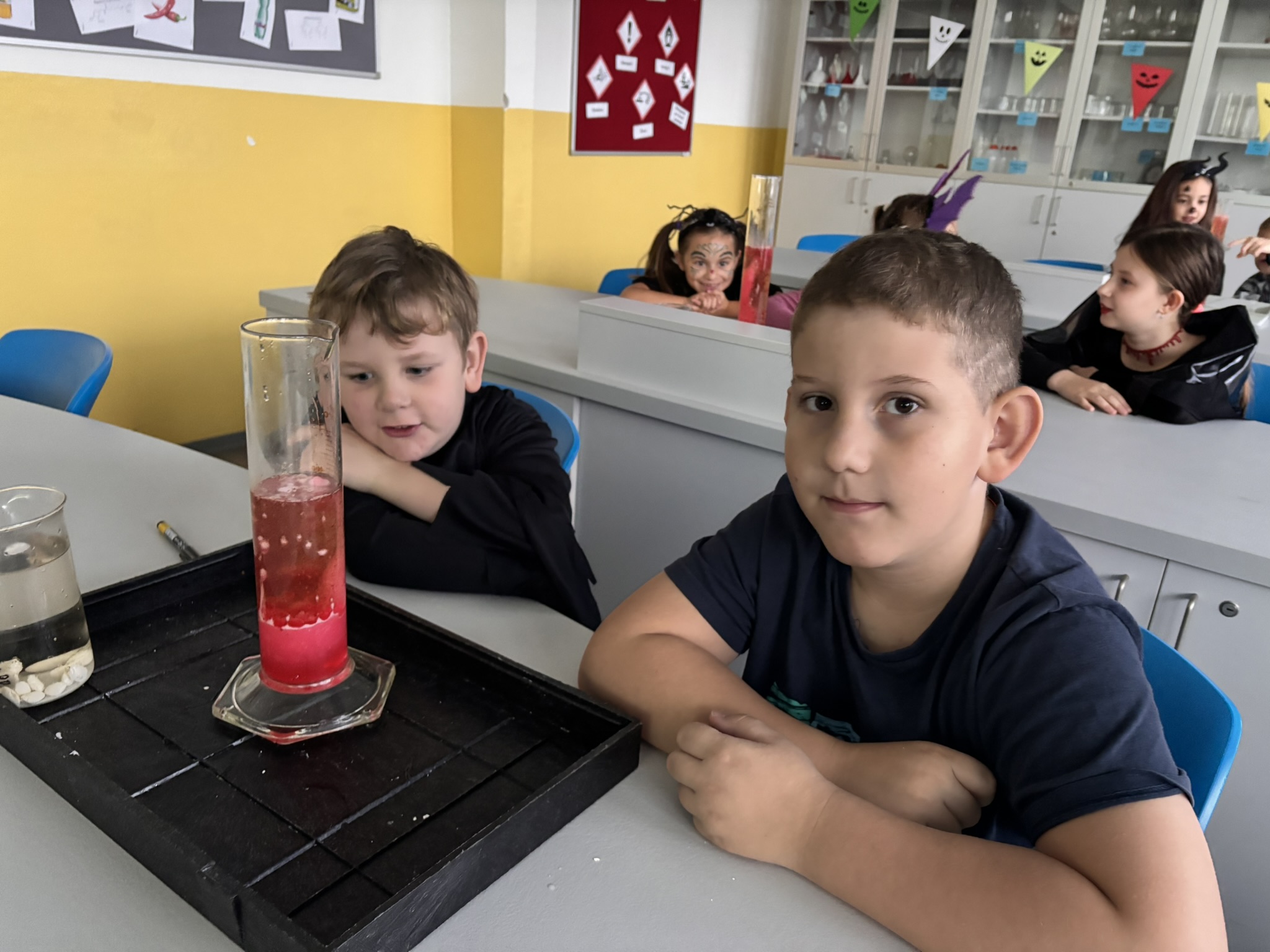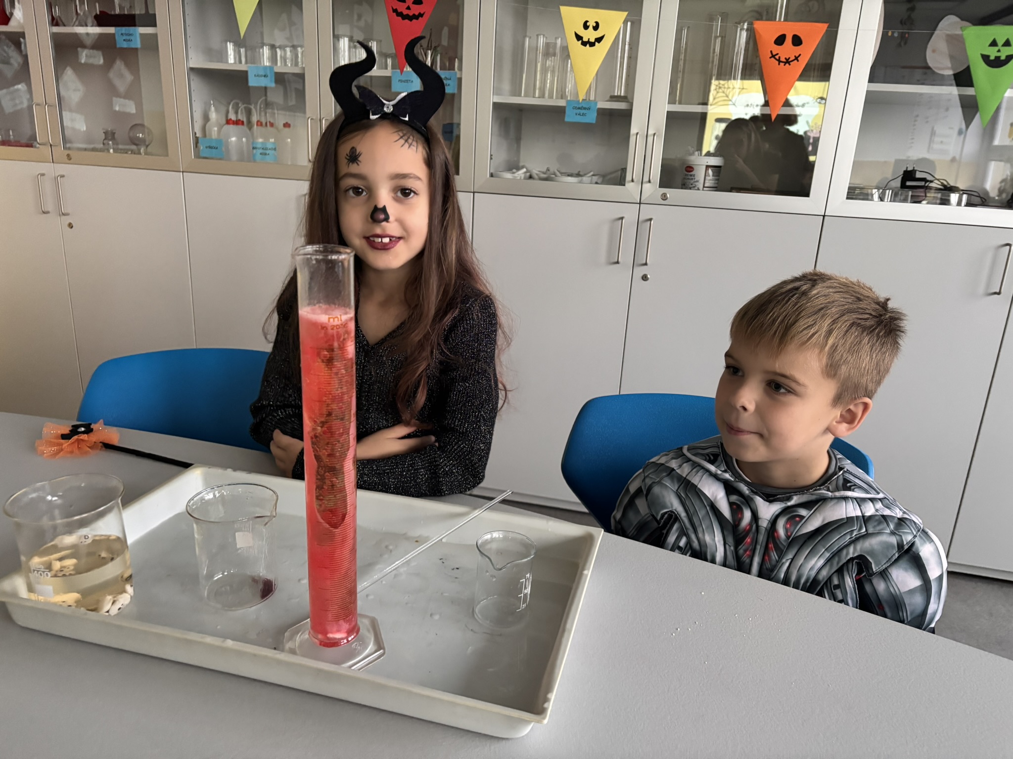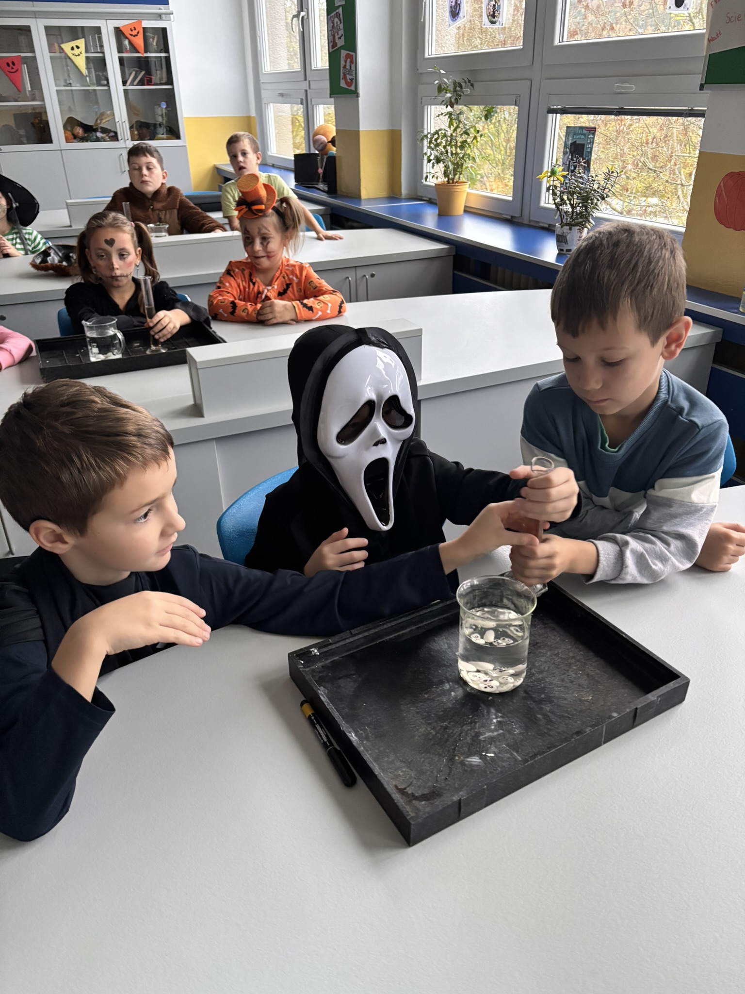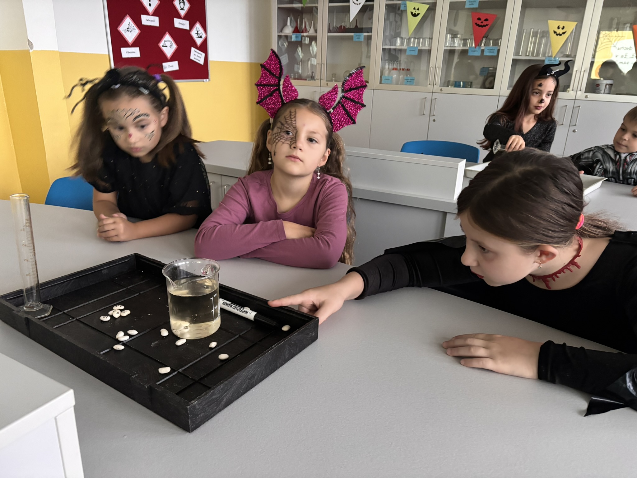 Tematické dopoledne jsme zahájili na 2.stupni v učebně fyziky, kde si děti pod vedením paní učitelky Jany Kozlovskyi zahrály na malé badatele. Vyzkoušely si kouzlo s bublajícími fazolemi, prokoukly tajemství tajemného obrázku a nakonec si vyzkoušely, jak vyrobit lávovou lampu.