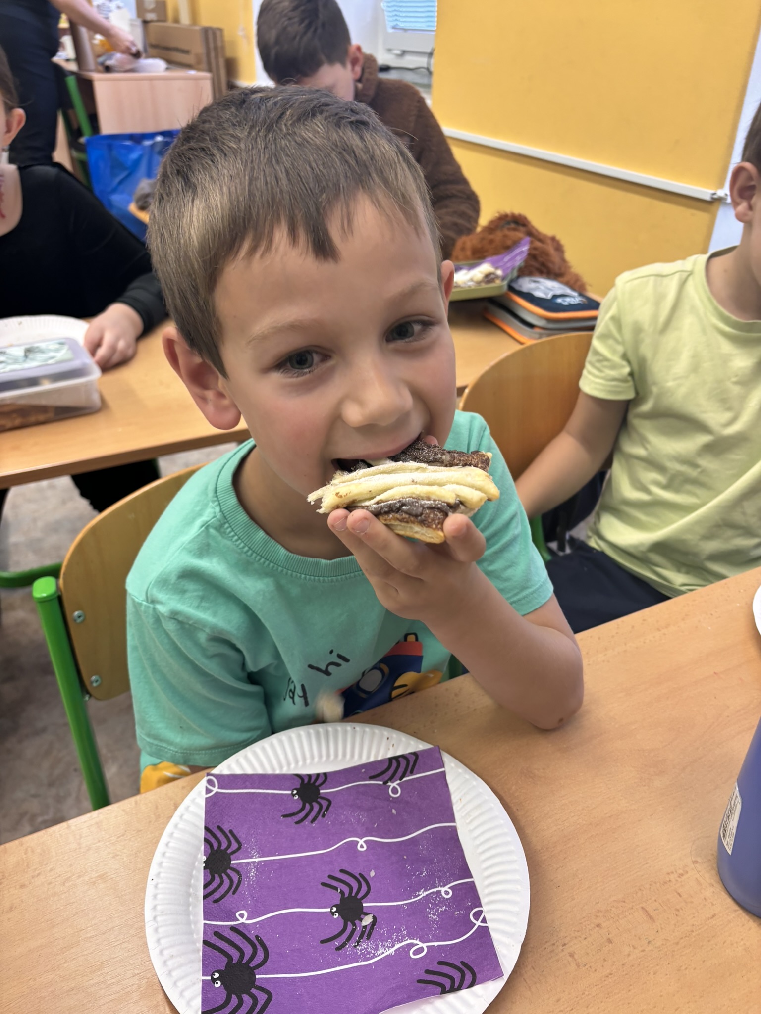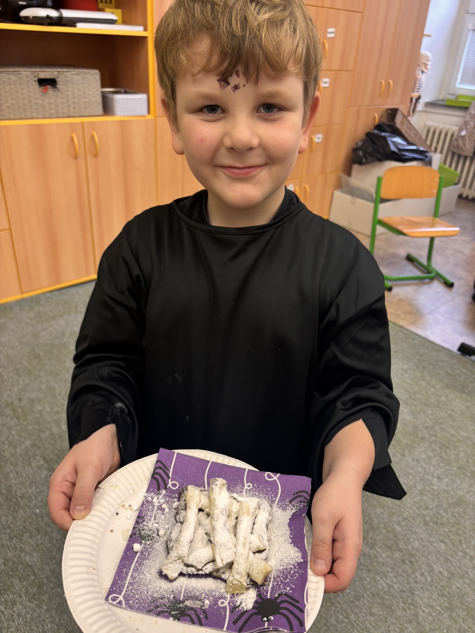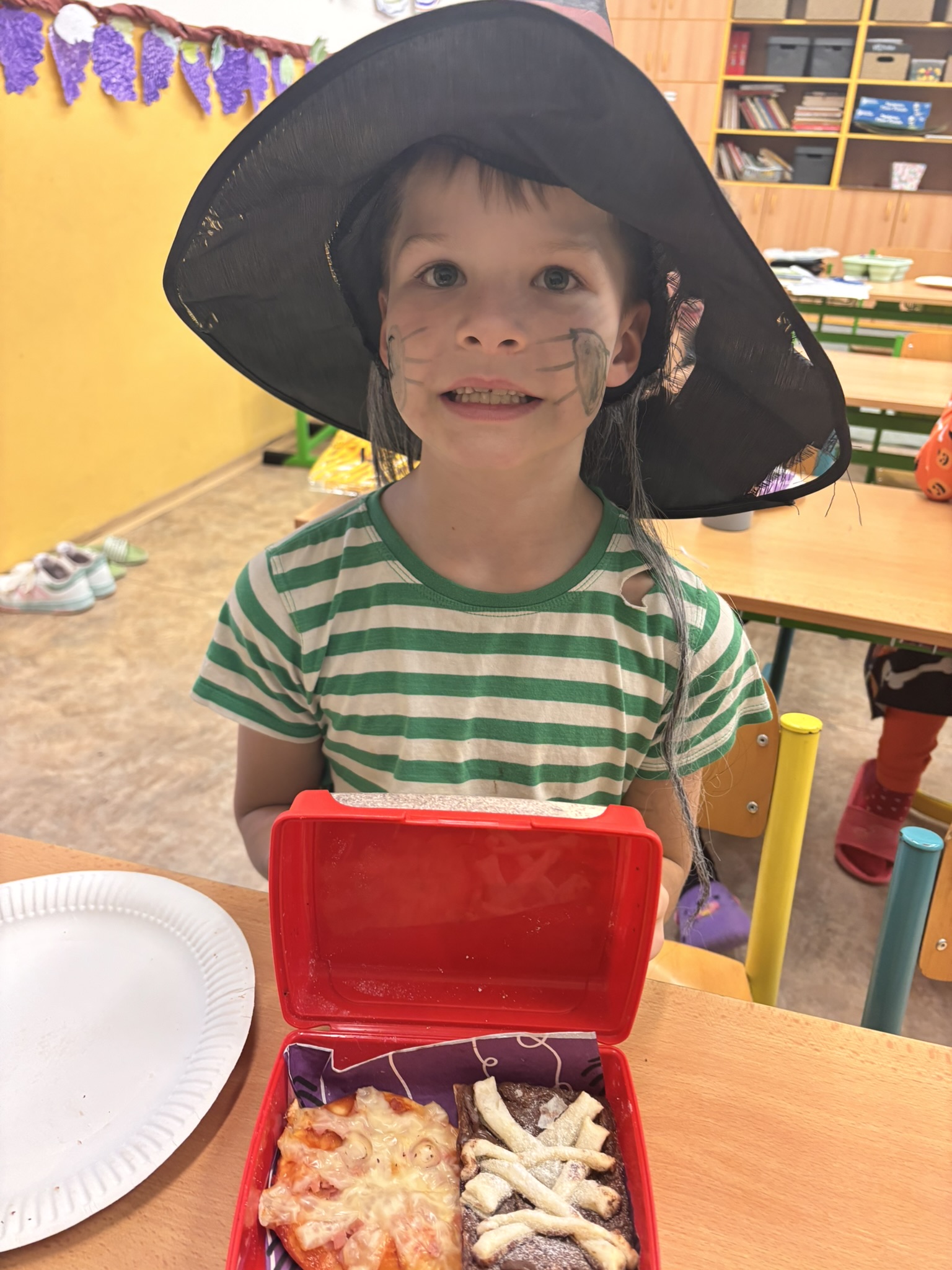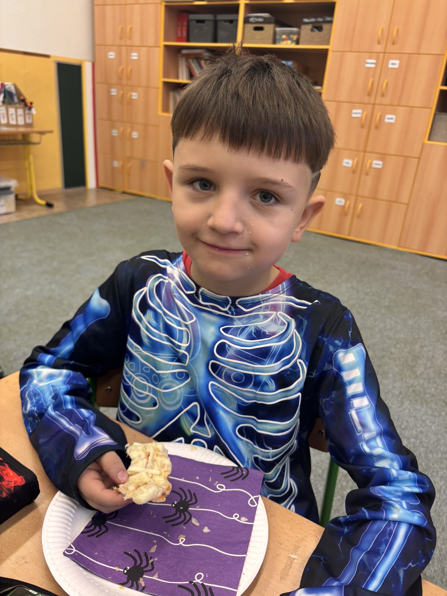 Z badatelů se děti rychle převtělily do kuchtíků a připravily si halloweenskou pizzu a nutelovou mumii. V kuchyňce si tyto dobroty daly do trouby a když se vše upeklo, tak to také dětem moc chutnalo.