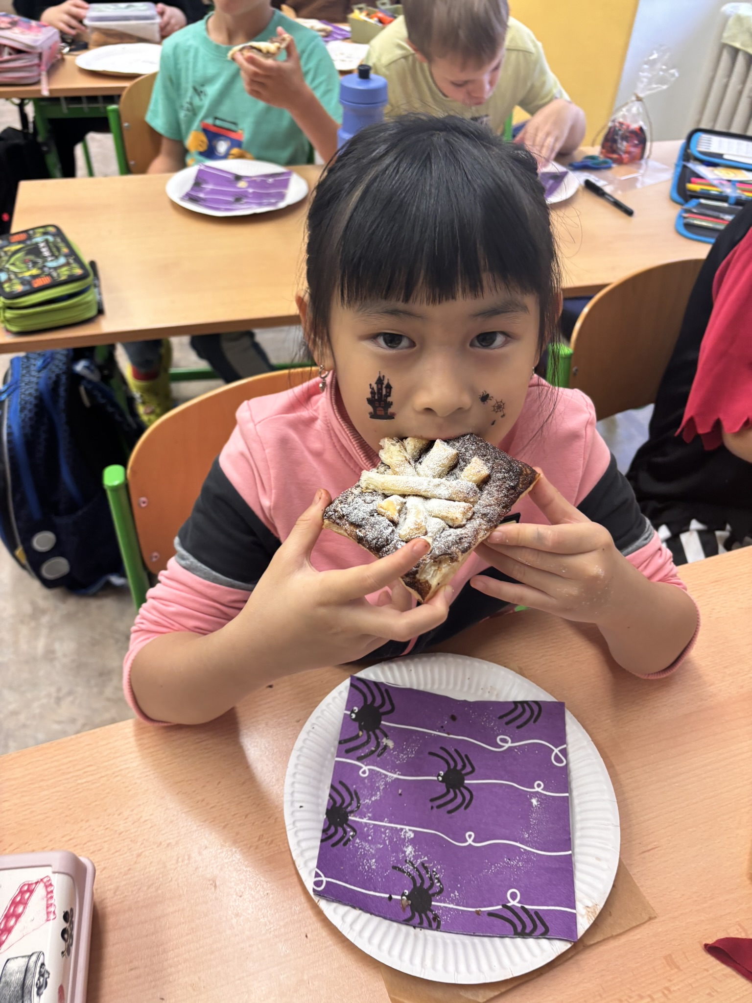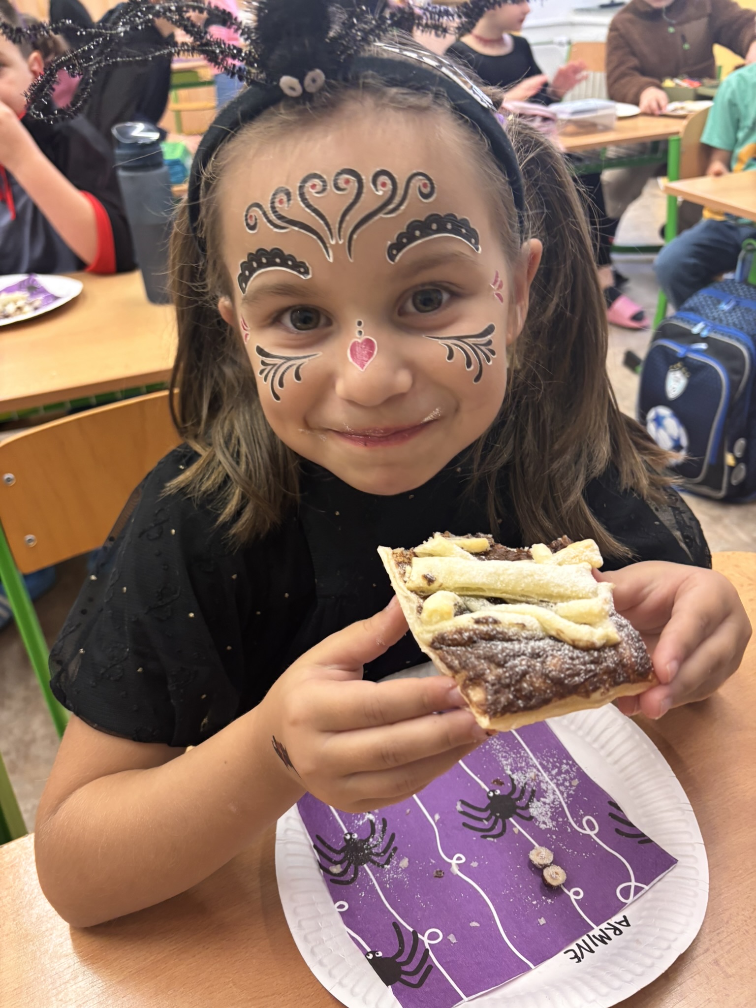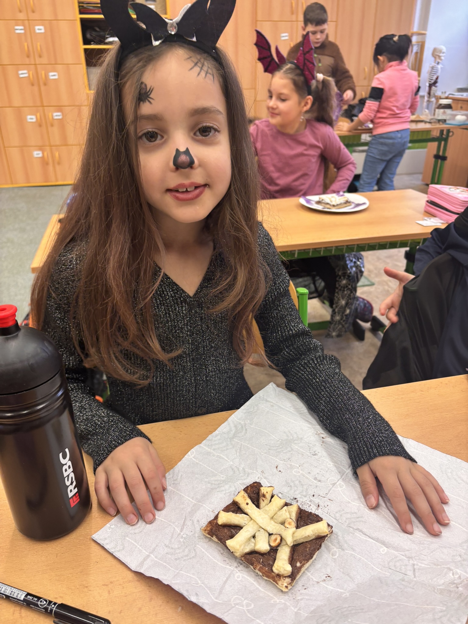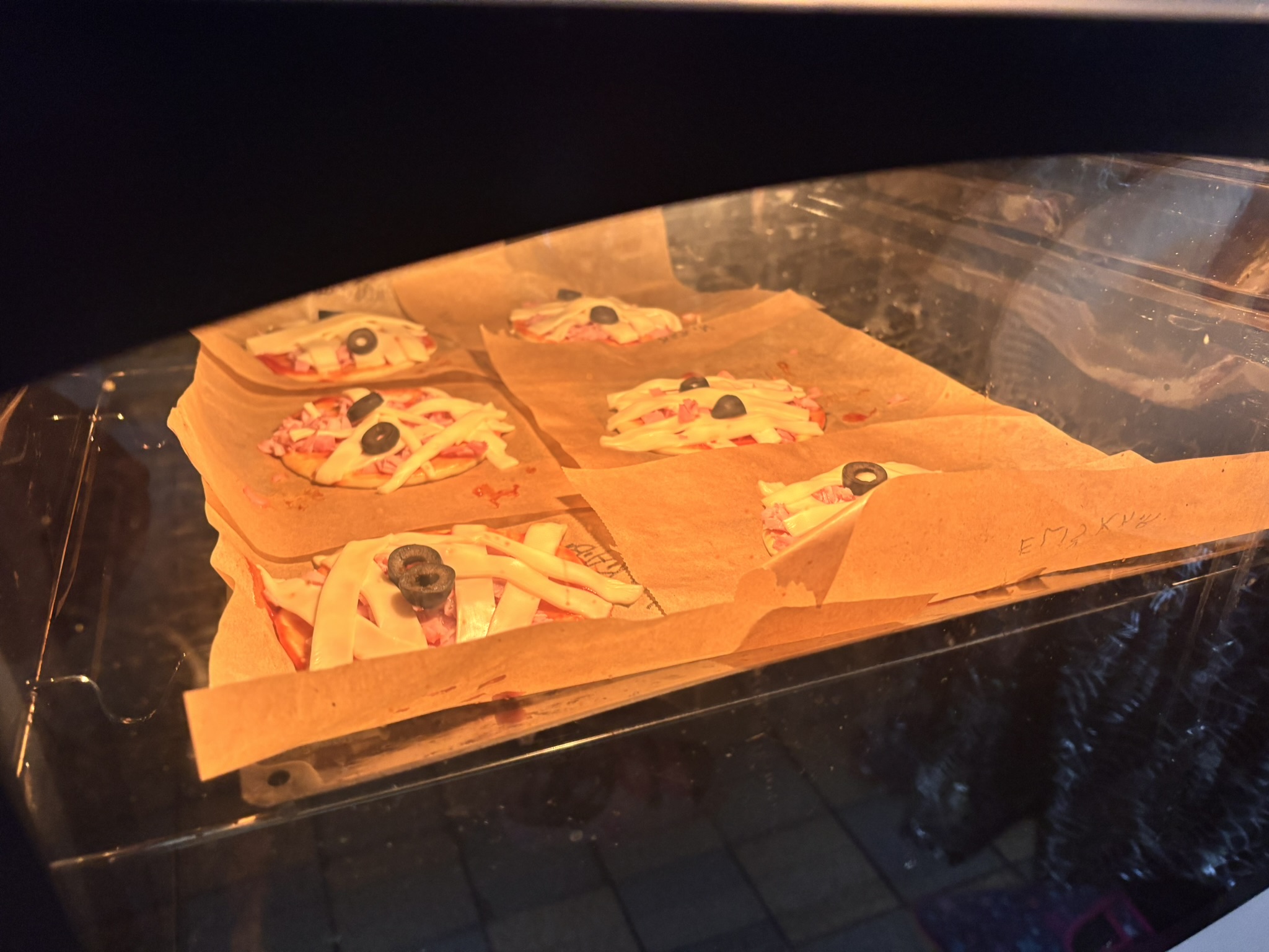 Z badatelů se děti rychle převtělily do kuchtíků a připravily si halloweenskou pizzu a nutelovou mumii. V kuchyňce si tyto dobroty daly do trouby a když se vše upeklo, tak to také dětem moc chutnalo.