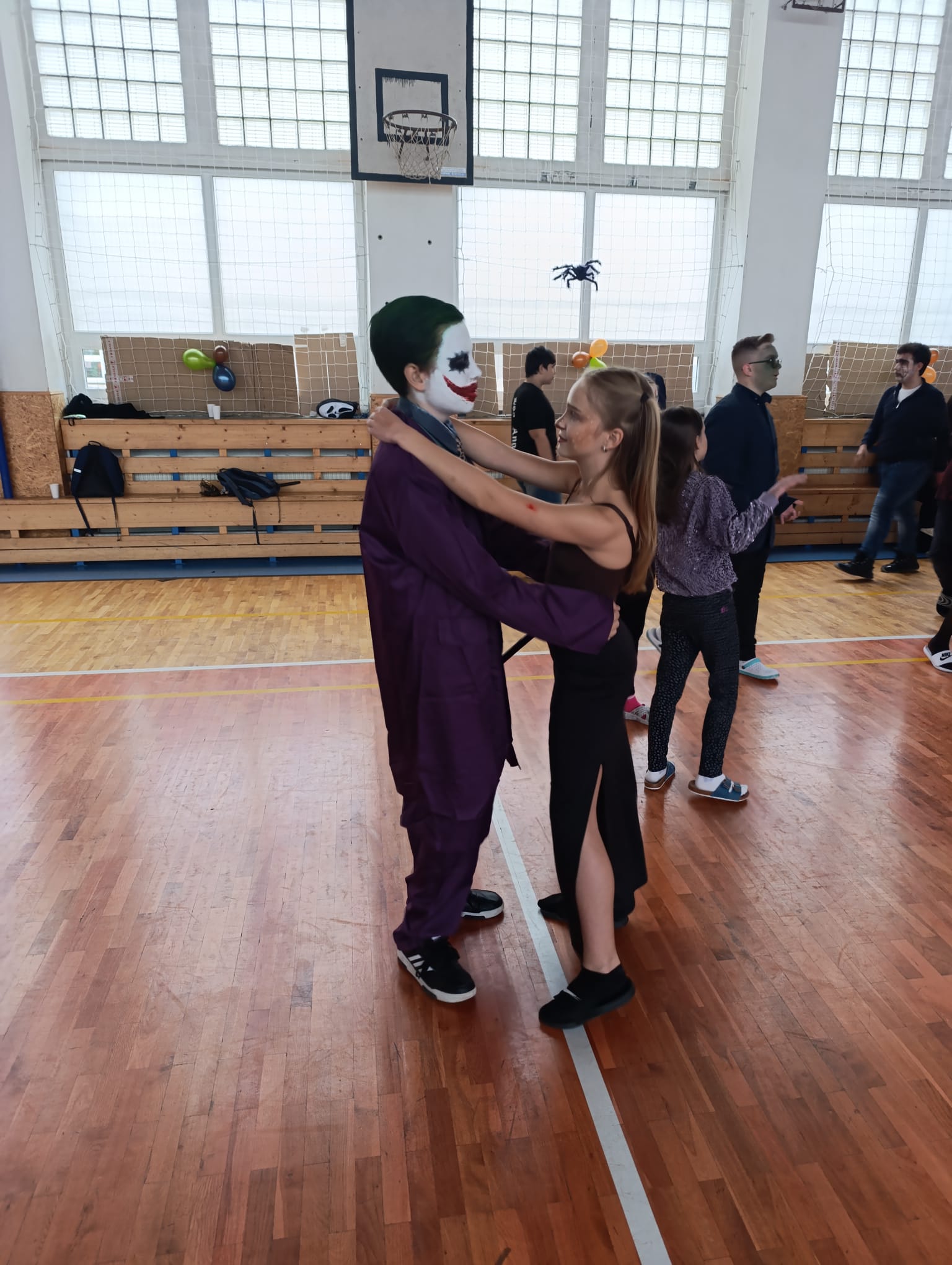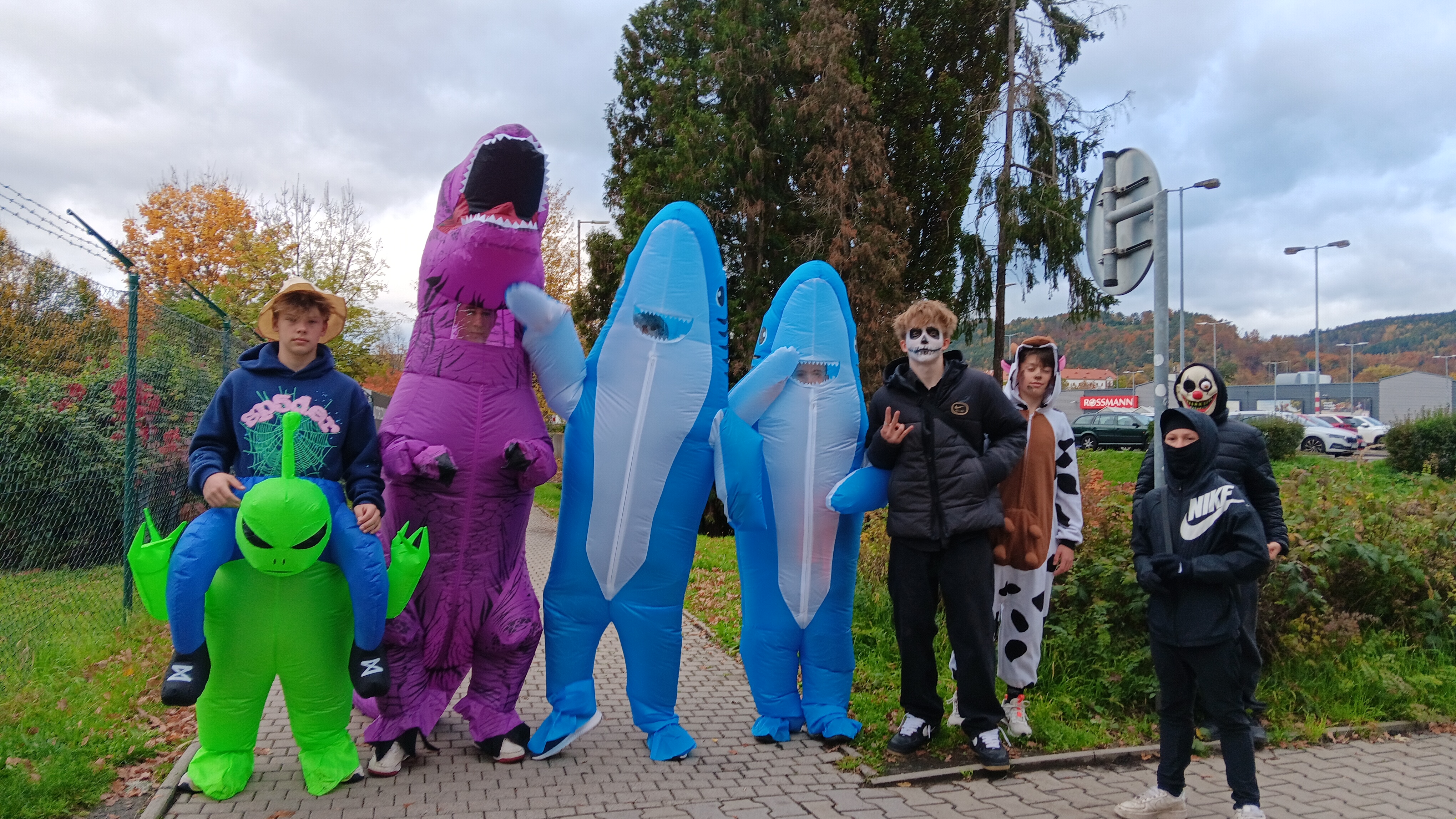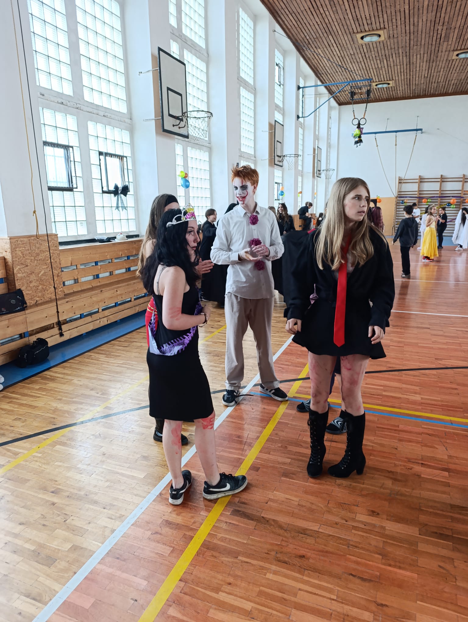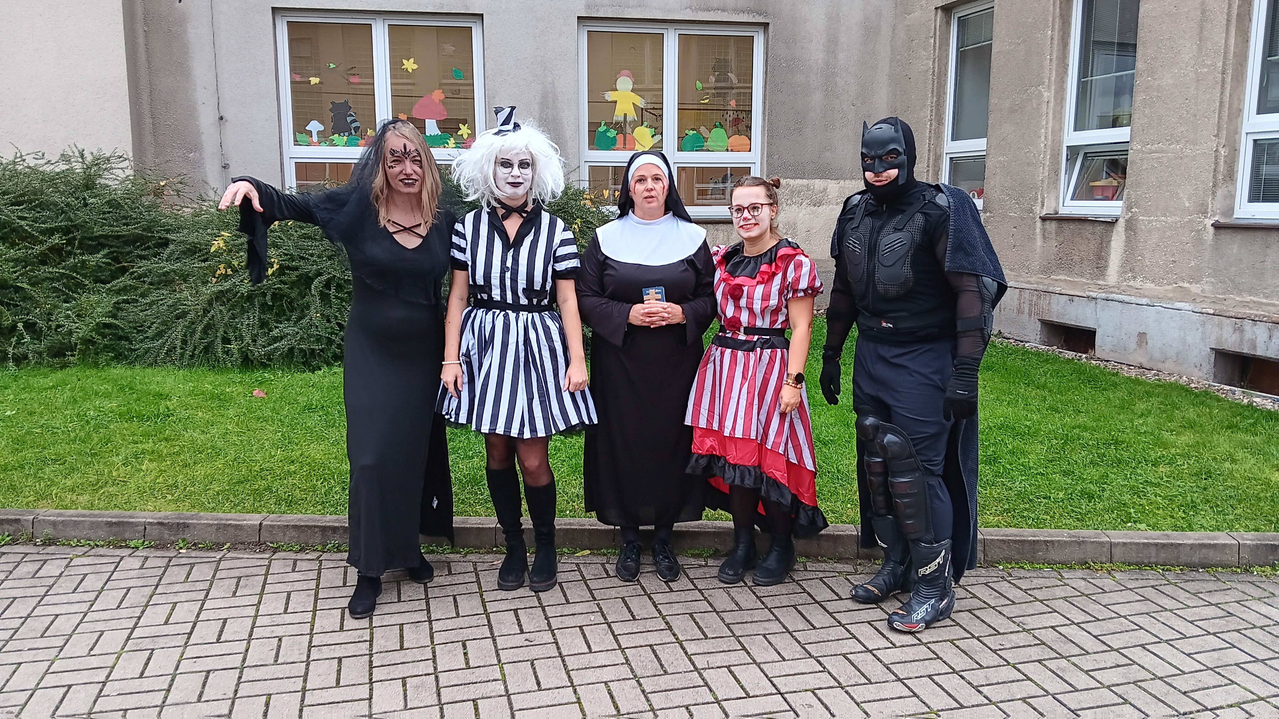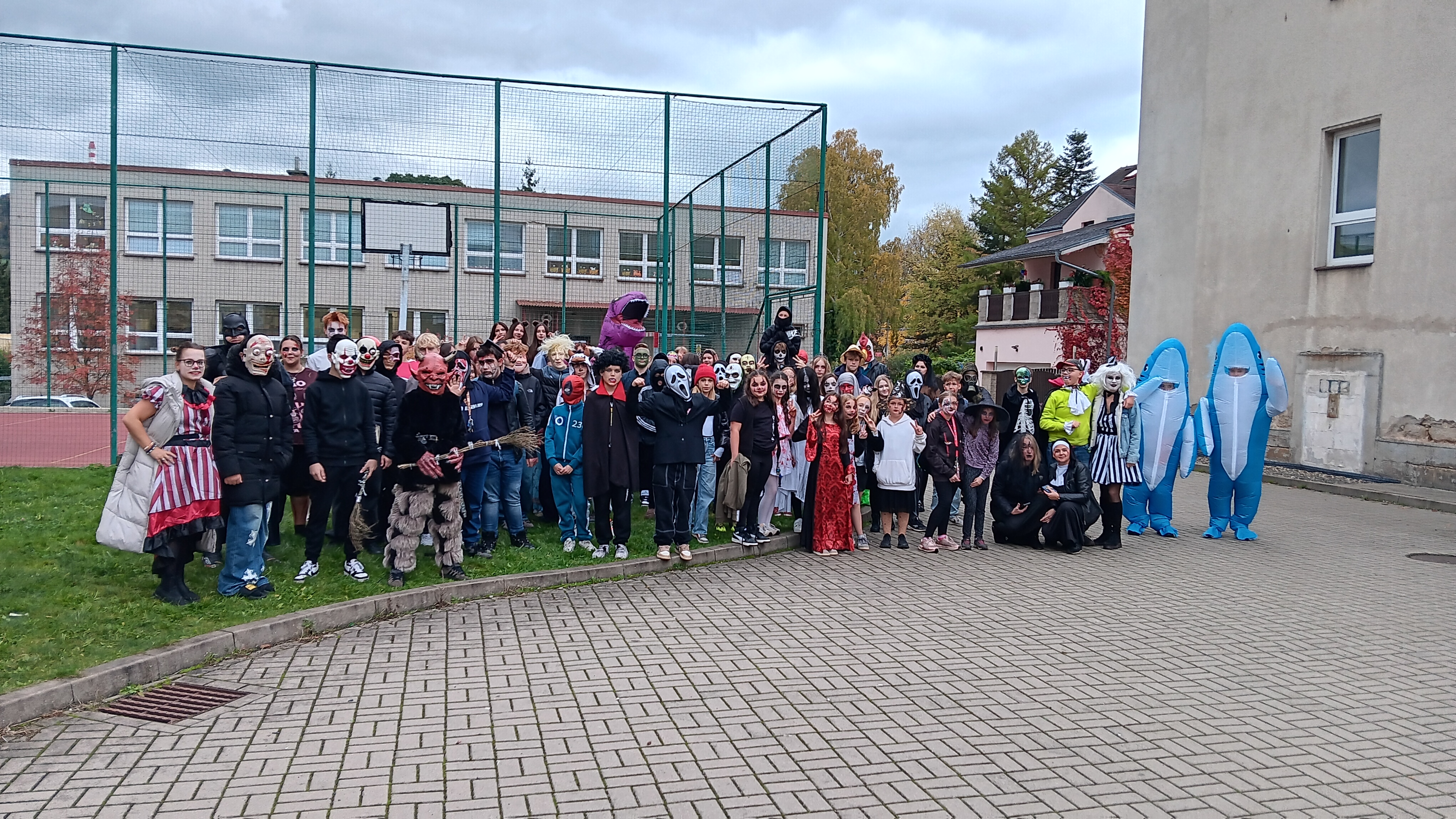 Účast každého žáka byla naprosto dobrovolná, jedinou podmínkou ke vstupu na tuto akci byl kostým. Byli jsme tak svědky různých strašidel, kostlivců, strašidelných klaunů. Na naši akci zavítaly smyslné tanečnice, pirátky, princezny…objevili se dokonce i dinosaurus s kamarády žraloky, 2 kečupy a svou návštěvou nás poctil také jedinečný a velký Joker.