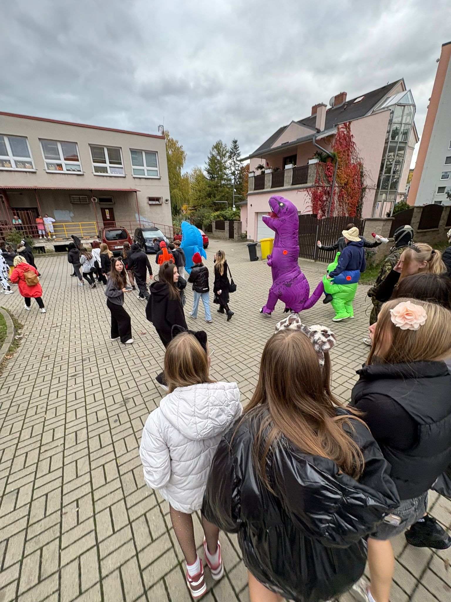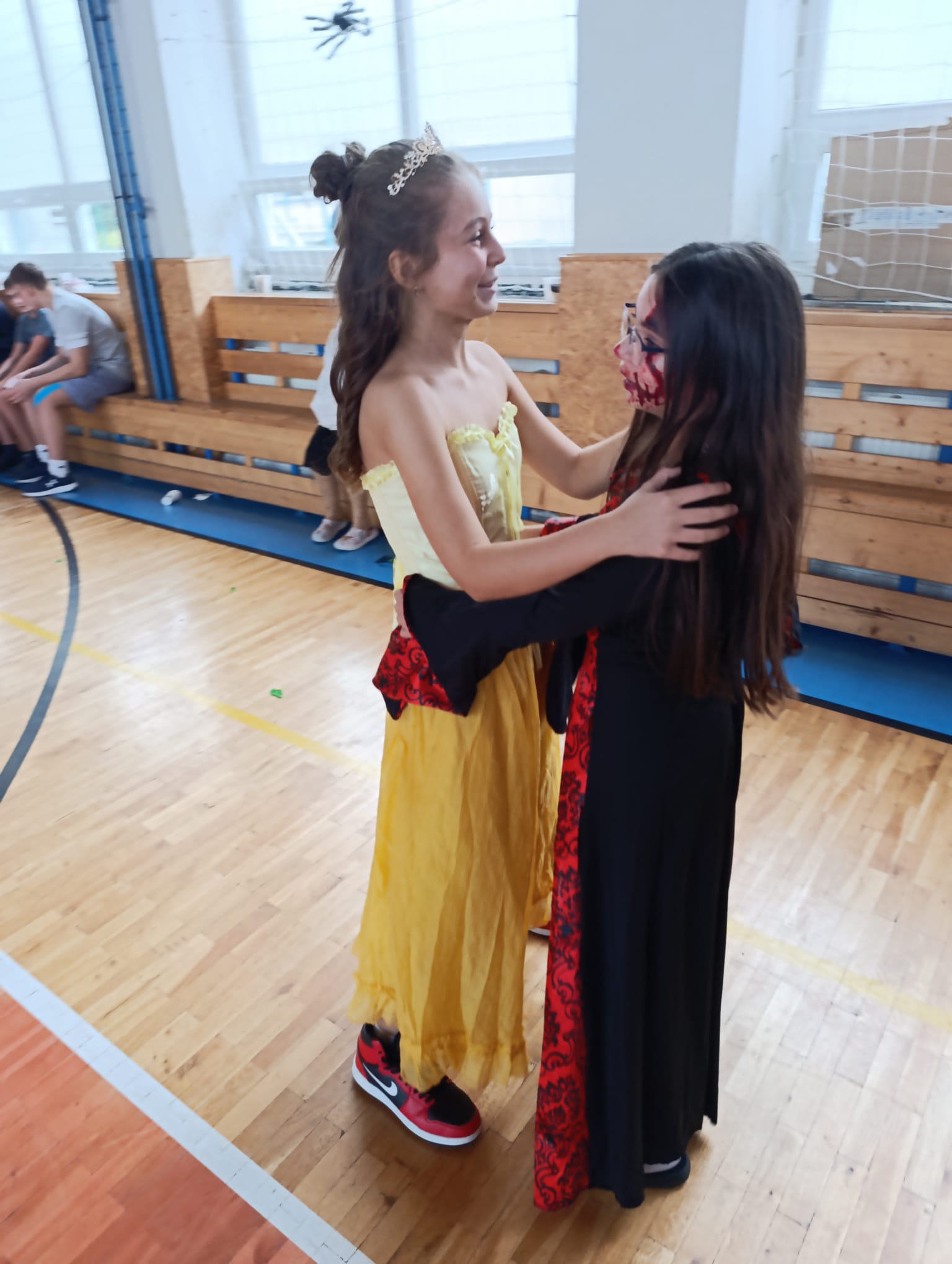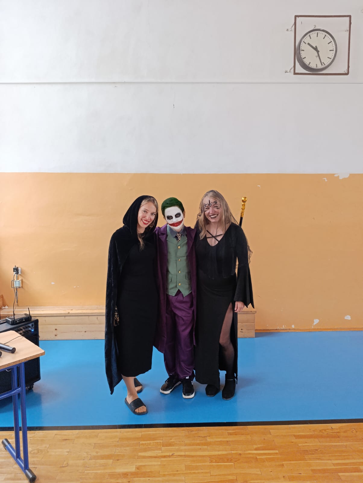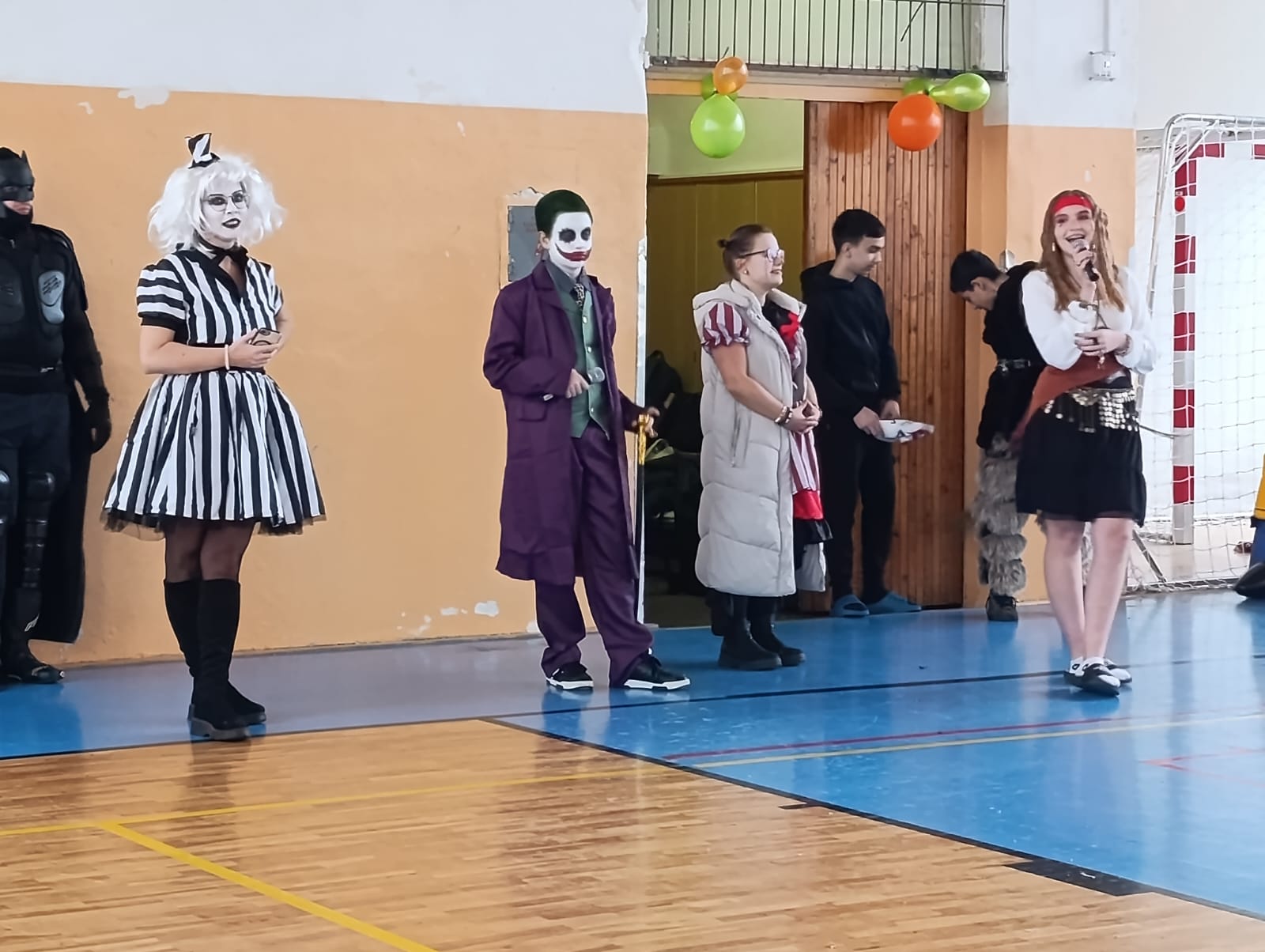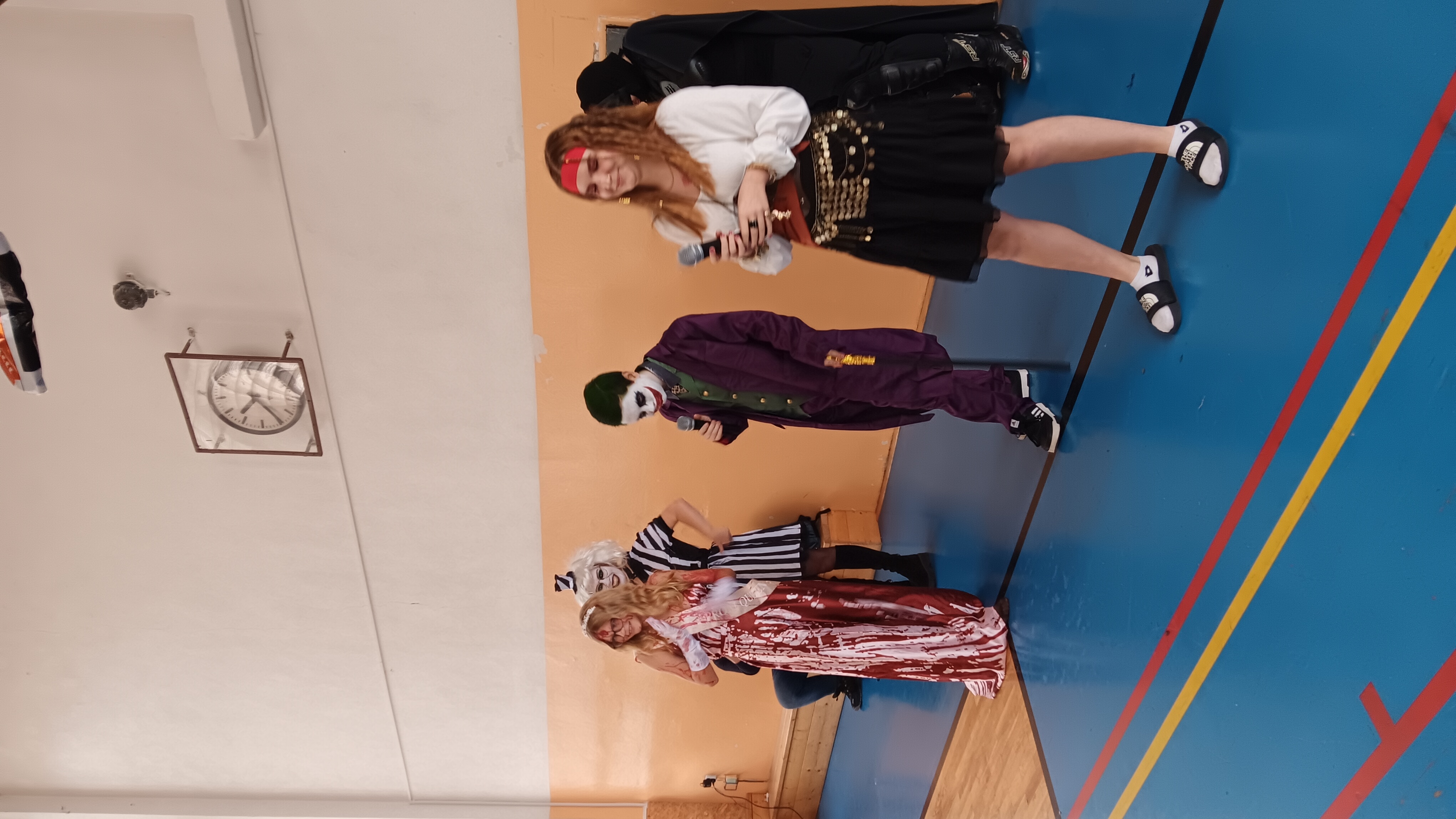 Účast každého žáka byla naprosto dobrovolná, jedinou podmínkou ke vstupu na tuto akci byl kostým. Byli jsme tak svědky různých strašidel, kostlivců, strašidelných klaunů. Na naši akci zavítaly smyslné tanečnice, pirátky, princezny…objevili se dokonce i dinosaurus s kamarády žraloky, 2 kečupy a svou návštěvou nás poctil také jedinečný a velký Joker.
