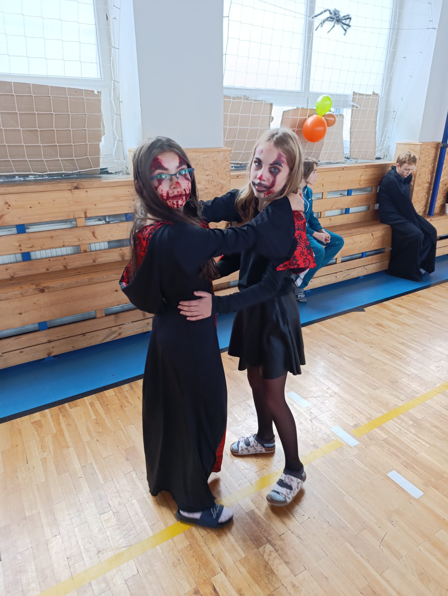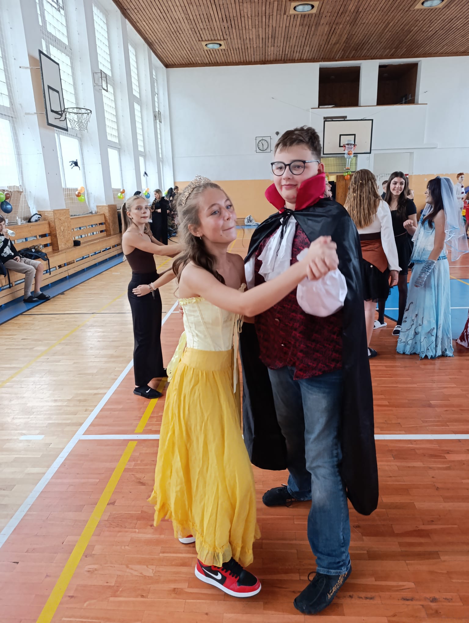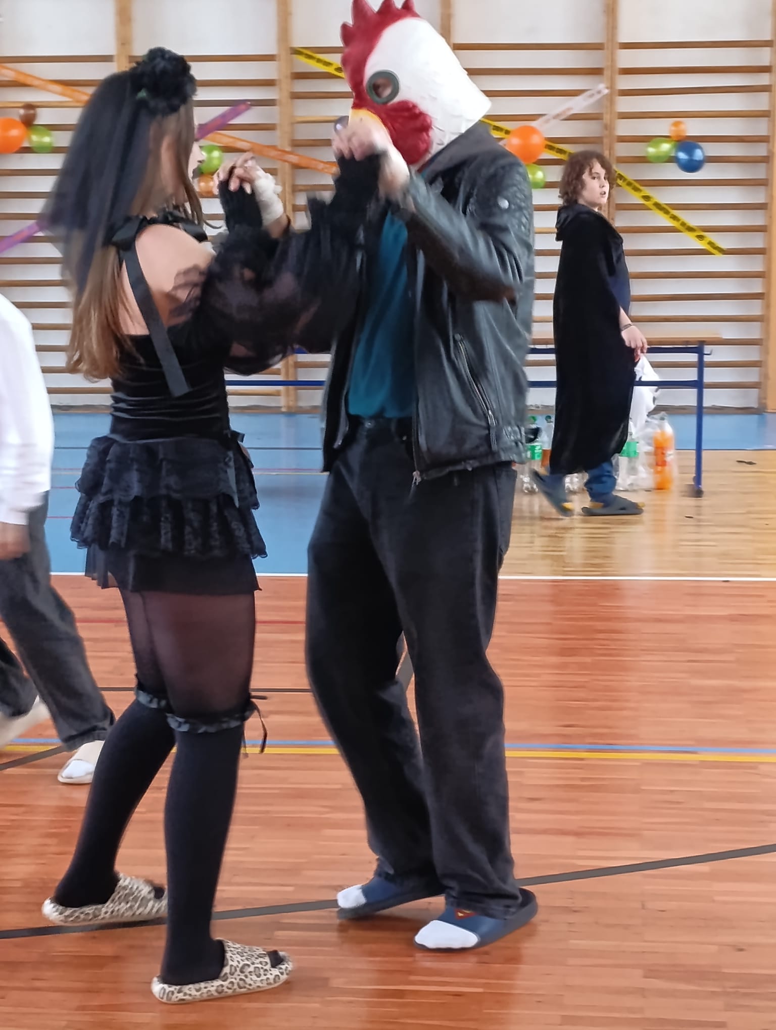 Po průvodu jsme se již přesunuli do školní tělocvičny, kde jsme si 2 hodiny užívali plnými doušky pořádnou halloweenskou párty. Nejeden kostým se propotil pořádnými tanečními kreacemi.