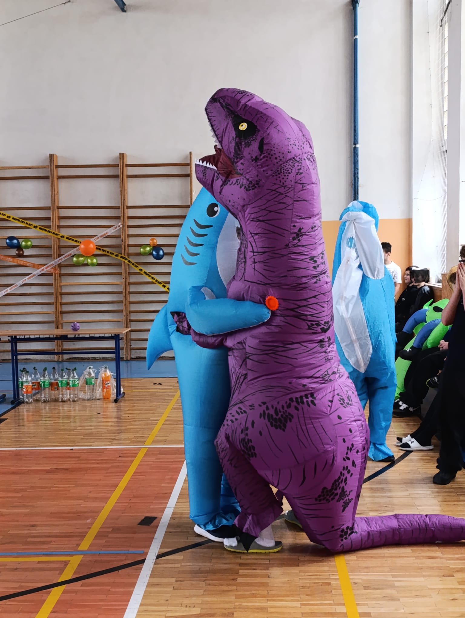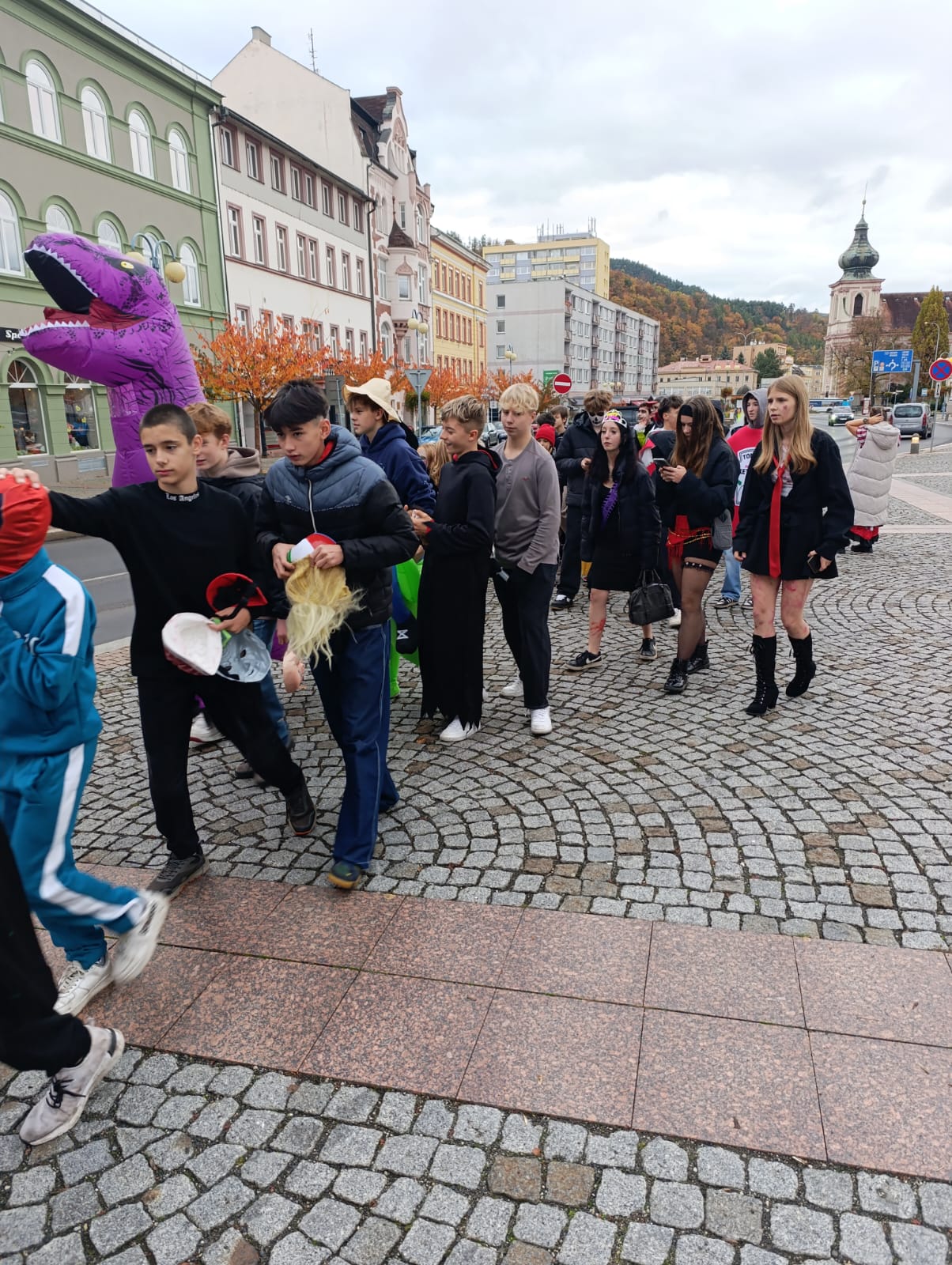 Celá akce začala průvodem po městě, prošli jsme se ke Gymnáziu Děčín, kolem Maroldovky a přes náměstí zpátky ke škole. U některých obyvatel města, které jsme během průvodu míjeli, se objevoval úsměv na tvářích, u některých trošku šokovaný výraz, cože se to vlastně děje. Malé děti, které jsme potkávali, byly nejvíc paf z našeho dinosaura a ze žraloků.