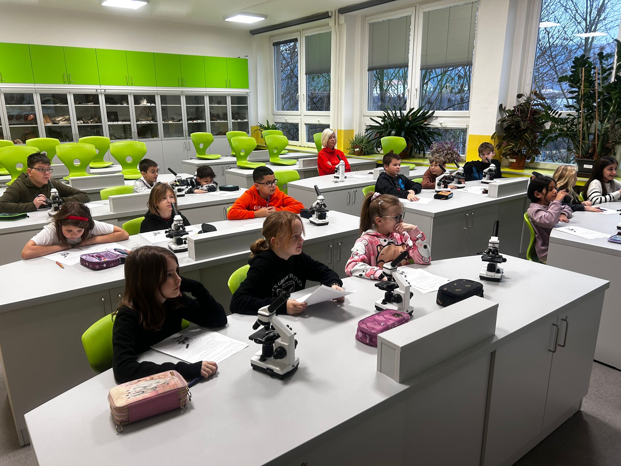 Pan učitel Bartoň měl pro žáky připravenou laboratorní práci s využitím mikroskopů. Děti si tak vyzkoušely to, co je bude za pár let čekat na druhém stupni. Laboratorní práce s mikroskopem jsou totiž velmi častými aktivitami, které pan učitel do výuky zařazuje.